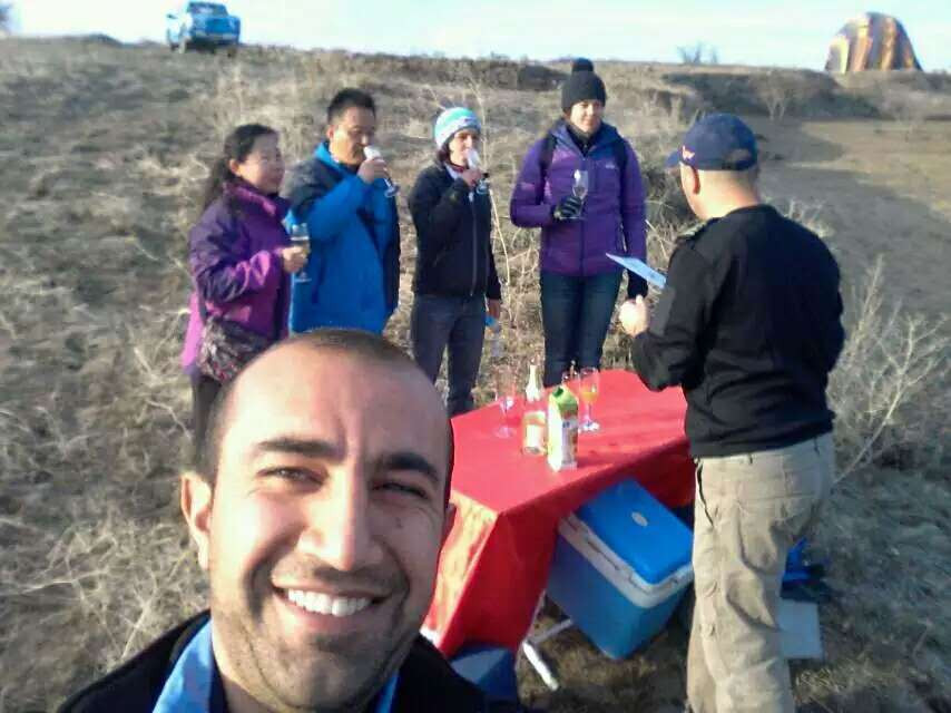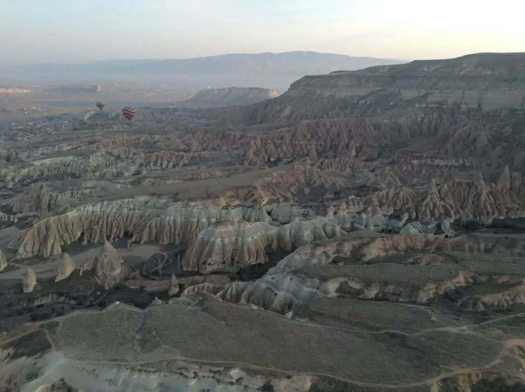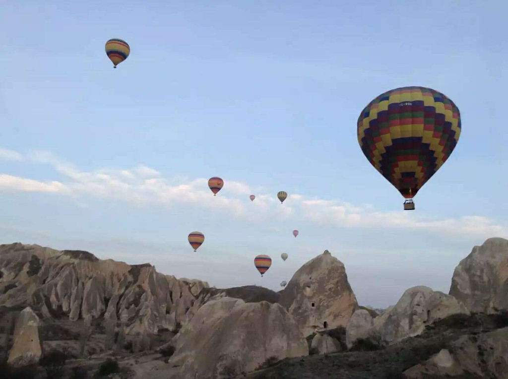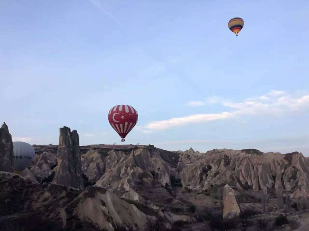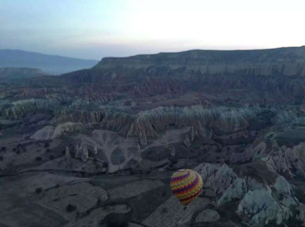令人惊叹的热气球之旅,终生难忘的经历!我们时而在七百多米高空盘旋,俯瞰状如月球表面的地貌。时而在山谷延岩石穿梭,近观不同色彩的山谷。六百万年火山灰形成的杰作,感叹大自然的鬼斧神工!今天天气格外晴朗,驾驶员塞义夫是前土耳其空军飞行员出生,驾驶热气球技术高超,既能飞到很高的高度,又能贴近地面飞行,最绝的是一次性直接软着落在拖车上。他为人特幽默。问我们是不是第一次坐热气球。当我们回答是时,他笑道他也是。其实他驾驶热气球八年,二千四百多次,零事故!他还说他气球的小名叫泰坦尼克!他的风趣一下子缓解了一点点的紧张气氛!同坐气球的二𠆤瑞士女孩略显拘谨!按传统我们降落后塞义夫开了瓶香槟,酒喷在我们身上祝福我们今后幸运。并且还给我们颁发了证书。难怪美国国家地理杂志把这儿热气球之旅评为世界十大激动人心之旅,与地球北极之旅,西藏珠峰之旅齐名!名符其实!