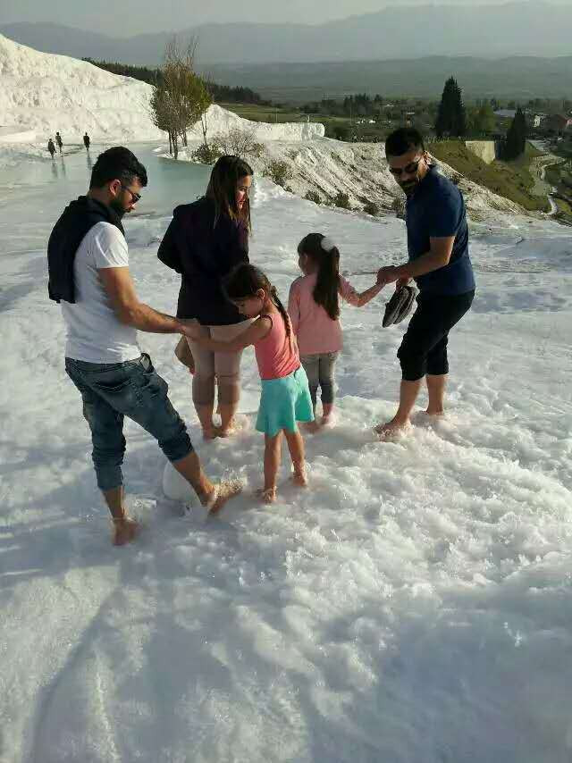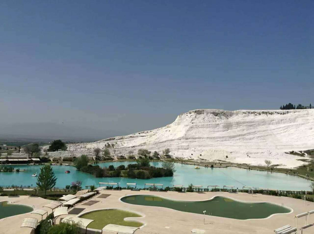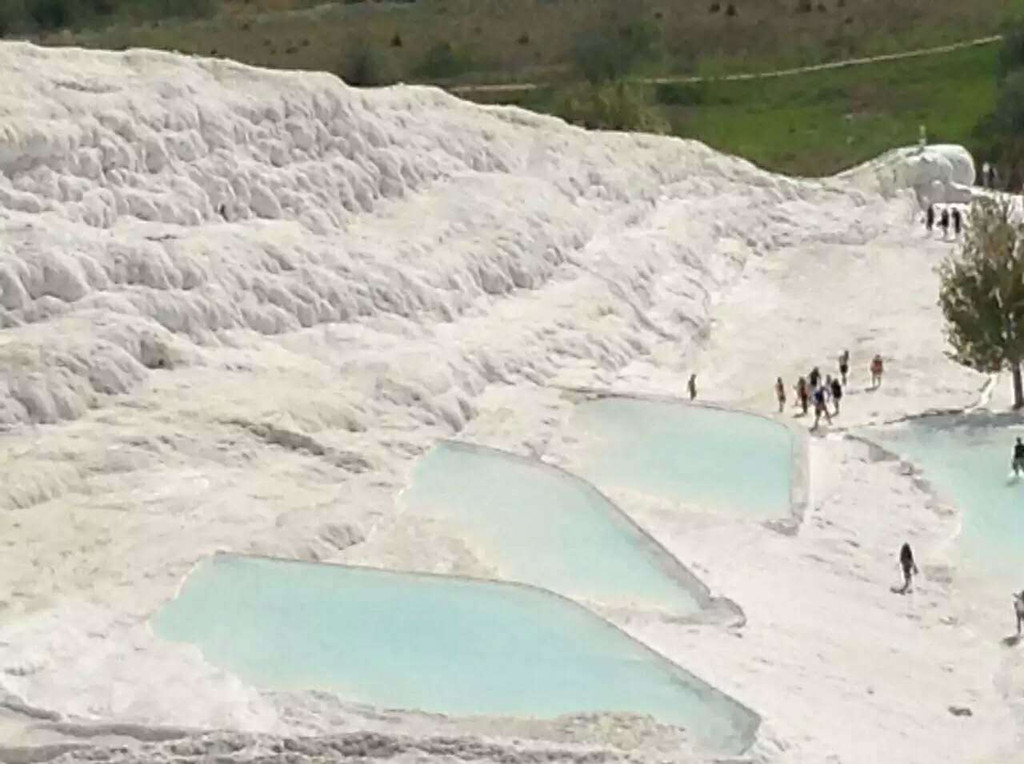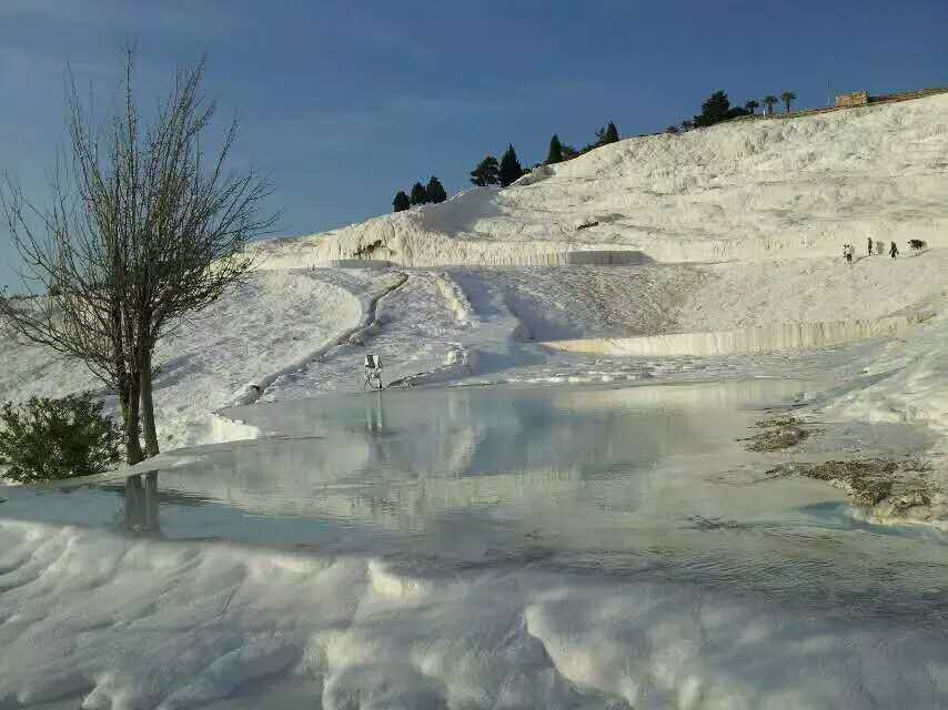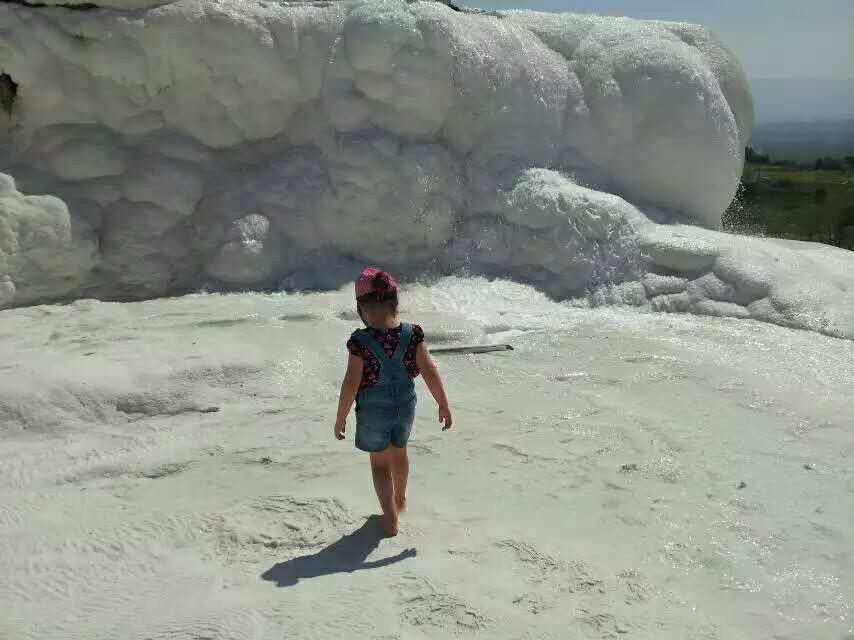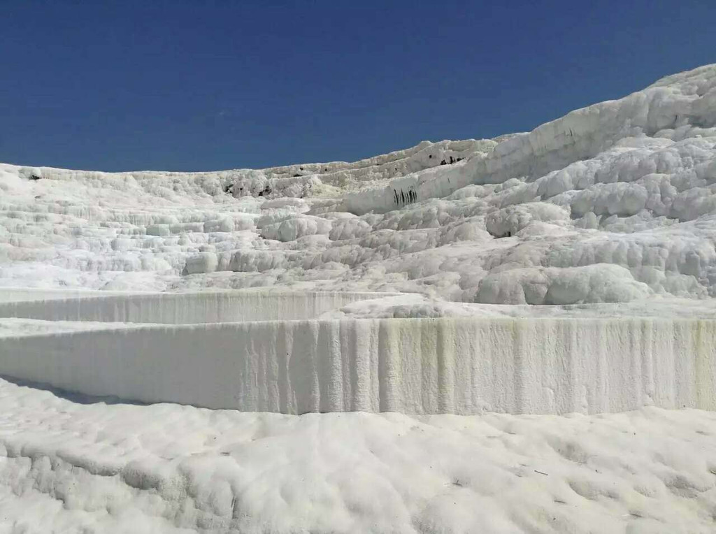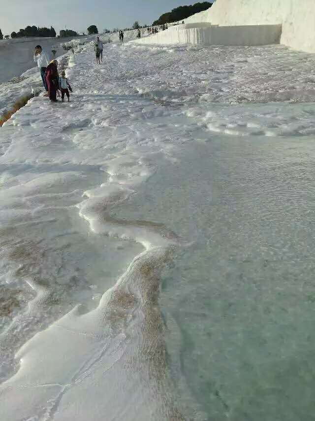 土耳其棉花堡,由于地热温泉钙化作用,整个山洁白如棉,故得名。虽然有气势,也有一些钙化池里有碧水,但我们看过黃龙,并不觉得震撼。但与九寨黄龙不同,人们可以光脚戏水,甚至可以直接露天在池中泡温泉。这严重破坏了生态。很多地方变黄,很多池里没水。再不大力保护,这个人类共有的世界遗产很快就会消失!山顶上有很多公元前古罗马时代的遗址,比如古剧场,古浴室。看来这个地方很久前就被古罗马贵族当作休闲胜地了!