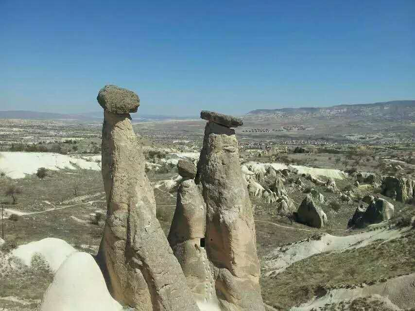 今天一睹三千九百多米的火山芳容。远看白雪覆盖,有点像日本的富士山。正因为这座火山和附近另一座火山的爆发,造就了这里特有的山石地貌。跟团看了白谷,玫瑰谷和爱之谷。酒店老板塞义夫昨天主动提出开车带我们到山谷转转。他当过兵,外表冷峻,但内心十分热情,风趣幽默!路上遇到二个土耳其学生,英语不是很好,问他们毕业后是否想做老板,死活没听懂英语老板这个词,看来他们这辈子做老板玄了!