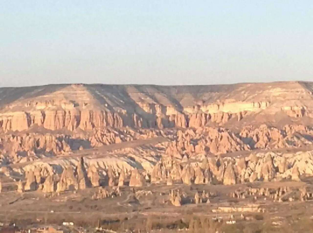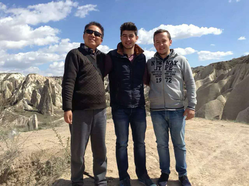 夕阳西下,在酒店观景平台望去,山色金黄透红,蓝天白云,远方三千七九百多米雪山隐约可见。各种如塔似笋的石林高耸突兀,有些石柱石锥里也隐藏洞穴。真感叹大自然的鬼斧神工!酒店老板塞义夫是热气球驾驶员,为人热情友善,英语流利,风趣幽默。他说土耳其算这里最安全。他是前空军飞行员,跟他在一起,还躲在洞里,世界上没有比这更安全的了!店小二哈桑也热情好客,他二十岁,在大学上旅游专业,懂七国语,当然英语讲得也不错。可惜孩子命苦,小小年纪就失去了父亲。孩子学习认真,一边工作,一边复习,准备本周的二门考试。看来无论在哪里,穷人的孩子早当家。他除了上课,其余时间都在酒店。明天我们早餐也是他做!很喜欢这样的孩子,我们临走会给相当的小费给他!看到这样的孩子就自然想到我自己,自幼无依无靠,全凭自己拼搏才有今天。相信哈桑一定比我有更辉煌的未来!他还想再学一门外语。在汉语和日语之间纠结。我强烈建议他学中文。希望他能听得进去