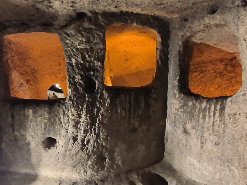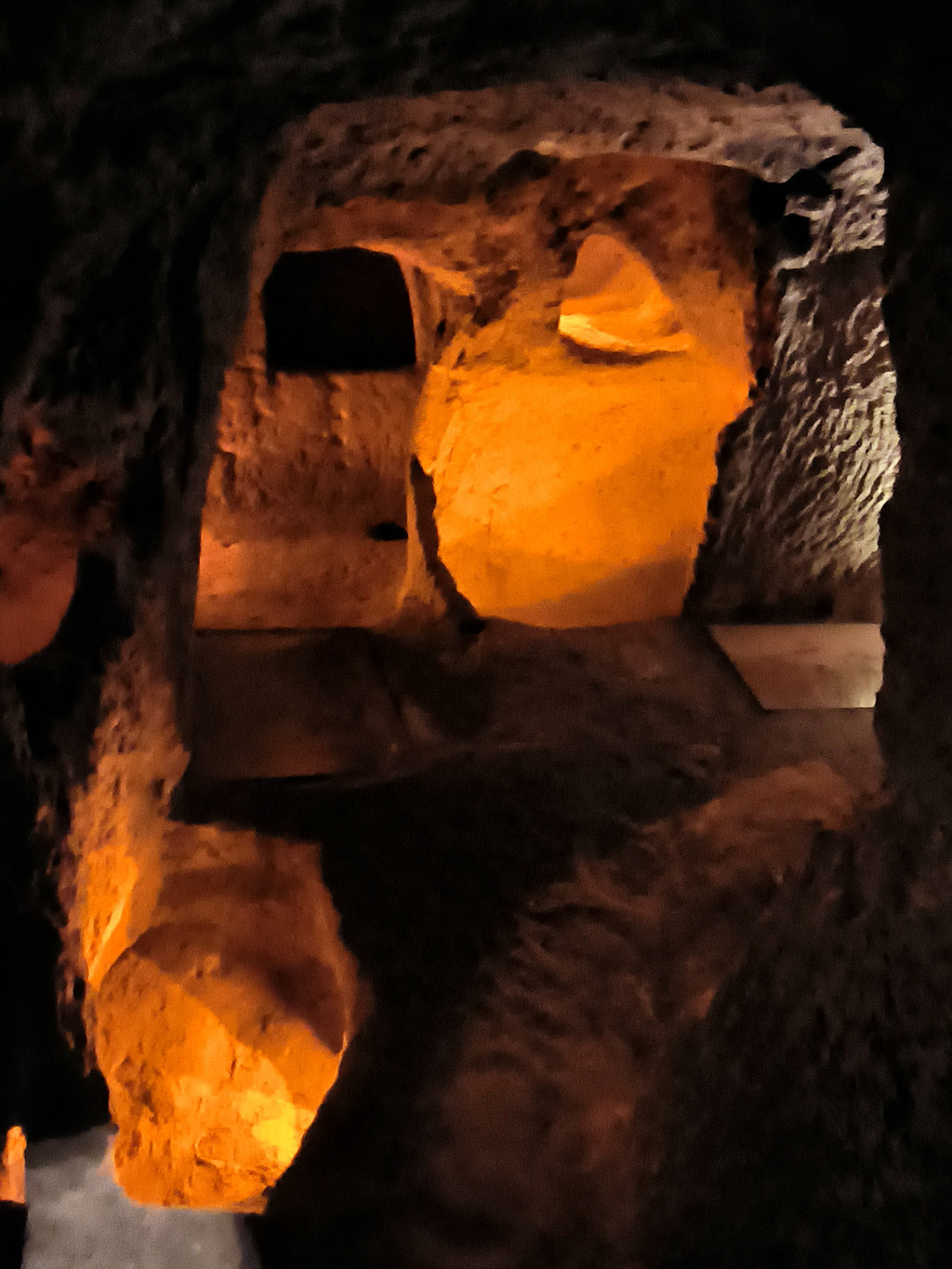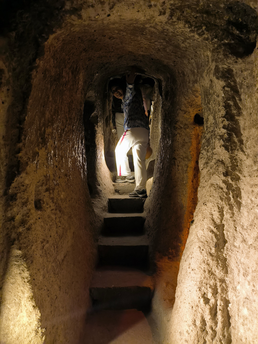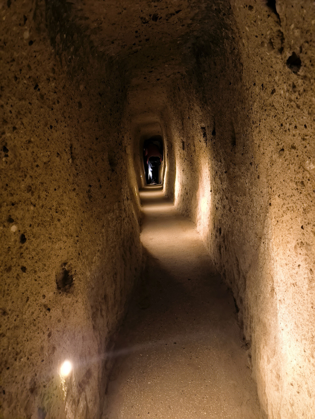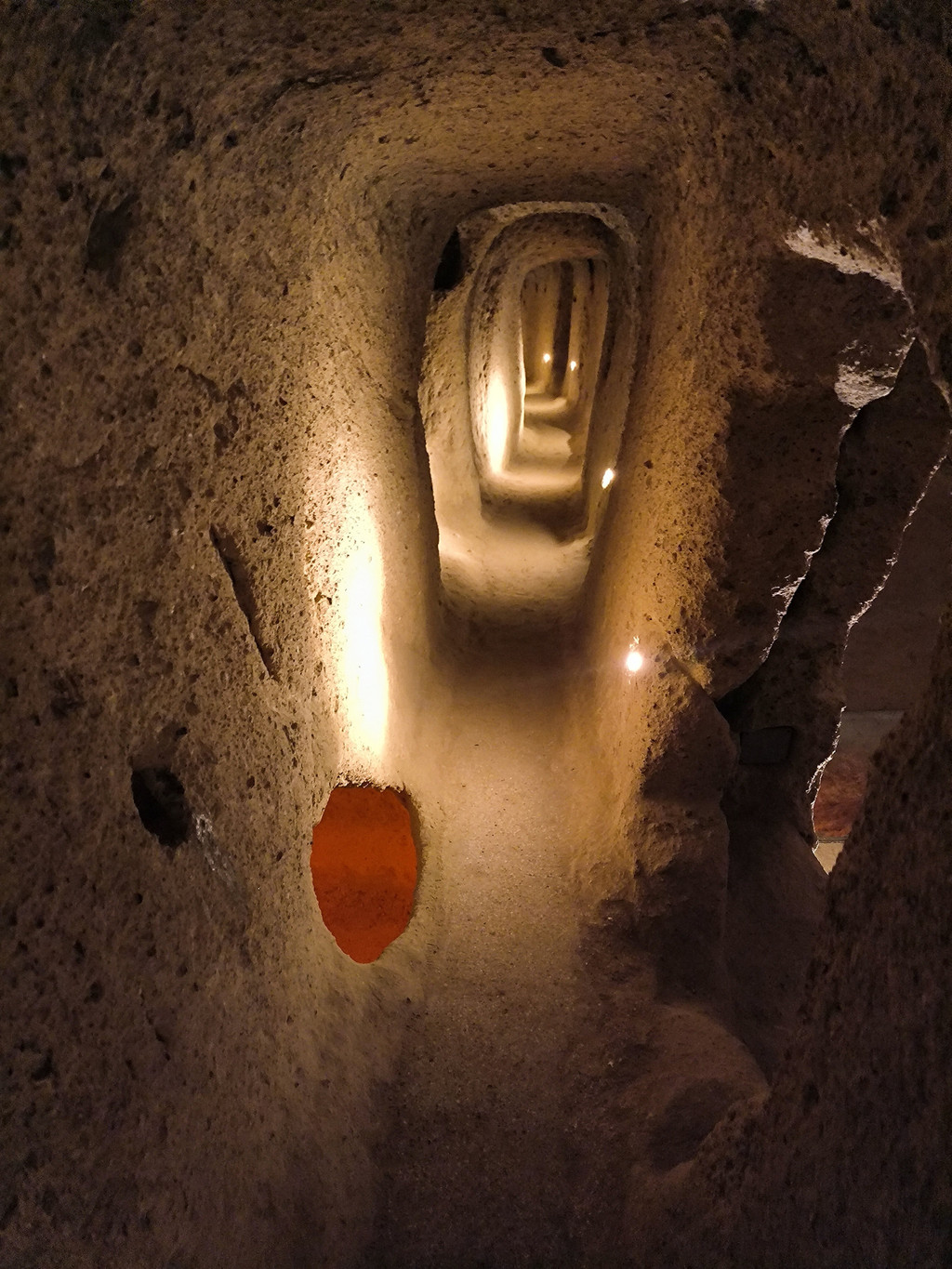 以迷宫一般的隧道而著称,多达8层,深达110米,规模宏大,共有1200间房子,可居住1万多人,不仅有卧室、厨房等生活区域,还有学校、酒窖、教堂等公共场所,各种设施一应俱全,还有完善的通风系统,目前只有上4层对游客开放。地下城的入口一般都很隐蔽,隐藏在村子各处的房屋下面,我们经过盘旋的石梯进入地下,沿着又低又窄的地道下行,大部分只可勉强供一人通过,迂回曲折,纵横交错,很容易迷路,洞壁上会标有红色和蓝色的箭头,顺着一种颜色的箭头走即可,但有些地方只能弯着腰或蹲着前进,我不由得想起了国内的冀中地道战。