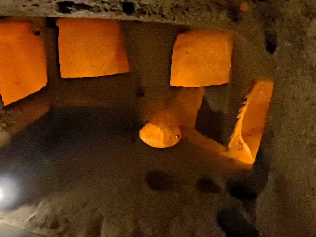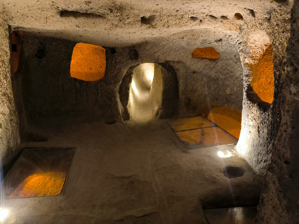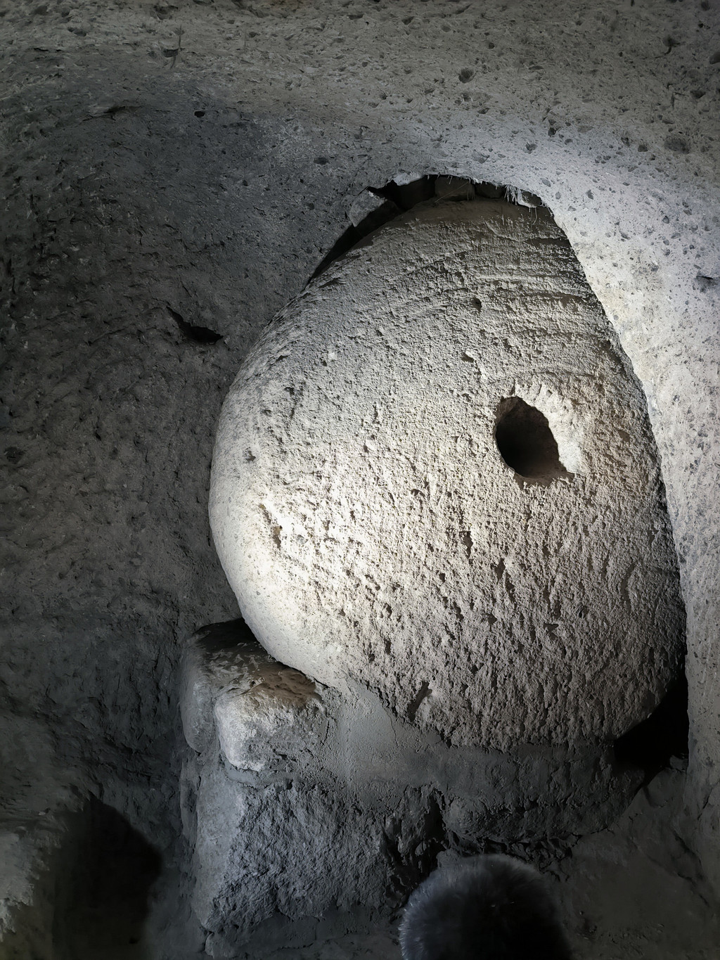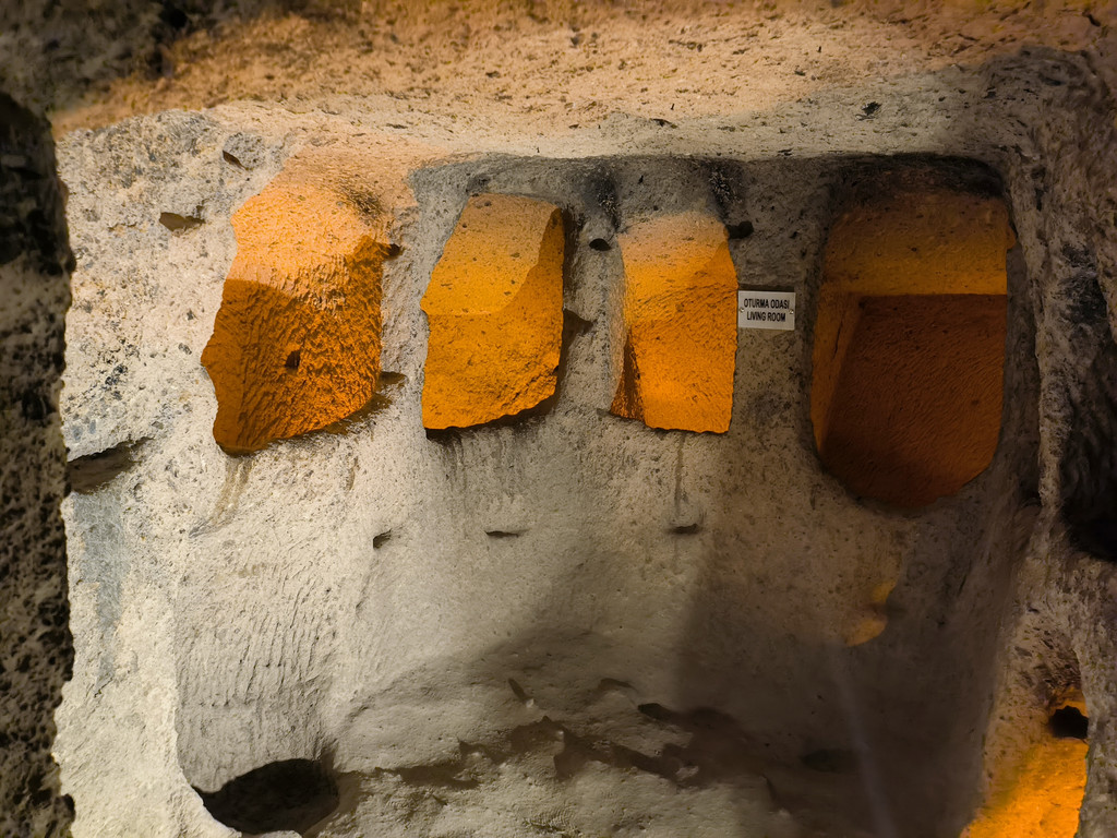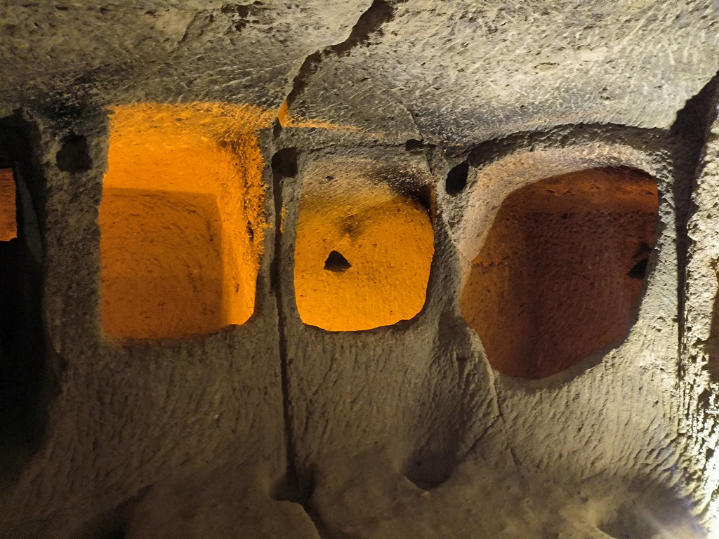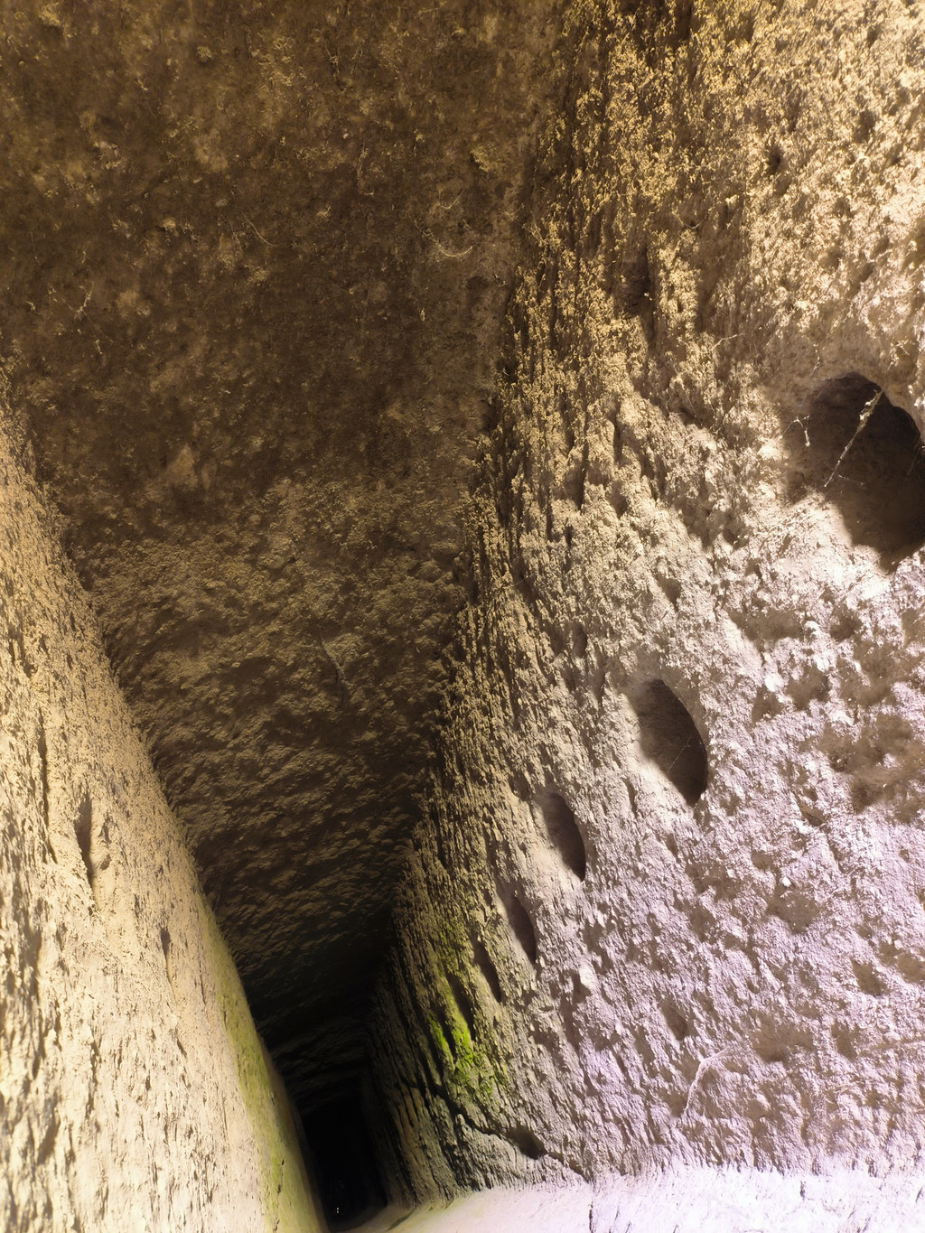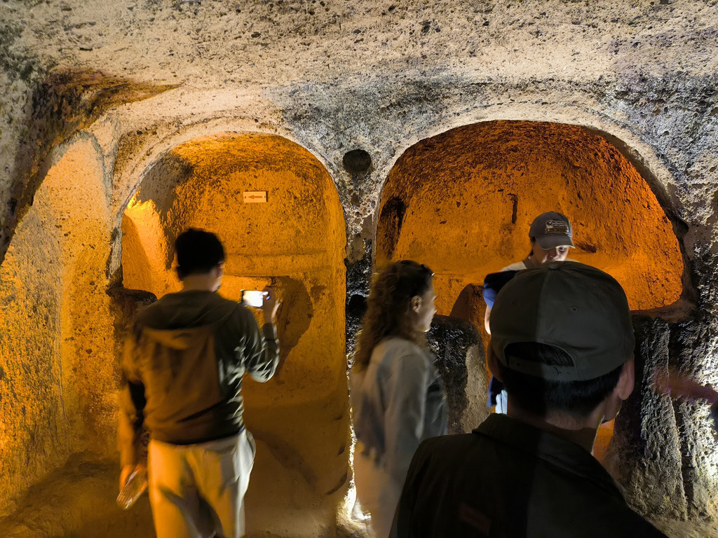 以迷宫一般的隧道而著称,多达8层,深达110米,规模宏大,共有1200间房子,可居住1万多人,不仅有卧室、厨房等生活区域,还有学校、酒窖、教堂等公共场所,各种设施一应俱全,还有完善的通风系统,目前只有上4层对游客开放。地下城的入口一般都很隐蔽,隐藏在村子各处的房屋下面,我们经过盘旋的石梯进入地下,沿着又低又窄的地道下行,大部分只可勉强供一人通过,迂回曲折,纵横交错,很容易迷路,洞壁上会标有红色和蓝色的箭头,顺着一种颜色的箭头走即可,但有些地方只能弯着腰或蹲着前进,我不由得想起了国内的冀中地道战。