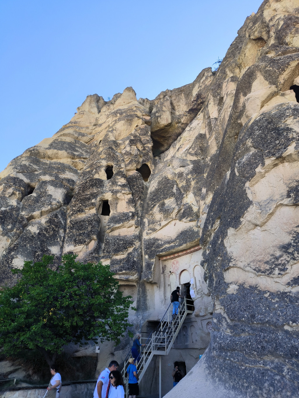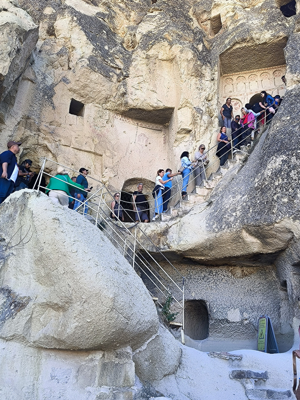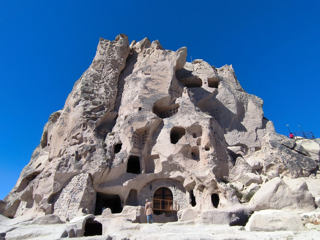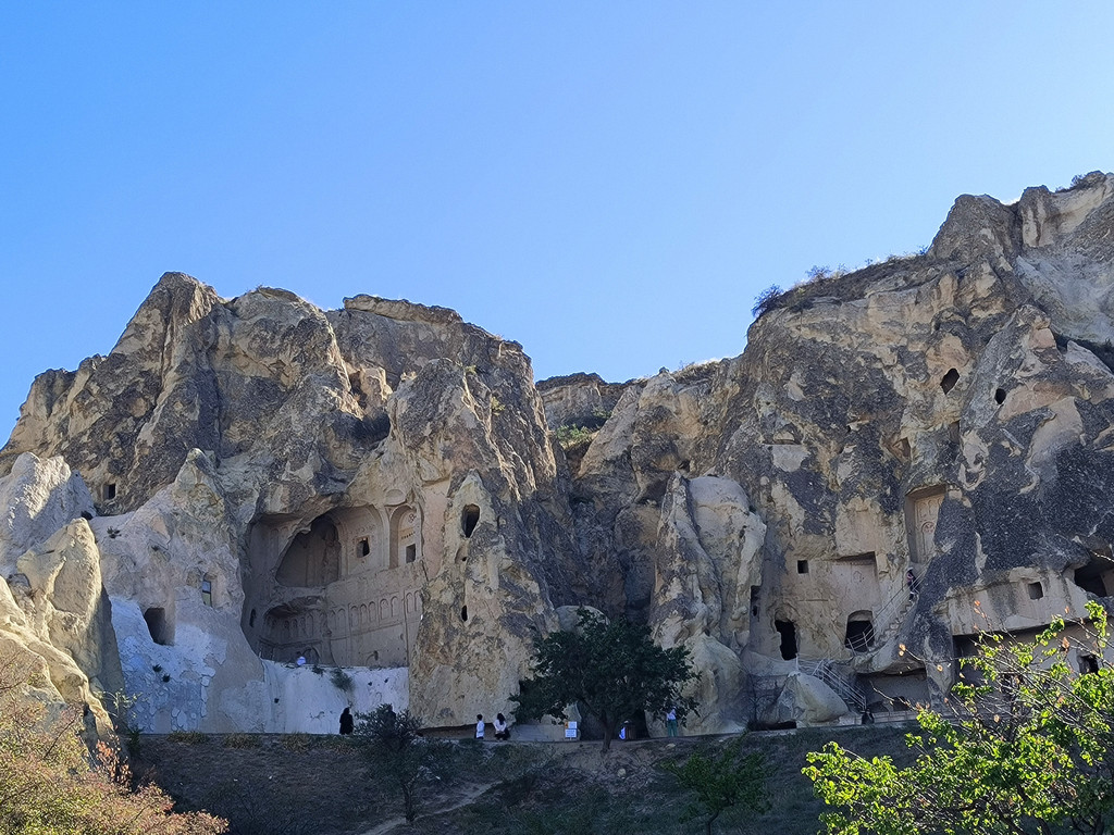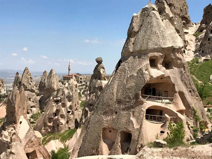 走出地下城前往乌奇萨城堡,实际上是一座60米高的石山,也是这一带的制高点,方圆几公里内都能看到,乌奇萨是“第三个堡垒”的意思,早期居民为防御外敌入侵,将山岩挖空建成相互连通的要塞,相连形成庞大社区,巨岩上有数不清的洞口,外敌入侵时,平时就在洞穴内存好水粮,外敌入侵时居民可以躲进洞内,几个月不必外出。让卡帕多奇亚久负盛名的还有格雷梅露天博物馆,博物馆并非现代新修的建筑物,而是在自然地貌的基础上形成的洞窟群,包括拜占庭风格洞窟教堂、礼拜堂和修道院多达30余座,均位于陡峭的山谷之中,大多建于公元九世纪至十三世纪之间,这些教堂最初由躲避政治迫害的基督教徒所修,为掩人耳目他们将山体凿空修建教堂,