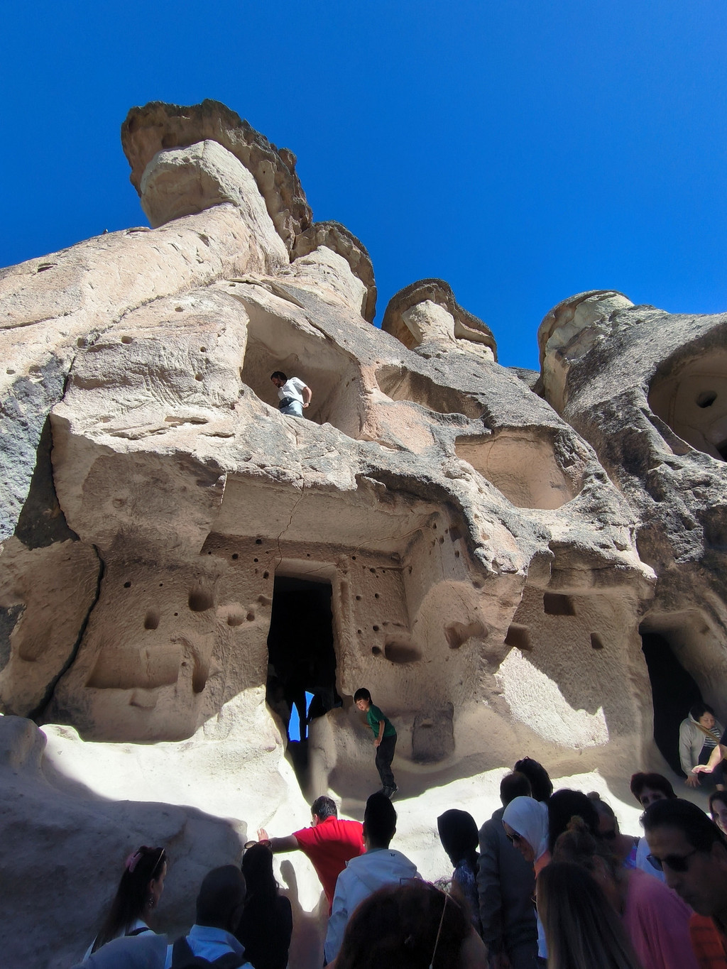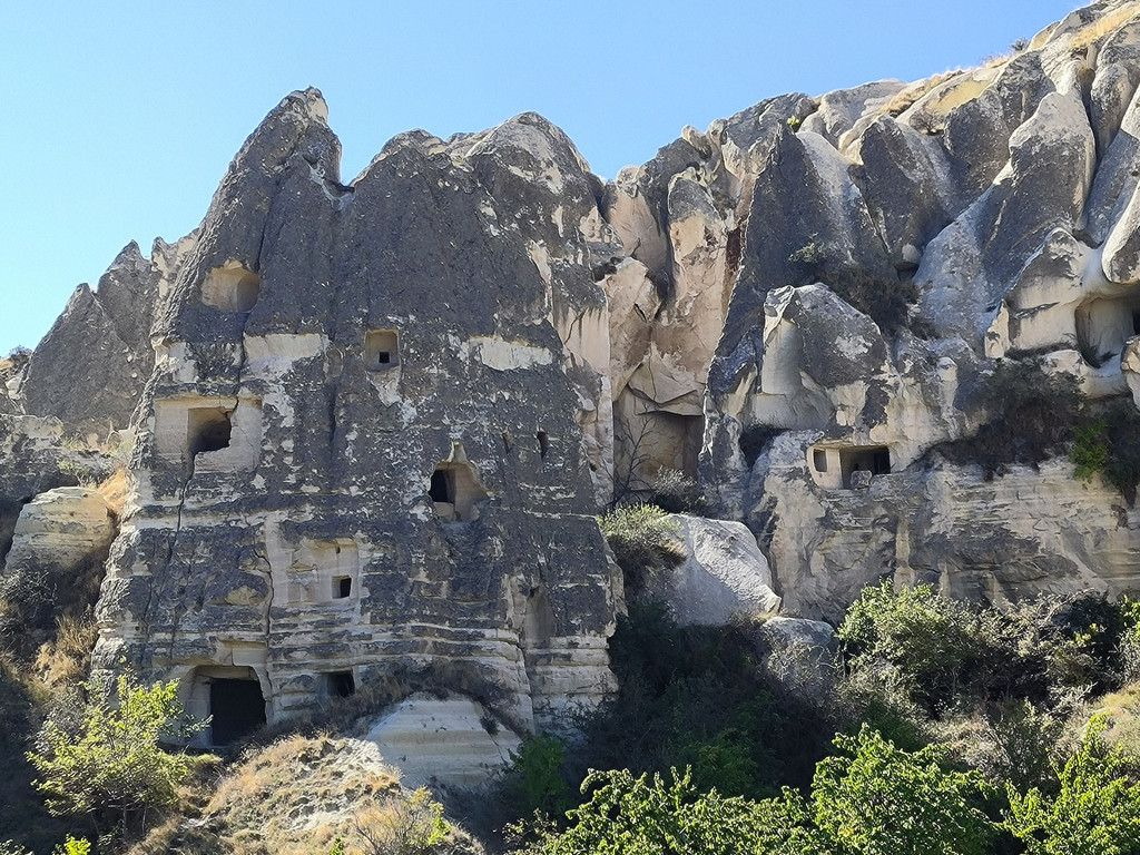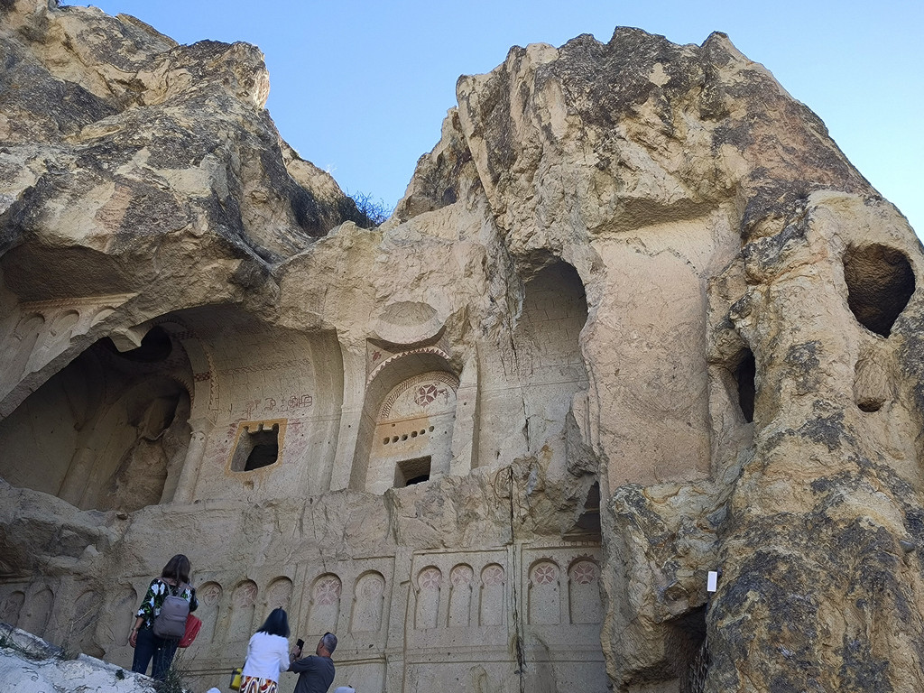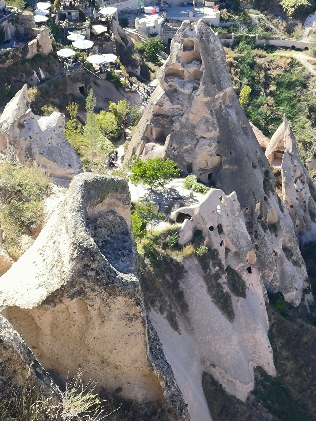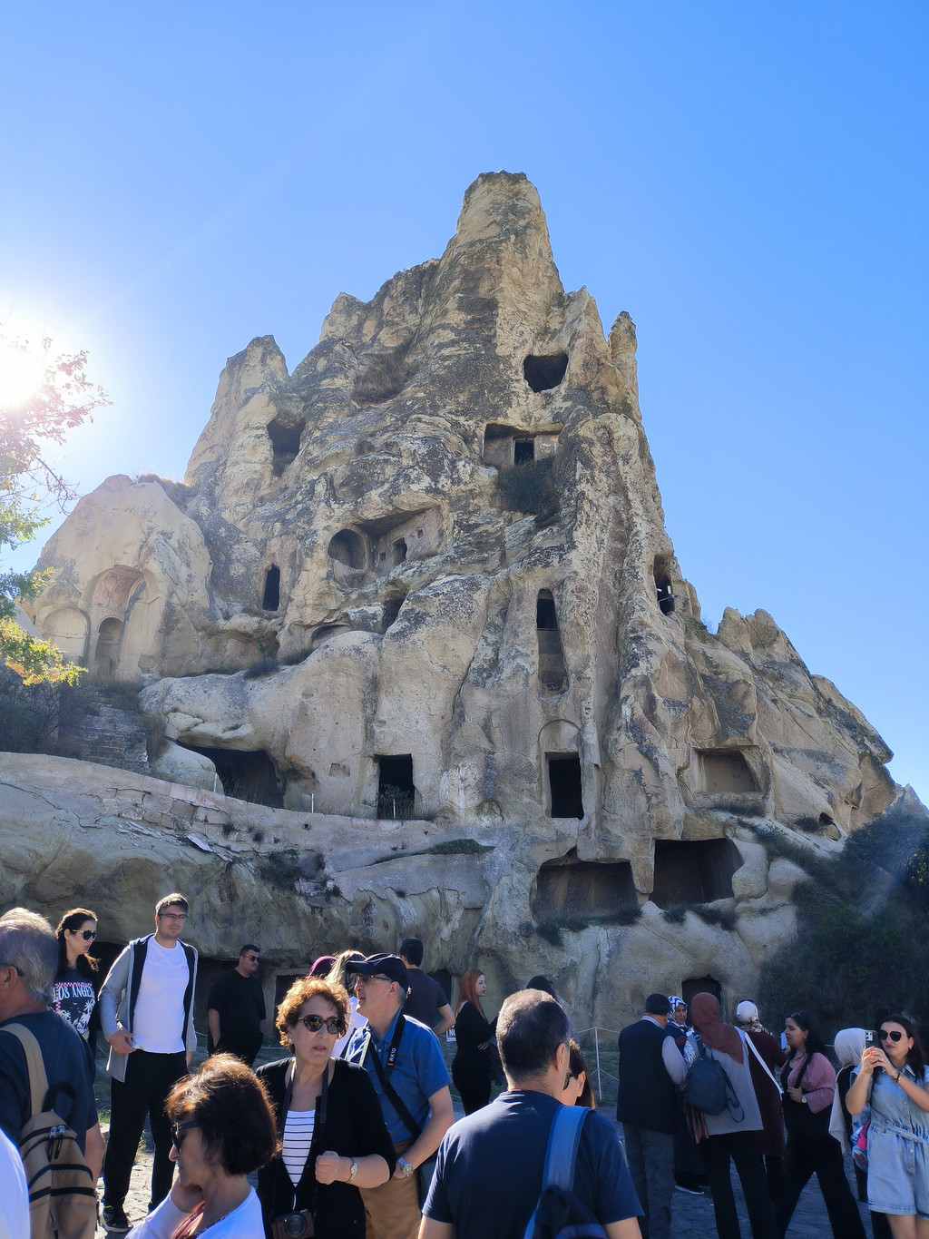 走出地下城前往乌奇萨城堡,实际上是一座60米高的石山,也是这一带的制高点,方圆几公里内都能看到,乌奇萨是“第三个堡垒”的意思,早期居民为防御外敌入侵,将山岩挖空建成相互连通的要塞,相连形成庞大社区,巨岩上有数不清的洞口,外敌入侵时,平时就在洞穴内存好水粮,外敌入侵时居民可以躲进洞内,几个月不必外出。让卡帕多奇亚久负盛名的还有格雷梅露天博物馆,博物馆并非现代新修的建筑物,而是在自然地貌的基础上形成的洞窟群,包括拜占庭风格洞窟教堂、礼拜堂和修道院多达30余座,均位于陡峭的山谷之中,大多建于公元九世纪至十三世纪之间,这些教堂最初由躲避政治迫害的基督教徒所修,为掩人耳目他们将山体凿空修建教堂,