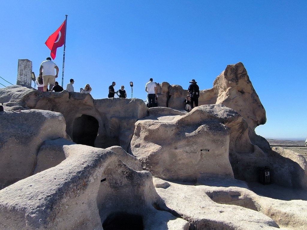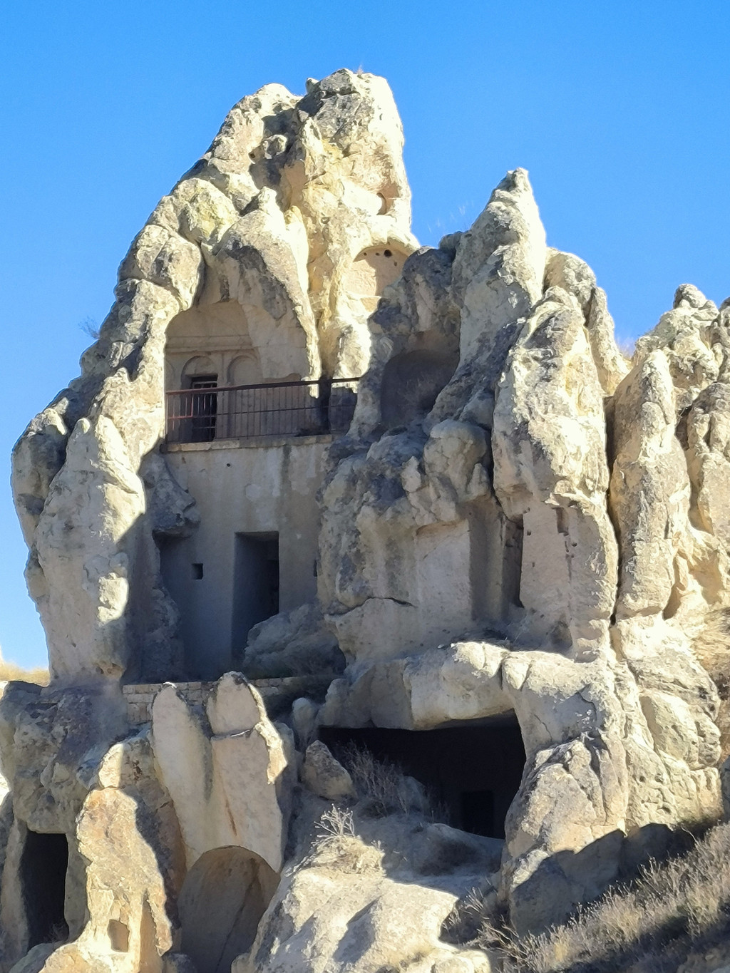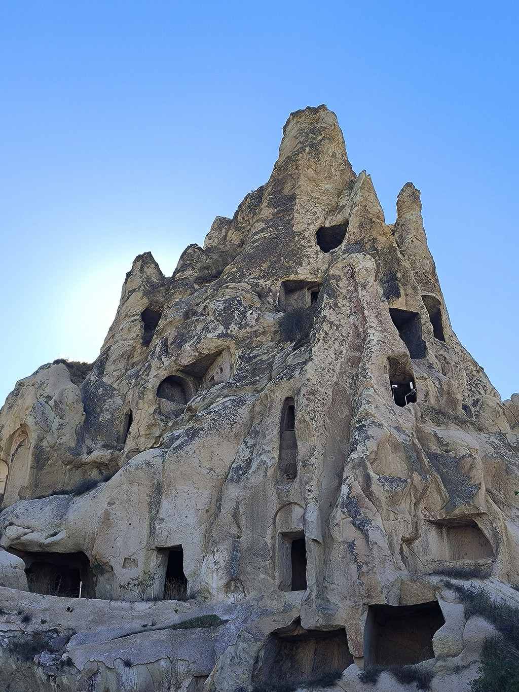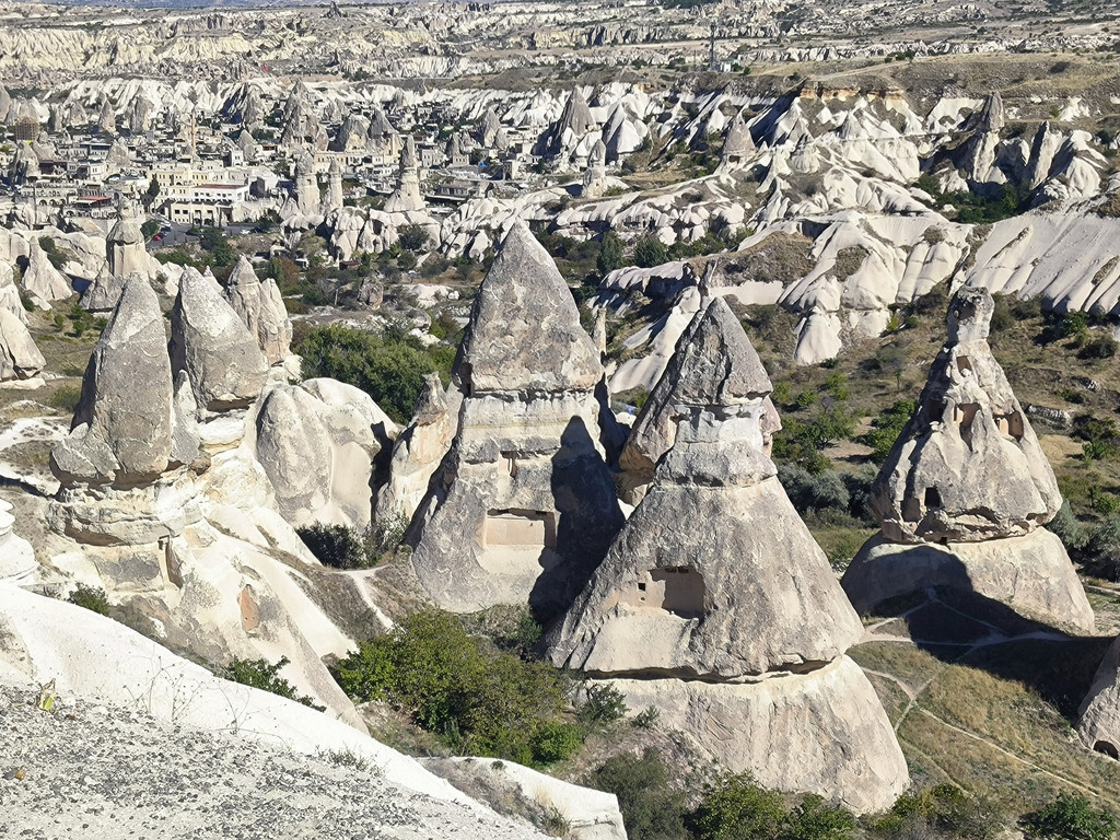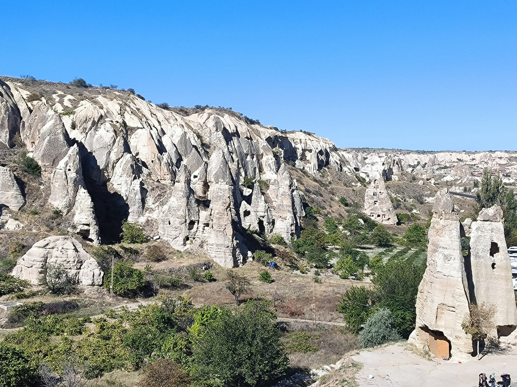 走出地下城前往乌奇萨城堡,实际上是一座60米高的石山,也是这一带的制高点,方圆几公里内都能看到,乌奇萨是“第三个堡垒”的意思,早期居民为防御外敌入侵,将山岩挖空建成相互连通的要塞,相连形成庞大社区,巨岩上有数不清的洞口,外敌入侵时,平时就在洞穴内存好水粮,外敌入侵时居民可以躲进洞内,几个月不必外出。让卡帕多奇亚久负盛名的还有格雷梅露天博物馆,博物馆并非现代新修的建筑物,而是在自然地貌的基础上形成的洞窟群,包括拜占庭风格洞窟教堂、礼拜堂和修道院多达30余座,均位于陡峭的山谷之中,大多建于公元九世纪至十三世纪之间,这些教堂最初由躲避政治迫害的基督教徒所修,为掩人耳目他们将山体凿空修建教堂,