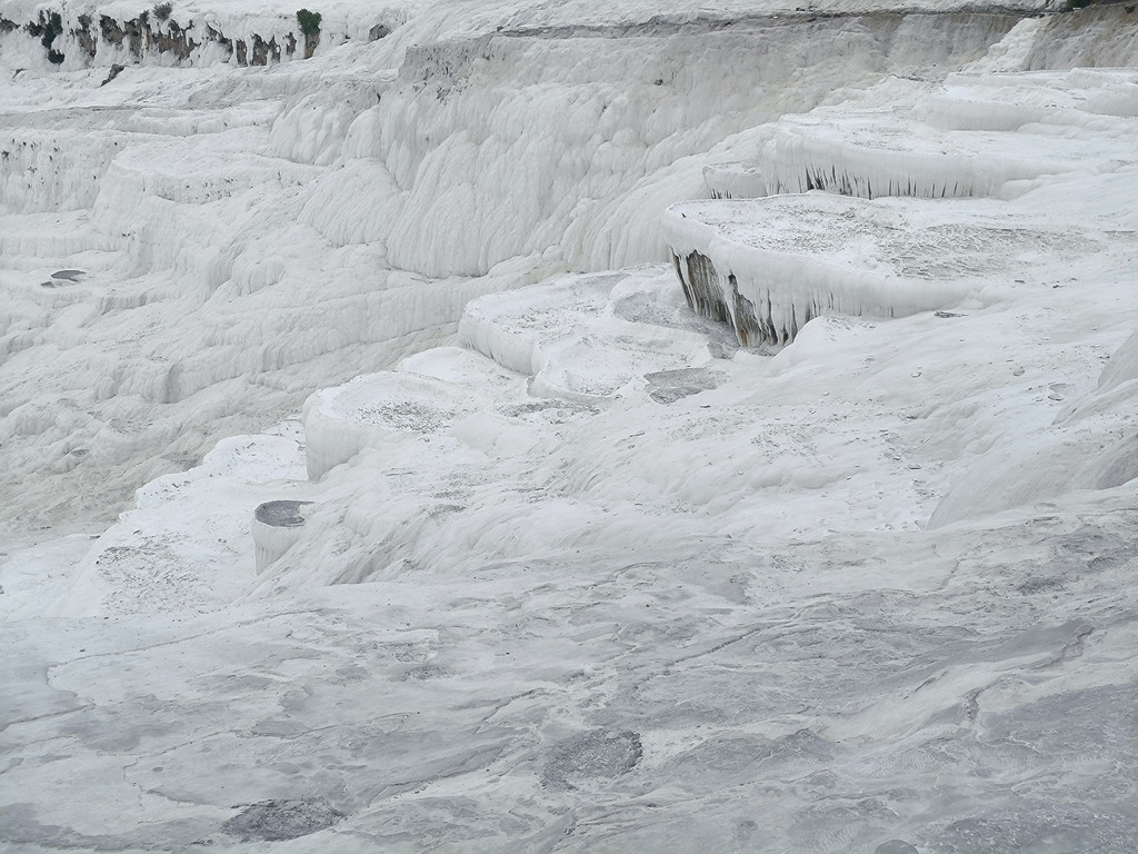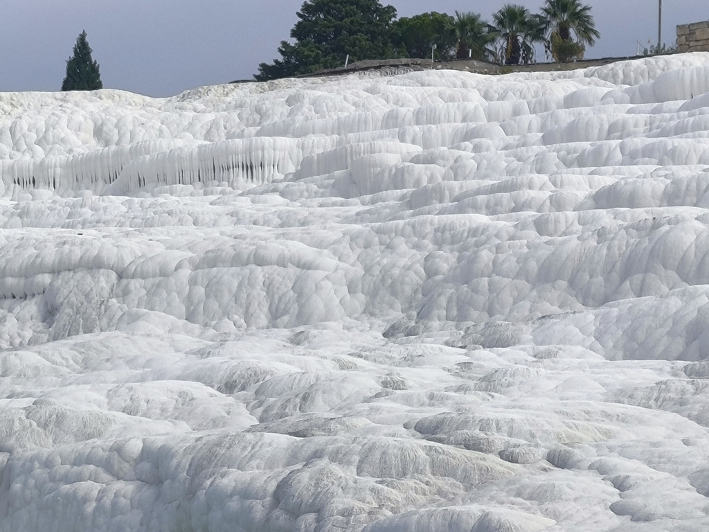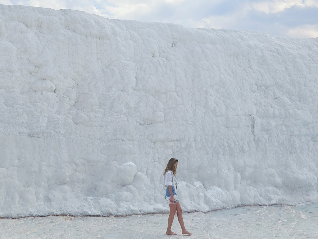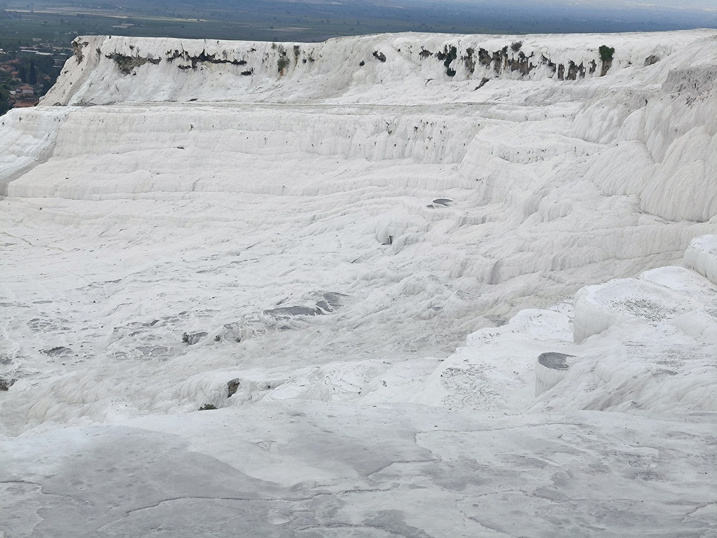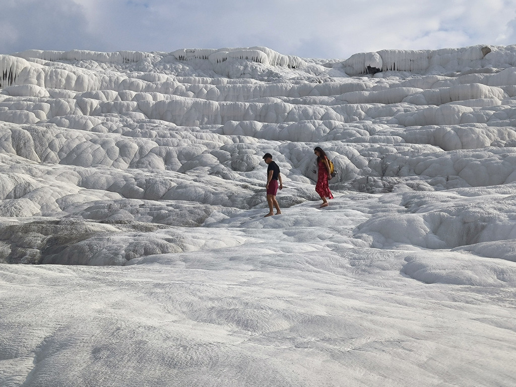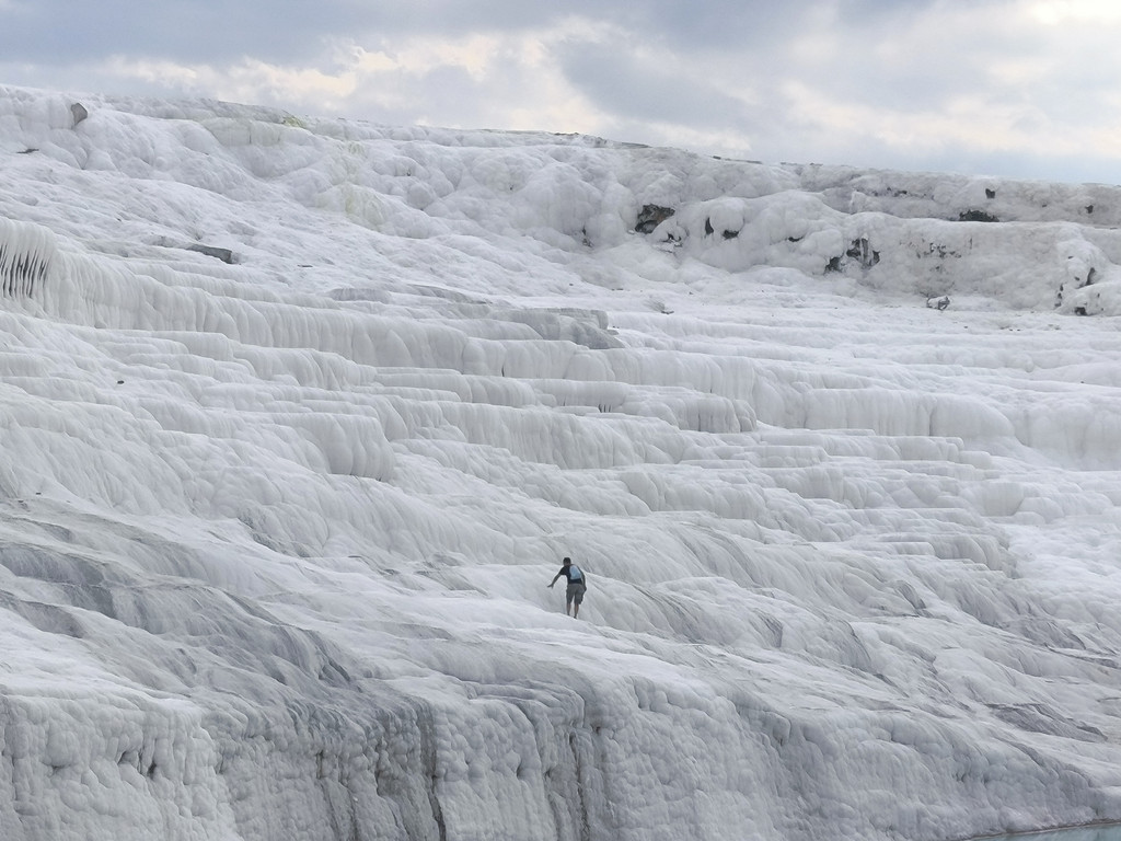 我们自出行以来一直晴天,但到帕穆克卡莱的第二天却转阴了,早上我们前往棉花堡,脱鞋后沿着缓坡向下走,左边是数米高的钙化墙,右边是一直伸延到山底的钙化坡,看上去似乎柔软蓬松,实际上地面十分坚硬并且坑洼不平,脚下的钙化纹路图案美不胜收,但踩上去并不光滑,脚底会感到一些刺痛,实际上走起来甚至有点举步维艰,如果足底不够坚强的人,建议考虑穿一双厚袜子。