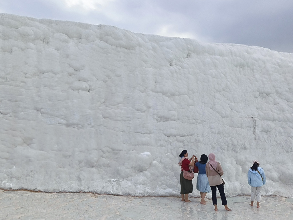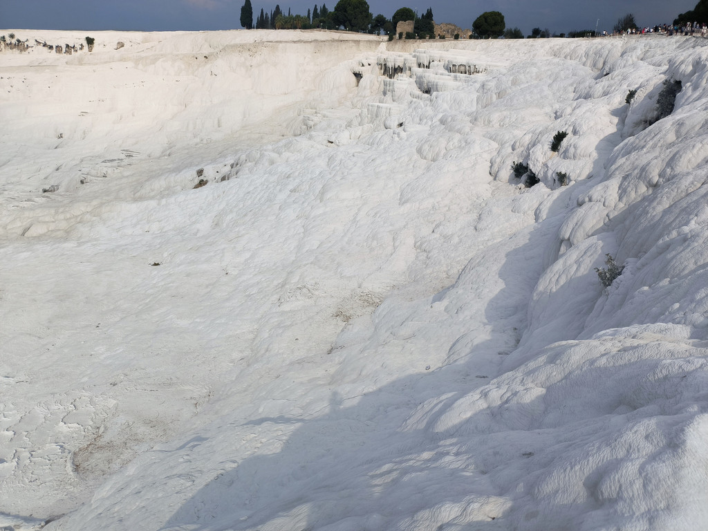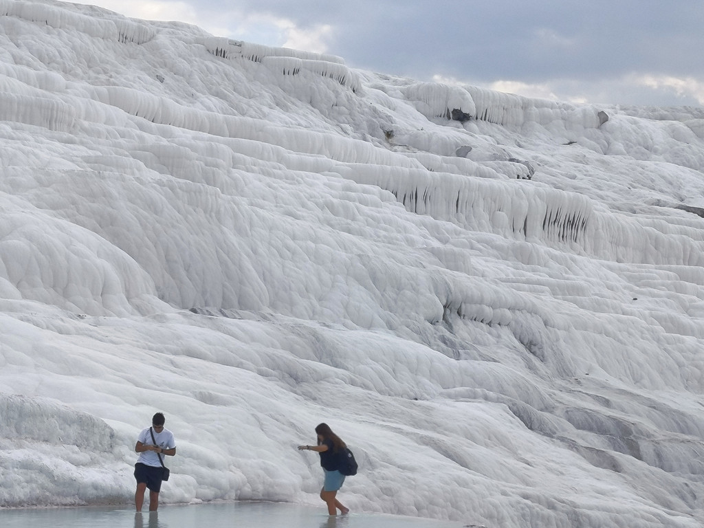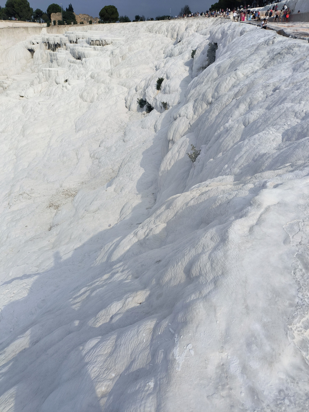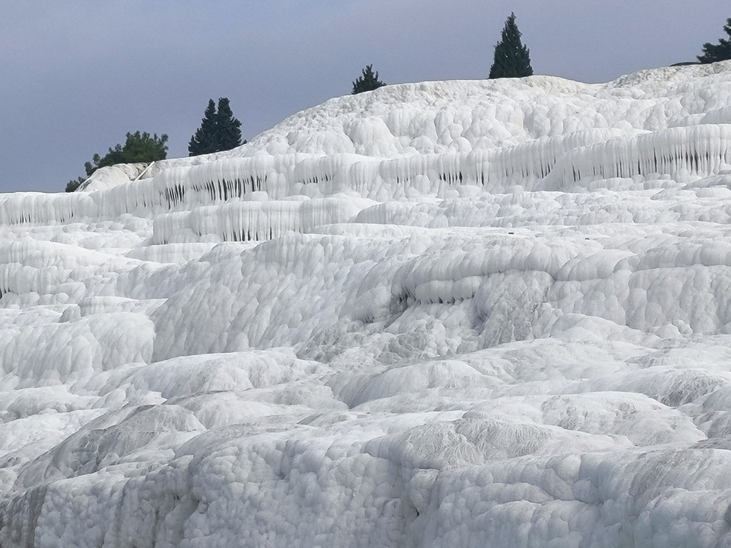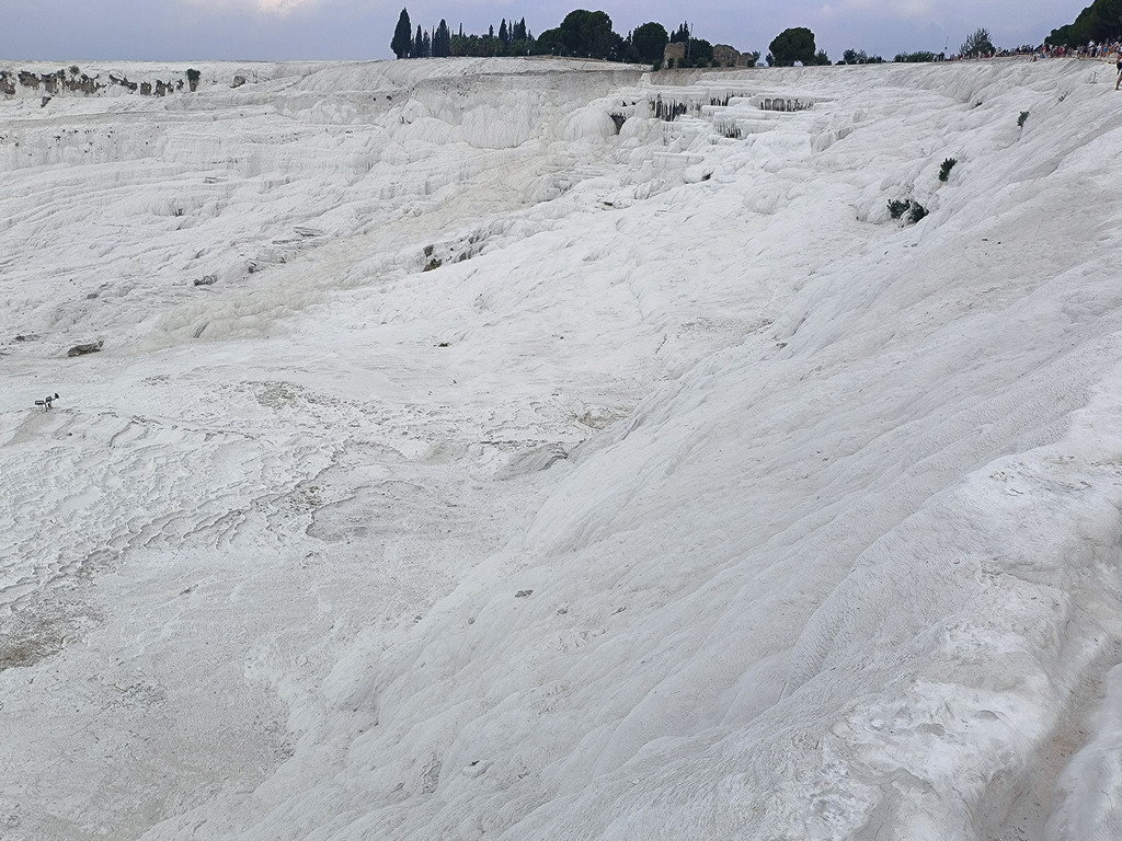 我们自出行以来一直晴天,但到帕穆克卡莱的第二天却转阴了,早上我们前往棉花堡,脱鞋后沿着缓坡向下走,左边是数米高的钙化墙,右边是一直伸延到山底的钙化坡,看上去似乎柔软蓬松,实际上地面十分坚硬并且坑洼不平,脚下的钙化纹路图案美不胜收,但踩上去并不光滑,脚底会感到一些刺痛,实际上走起来甚至有点举步维艰,如果足底不够坚强的人,建议考虑穿一双厚袜子。