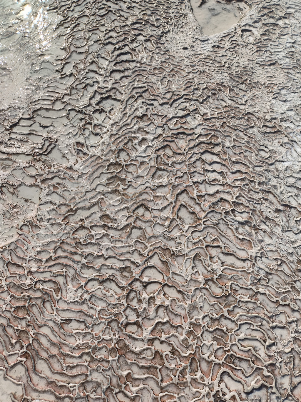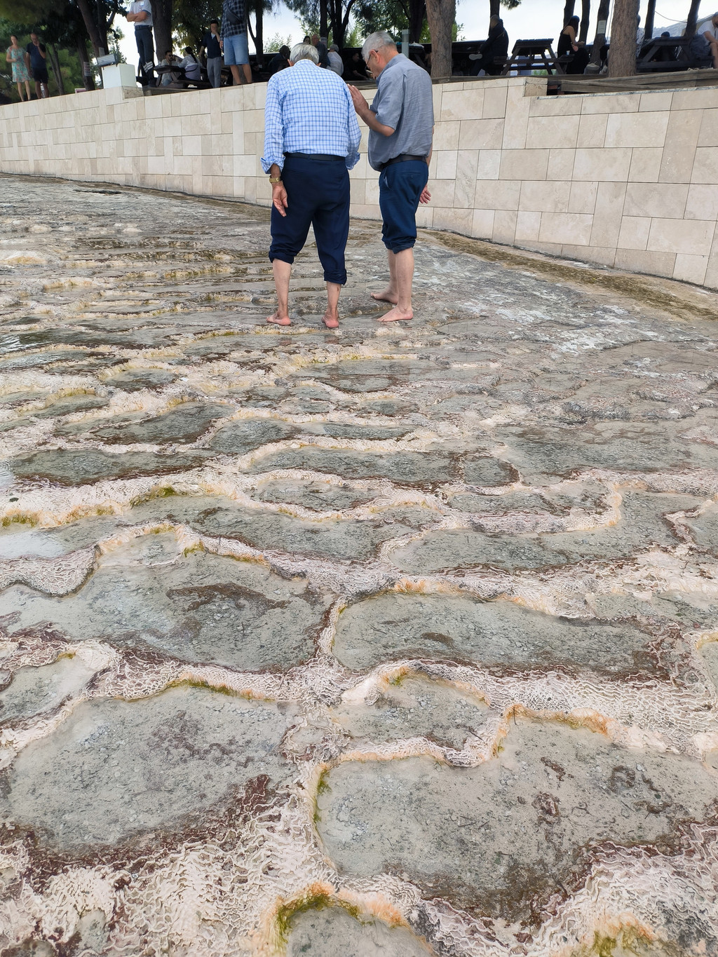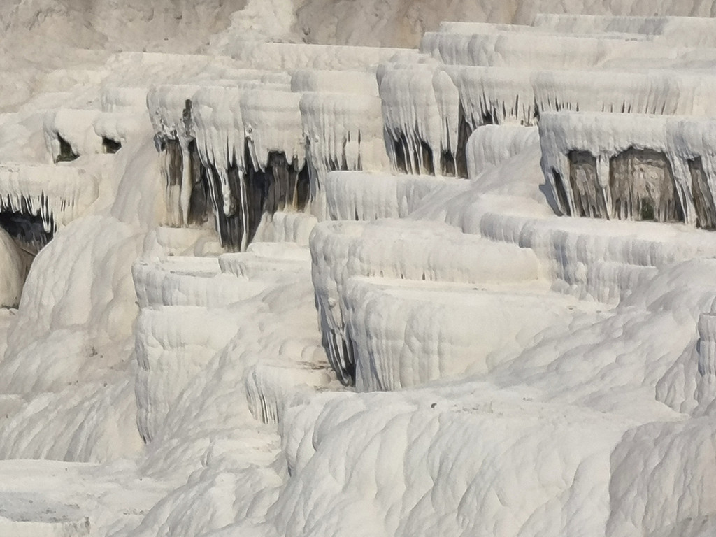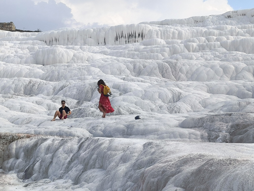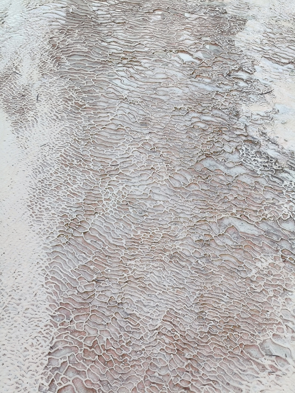 我们自出行以来一直晴天,但到帕穆克卡莱的第二天却转阴了,早上我们前往棉花堡,脱鞋后沿着缓坡向下走,左边是数米高的钙化墙,右边是一直伸延到山底的钙化坡,看上去似乎柔软蓬松,实际上地面十分坚硬并且坑洼不平,脚下的钙化纹路图案美不胜收,但踩上去并不光滑,脚底会感到一些刺痛,实际上走起来甚至有点举步维艰,如果足底不够坚强的人,建议考虑穿一双厚袜子。