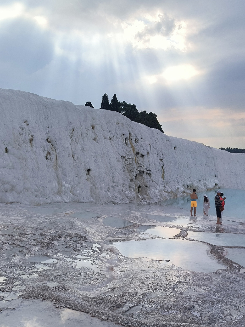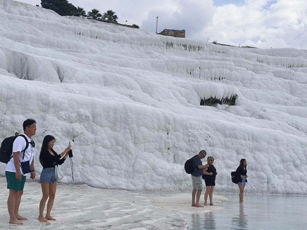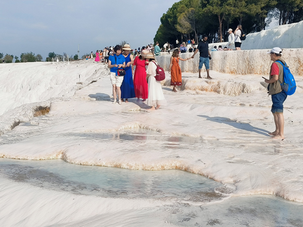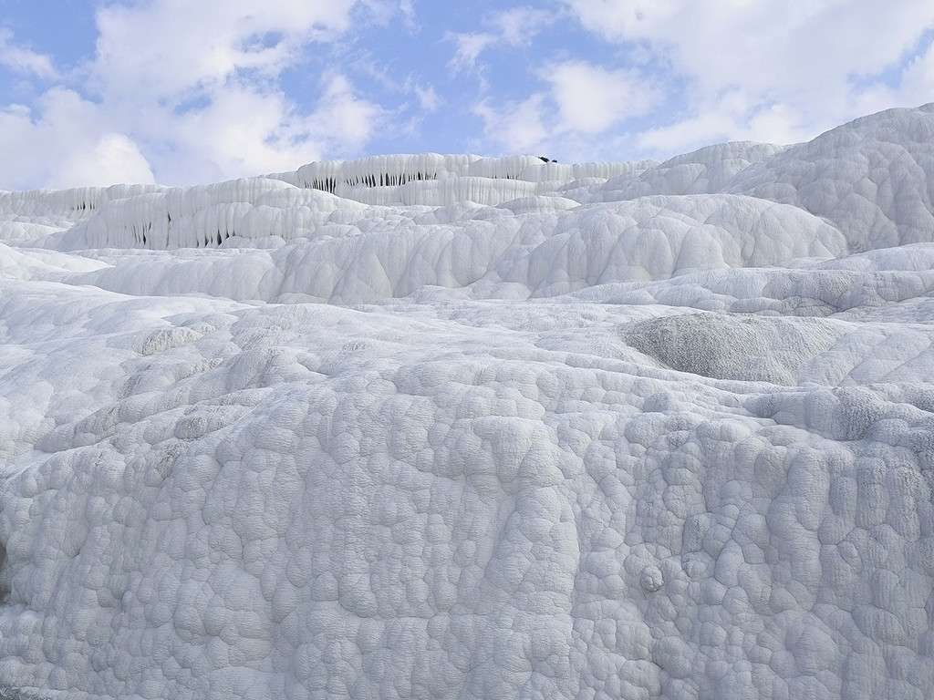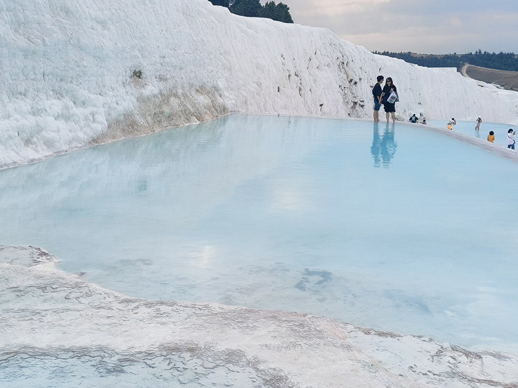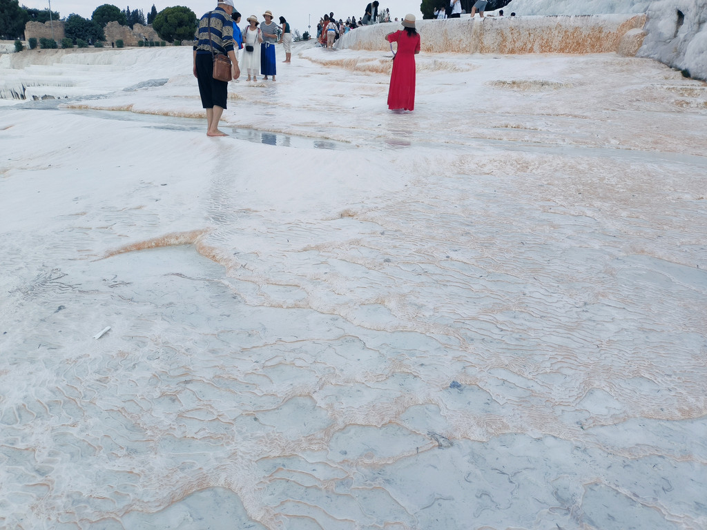 棉花堡的泉水深浅不一,有些只及脚踝,最深的可及腰部,水的酸碱值大概6左右,富含钙、镁等矿物质,以每秒400公升的速度流动,不但对风湿、皮肤病、妇科病、消化不良及神经衰弱等有神奇疗效,泉水还可饮用。我们一直走到最下方终点,这里的游人比较少,但碳酸钙的堆积更新、更白,此时云散天开,蓝天初露,我拍到了下少精彩大片,但未看到网上常见的梯田景观,不知是否又是游人“后期制作”。