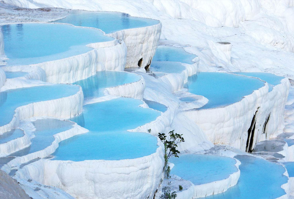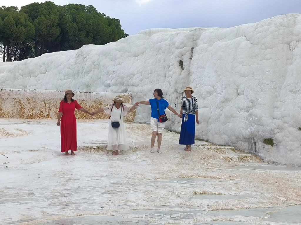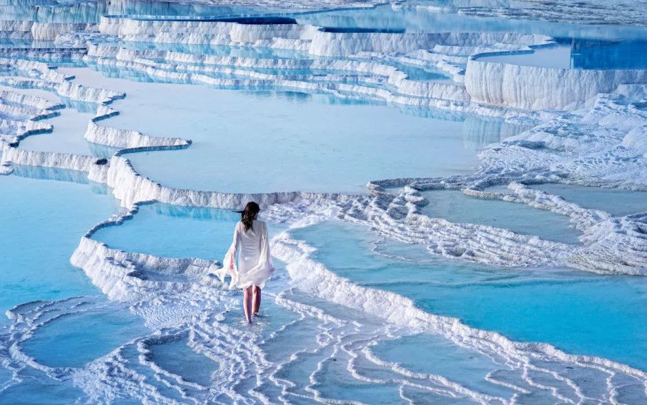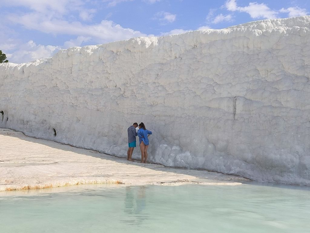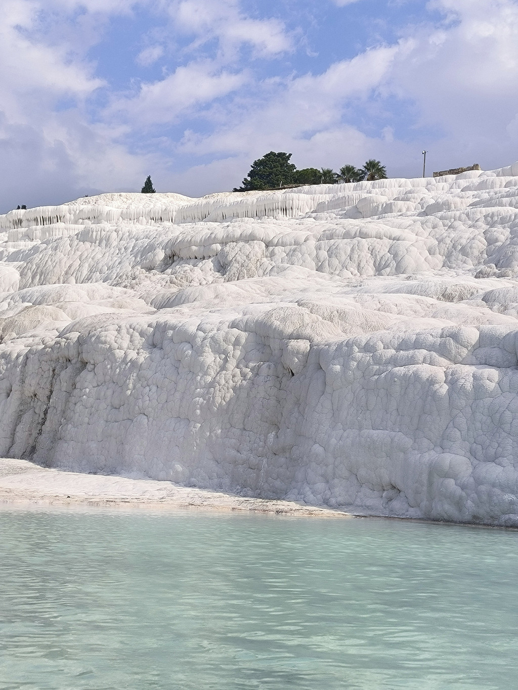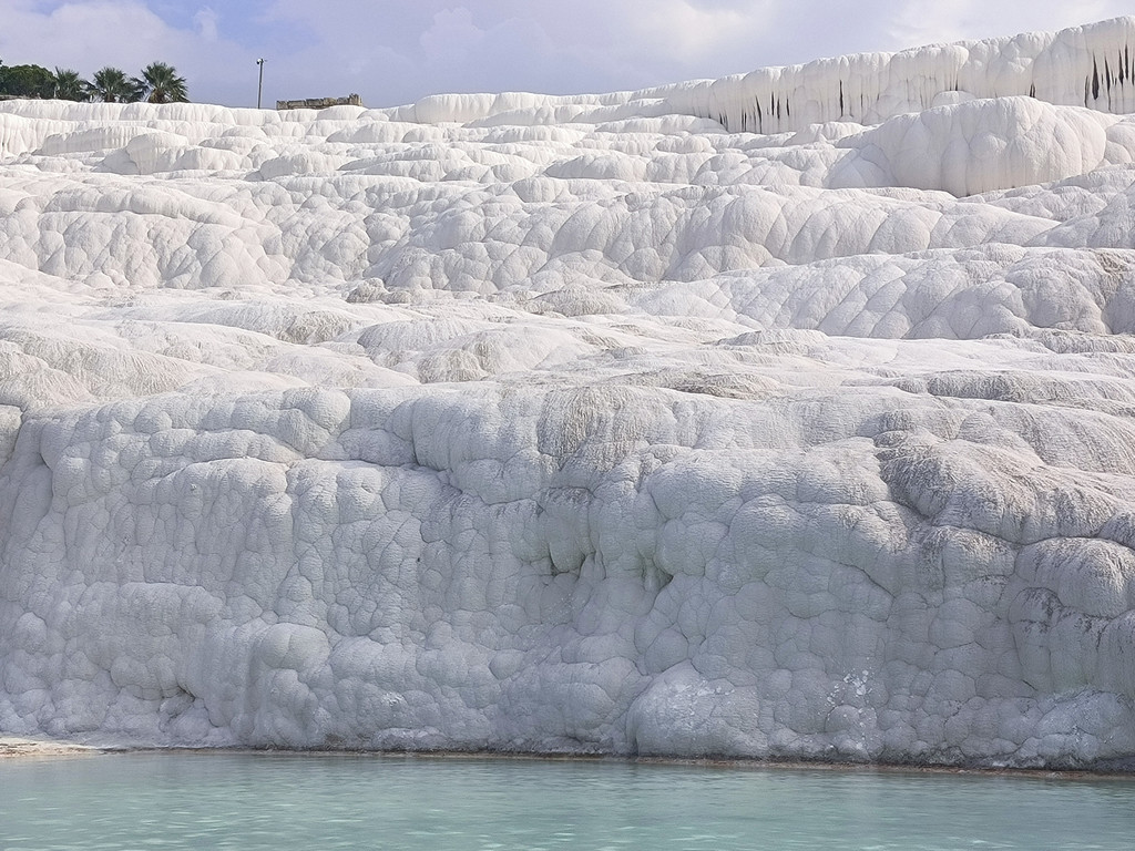 棉花堡的泉水深浅不一,有些只及脚踝,最深的可及腰部,水的酸碱值大概6左右,富含钙、镁等矿物质,以每秒400公升的速度流动,不但对风湿、皮肤病、妇科病、消化不良及神经衰弱等有神奇疗效,泉水还可饮用。我们一直走到最下方终点,这里的游人比较少,但碳酸钙的堆积更新、更白,此时云散天开,蓝天初露,我拍到了下少精彩大片,但未看到网上常见的梯田景观,不知是否又是游人“后期制作”。