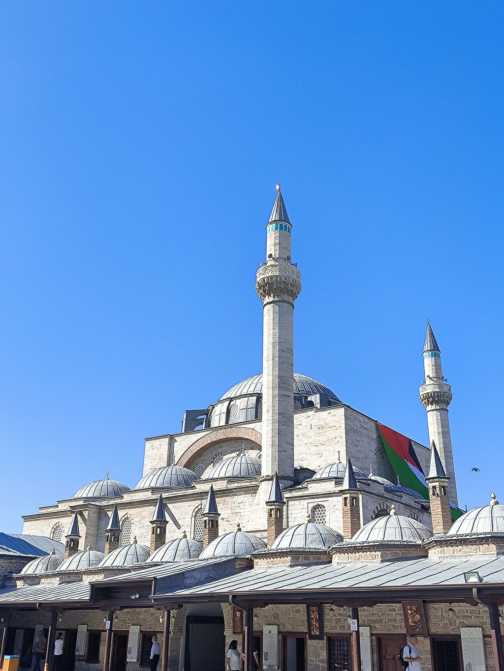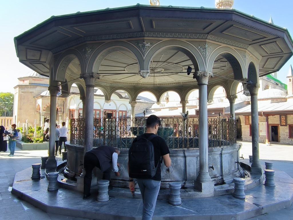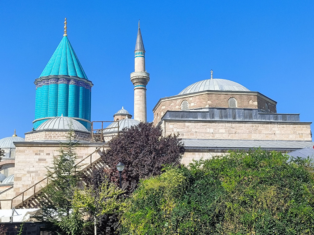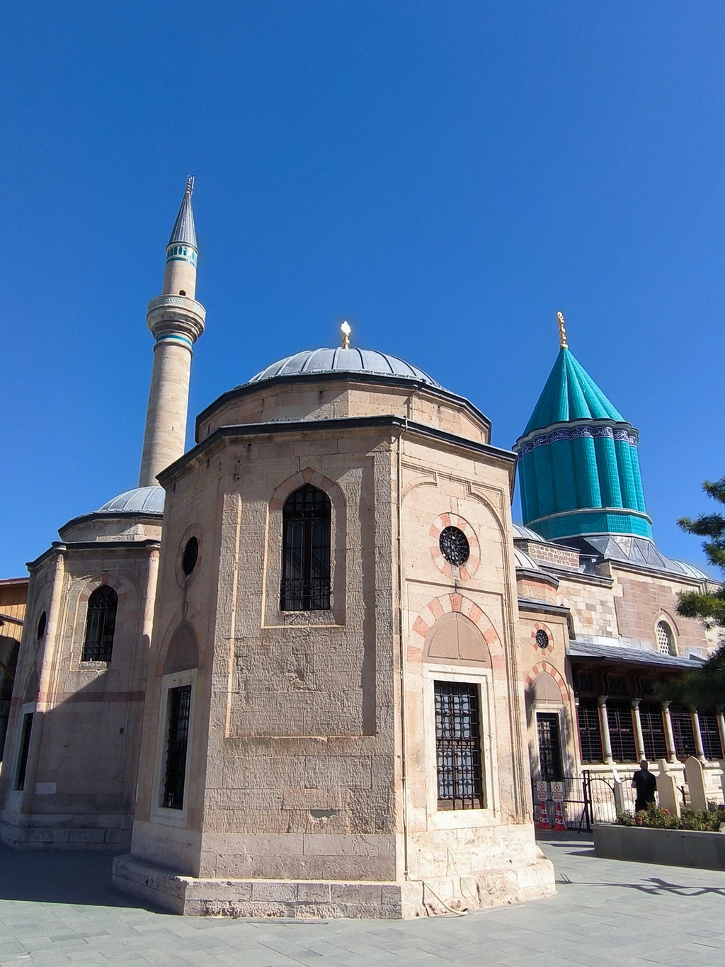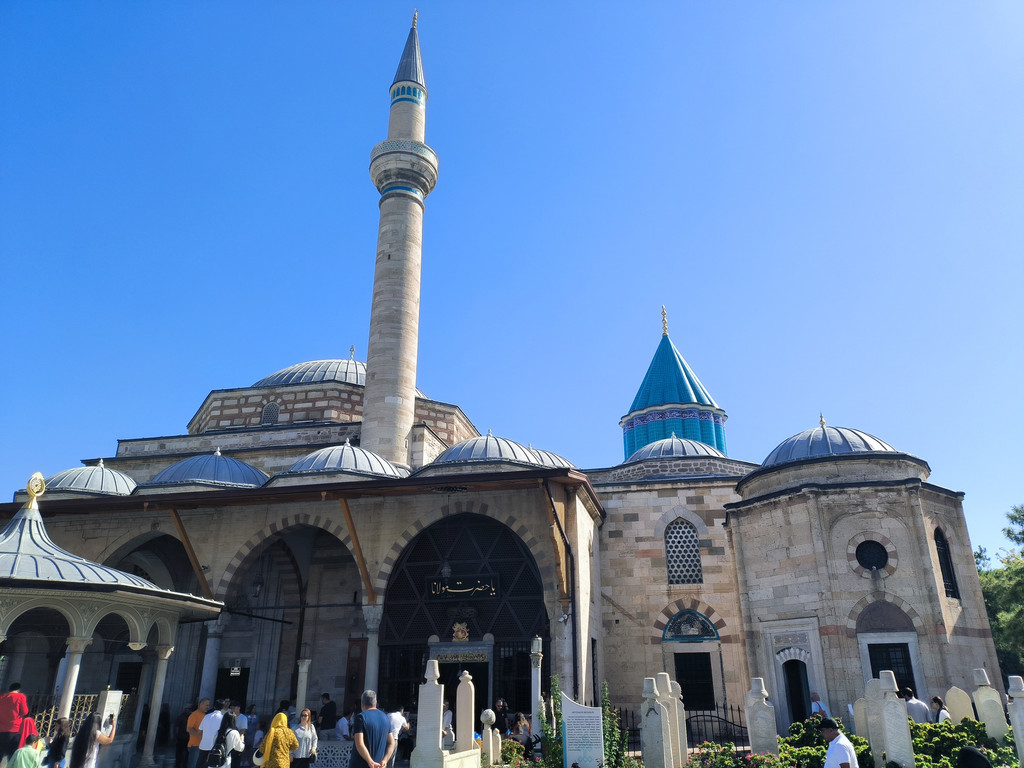 卡帕多奇亚是我们此行最东面的景点,之后折返向西赶了一天的路,途中在塞尔柱土耳其帝国的首都孔亚停了1小时,塞尔柱土耳其帝国(公元1037年-1194年)是11世纪塞尔柱突厥人在中亚、西亚建立的伊斯兰帝国,亦称塞尔柱王朝,帝国极盛时领有伊朗、伊拉克、高加索等地。这里是土耳其传统的宗教文化中心,也是土耳其最古老的城市之一,存留了塞尔柱时期大量的古迹,梅乌拉那博物馆是孔亚最有名的建筑,以土耳其圣哲梅乌拉那而闻名于世,许多穆斯林不远千里而来,就是为了进入博物馆参拜圣物,庞大的建筑群高高低低,气势非凡,远远就可以看见那笛子般的尖塔,以及塔身所覆盖的蓝绿色瓷砖。