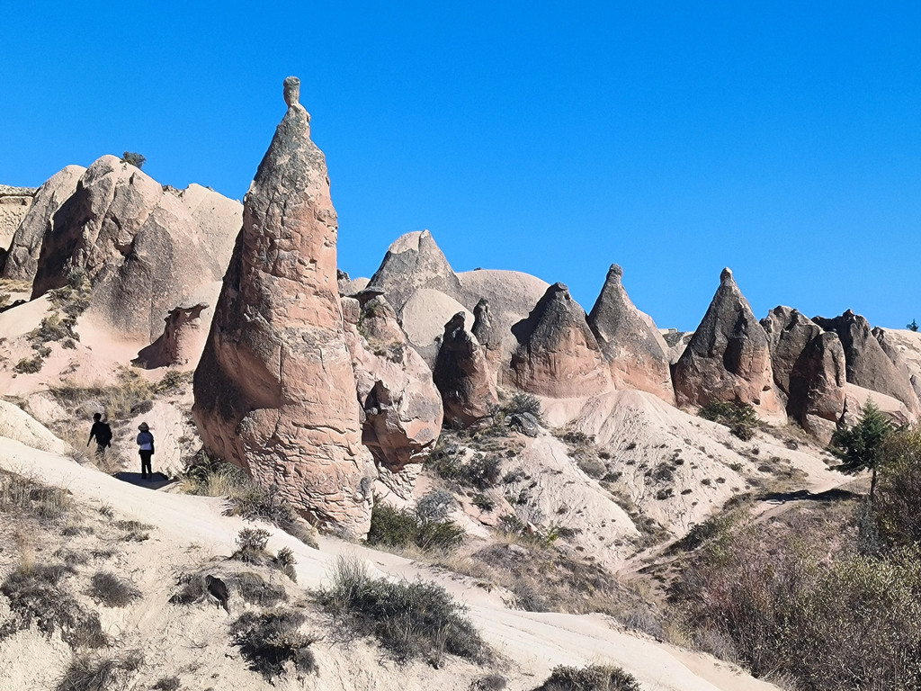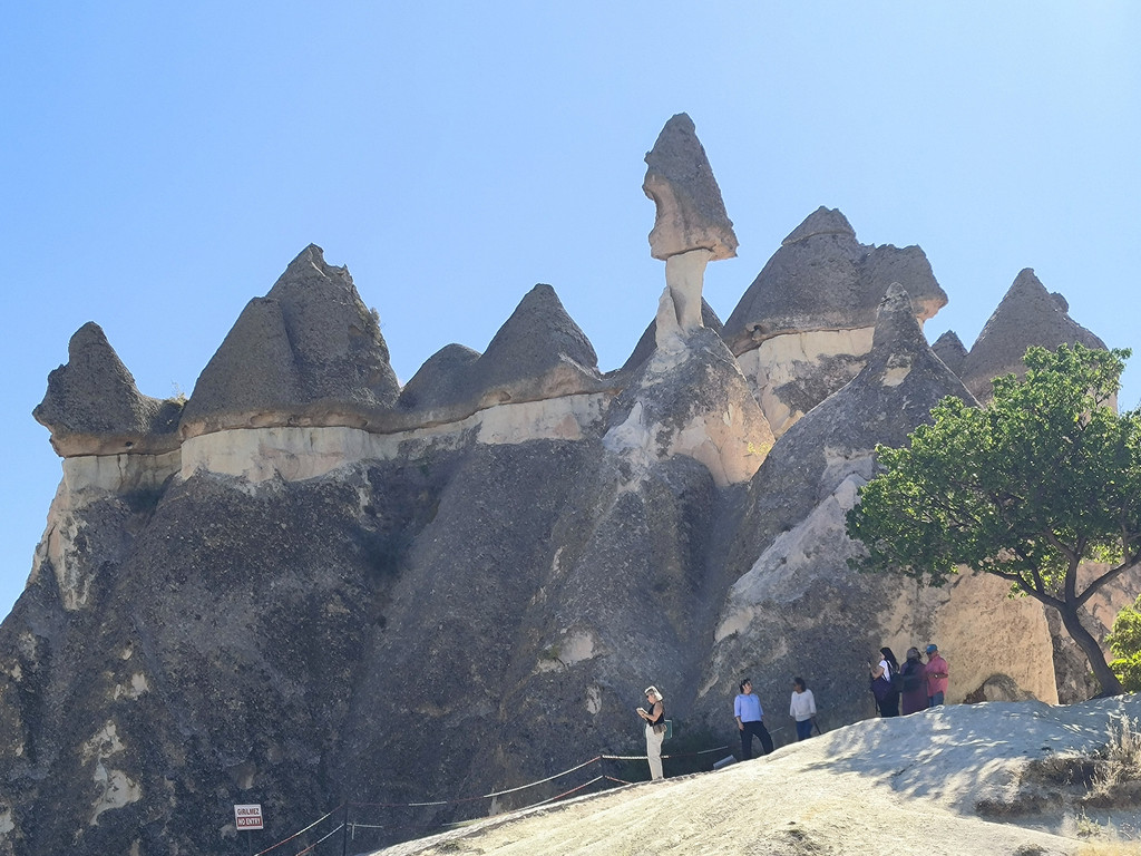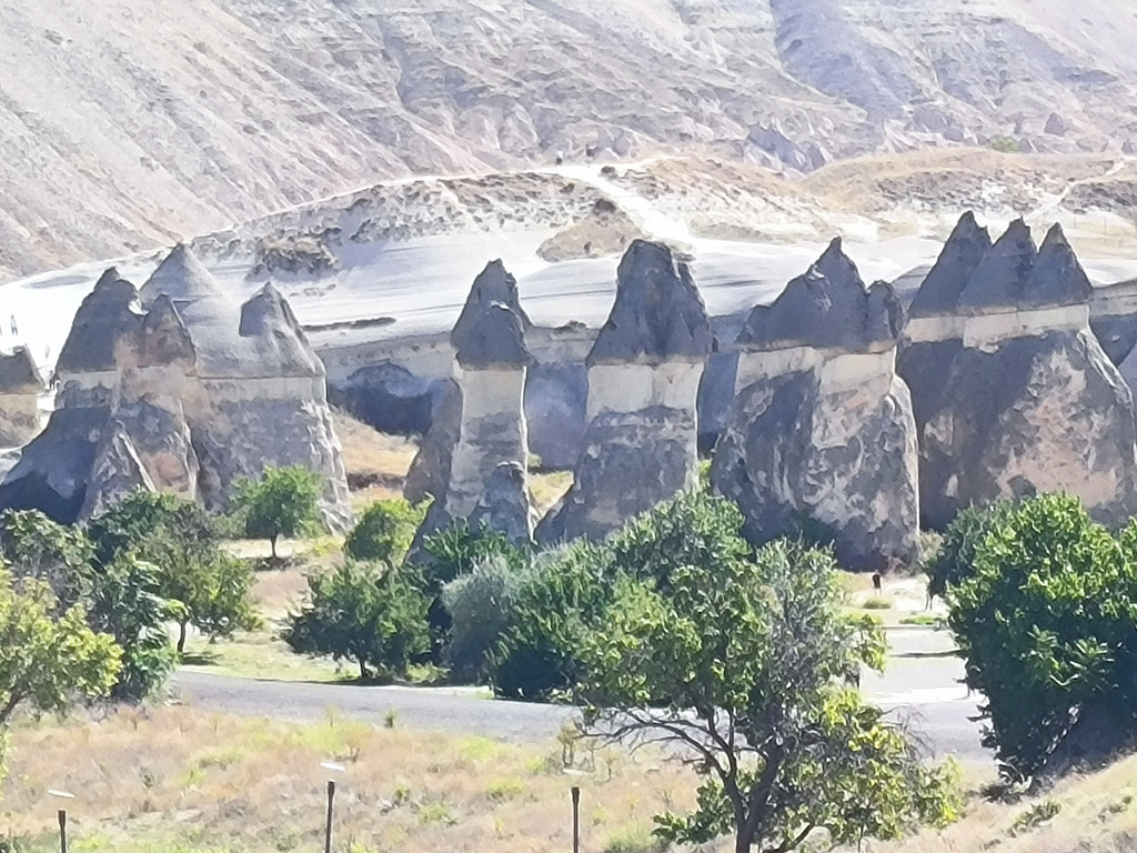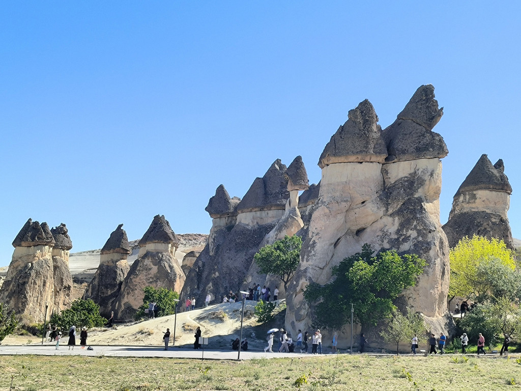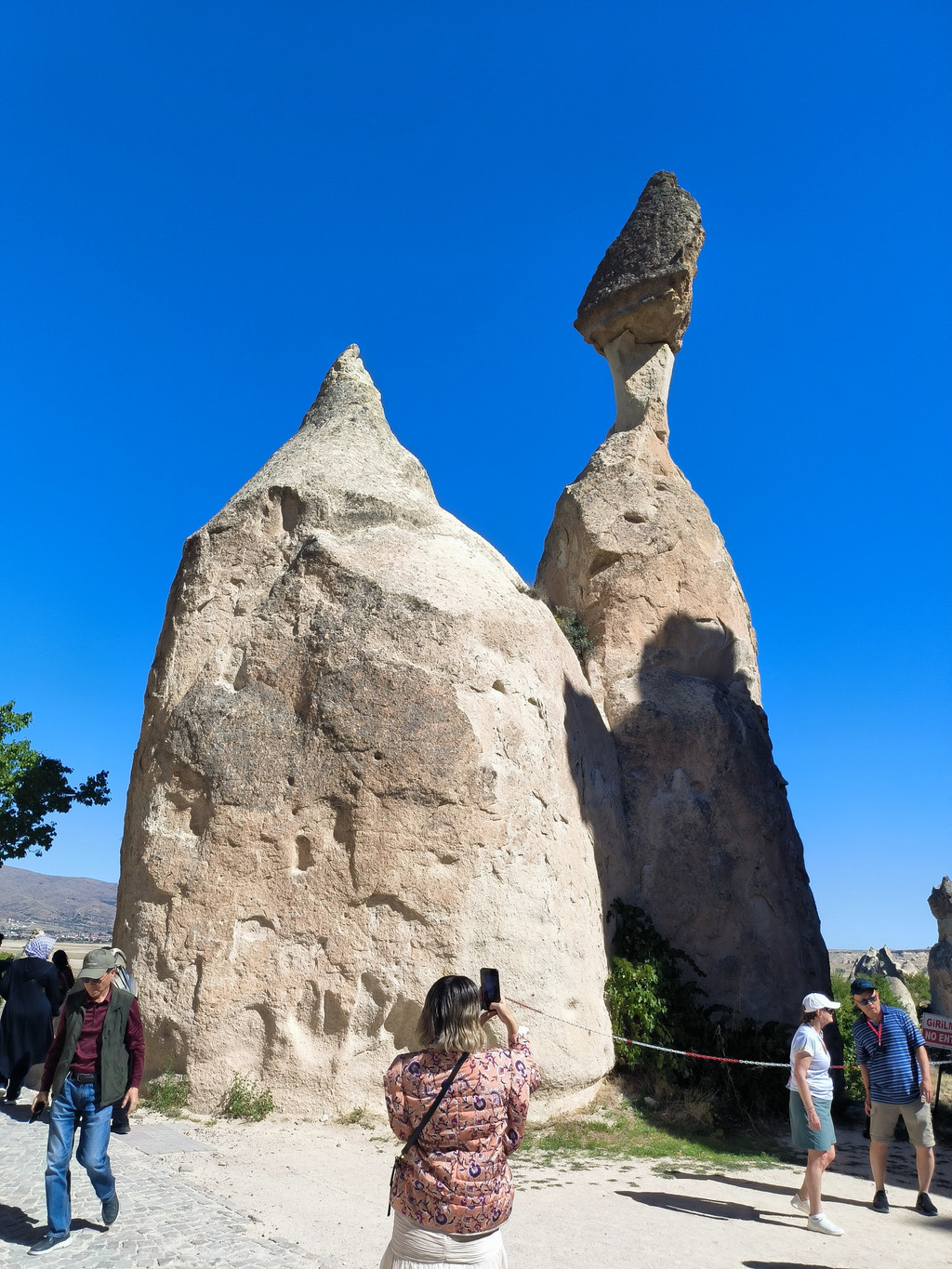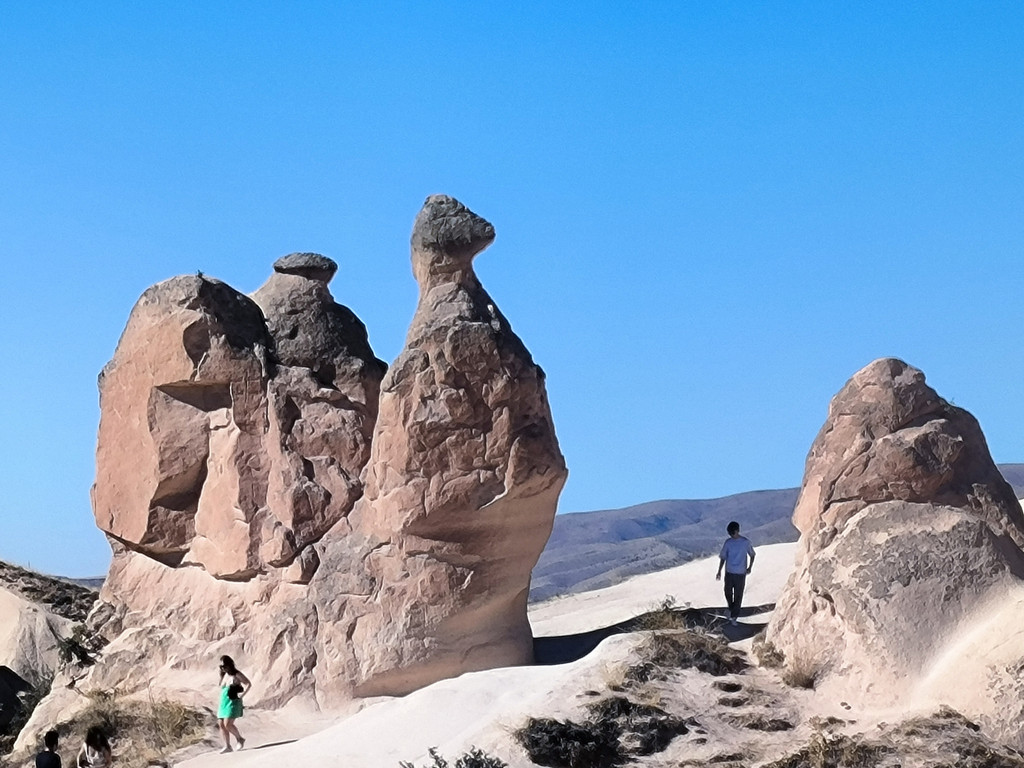 首先我们来到骆驼岩,这里是卡帕多奇亚地区形状最奇特、分布最集中的火山石锥群,数百个高度从几十米到100多米不等的石锥紧密排列在一起,各种峭石如林千姿百态,形状各异,无一雷同,其外观有的直立如笋、形似烟囱;有的尖耸如塔、巍然屹立,从不同角度观察就能看到不一样的形状,其中最近的就是骆驼岩,高傲地矗立在山坡上,迎接着来自世界各地的游客。