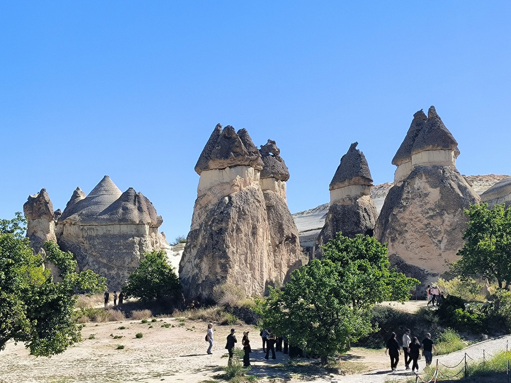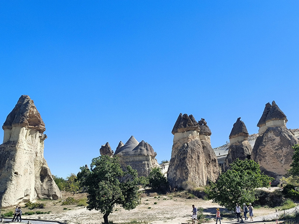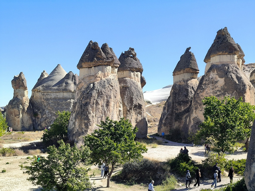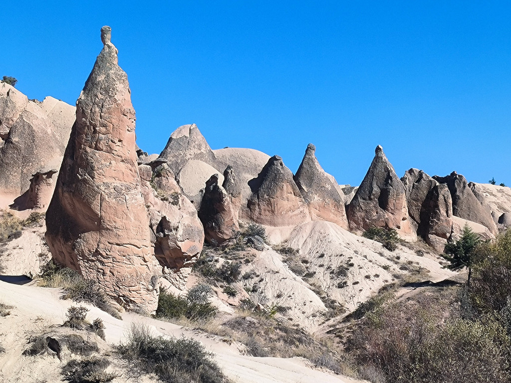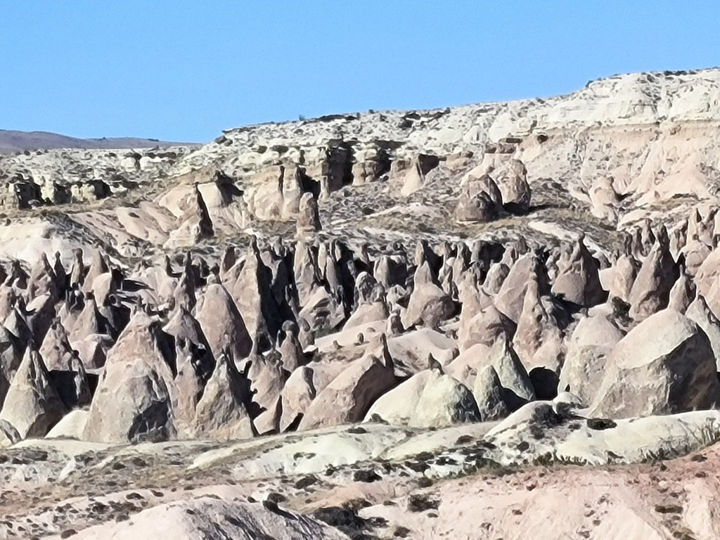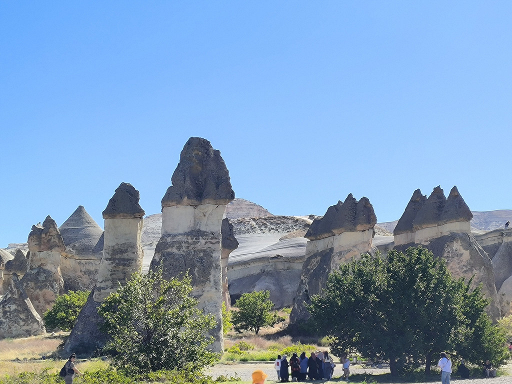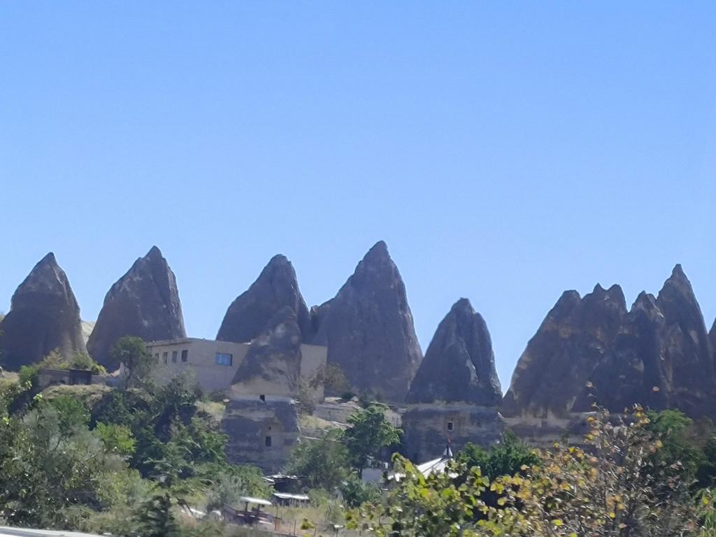 首先我们来到骆驼岩,这里是卡帕多奇亚地区形状最奇特、分布最集中的火山石锥群,数百个高度从几十米到100多米不等的石锥紧密排列在一起,各种峭石如林千姿百态,形状各异,无一雷同,其外观有的直立如笋、形似烟囱;有的尖耸如塔、巍然屹立,从不同角度观察就能看到不一样的形状,其中最近的就是骆驼岩,高傲地矗立在山坡上,迎接着来自世界各地的游客。