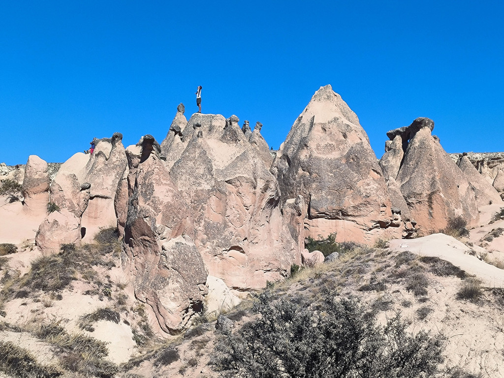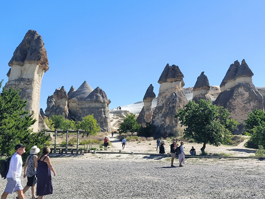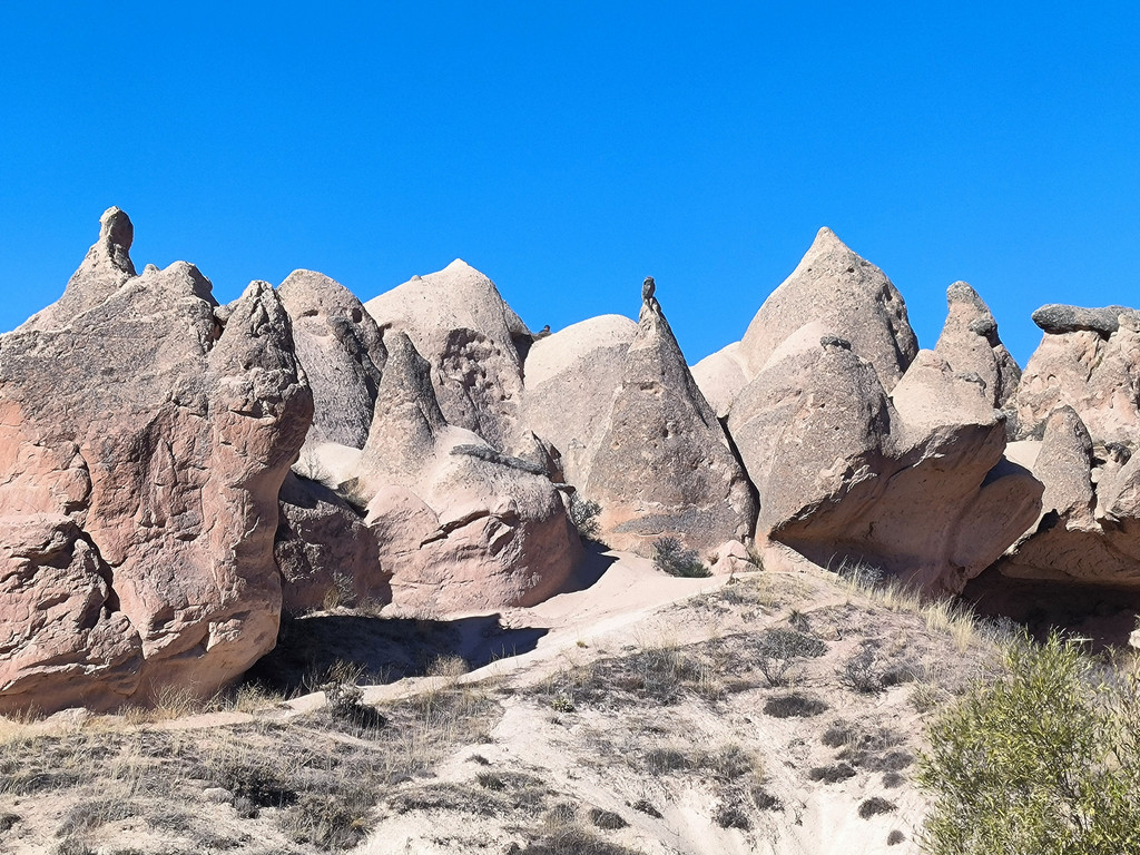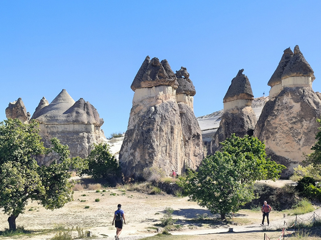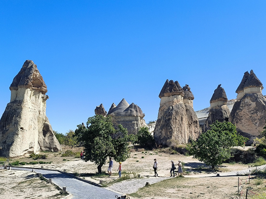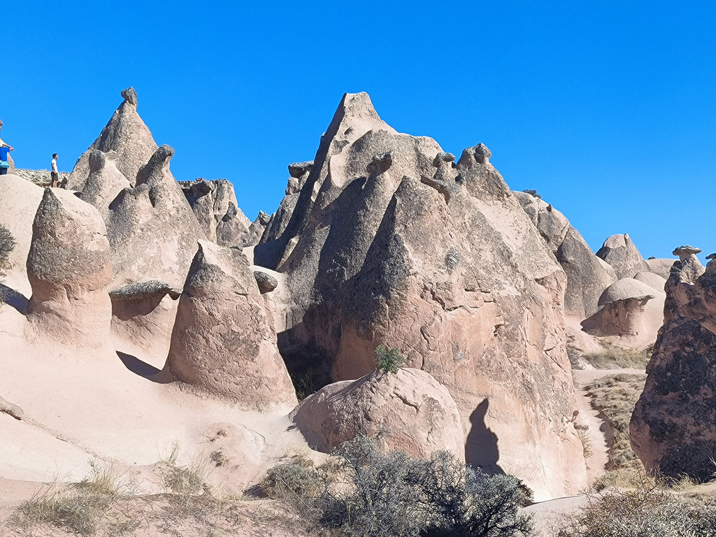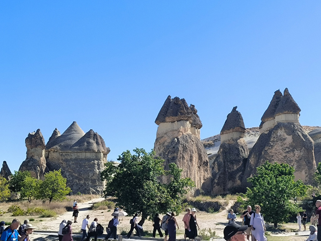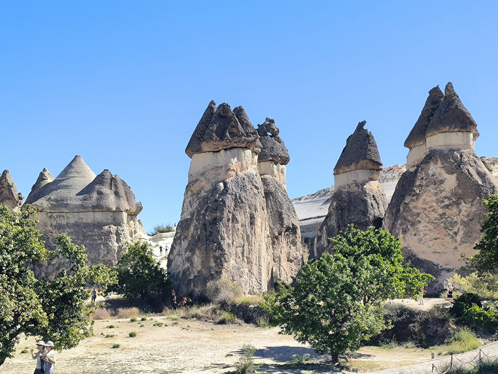 首先我们来到骆驼岩,这里是卡帕多奇亚地区形状最奇特、分布最集中的火山石锥群,数百个高度从几十米到100多米不等的石锥紧密排列在一起,各种峭石如林千姿百态,形状各异,无一雷同,其外观有的直立如笋、形似烟囱;有的尖耸如塔、巍然屹立,从不同角度观察就能看到不一样的形状,其中最近的就是骆驼岩,高傲地矗立在山坡上,迎接着来自世界各地的游客。