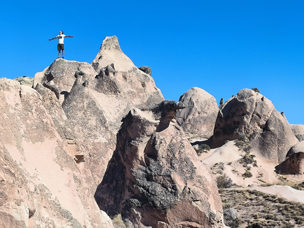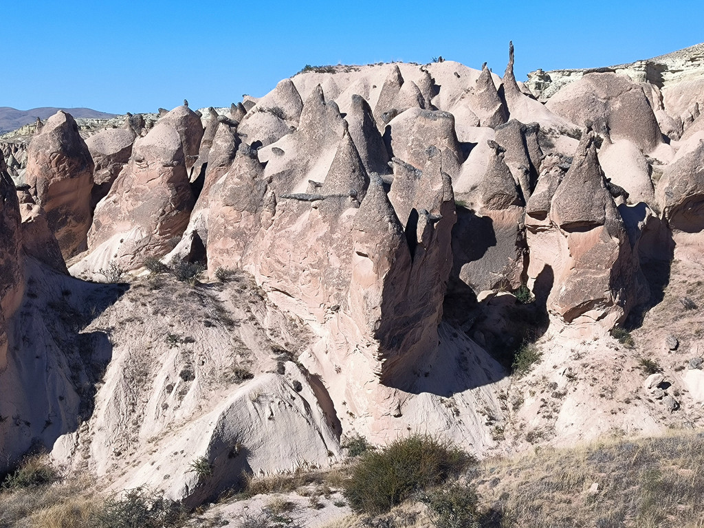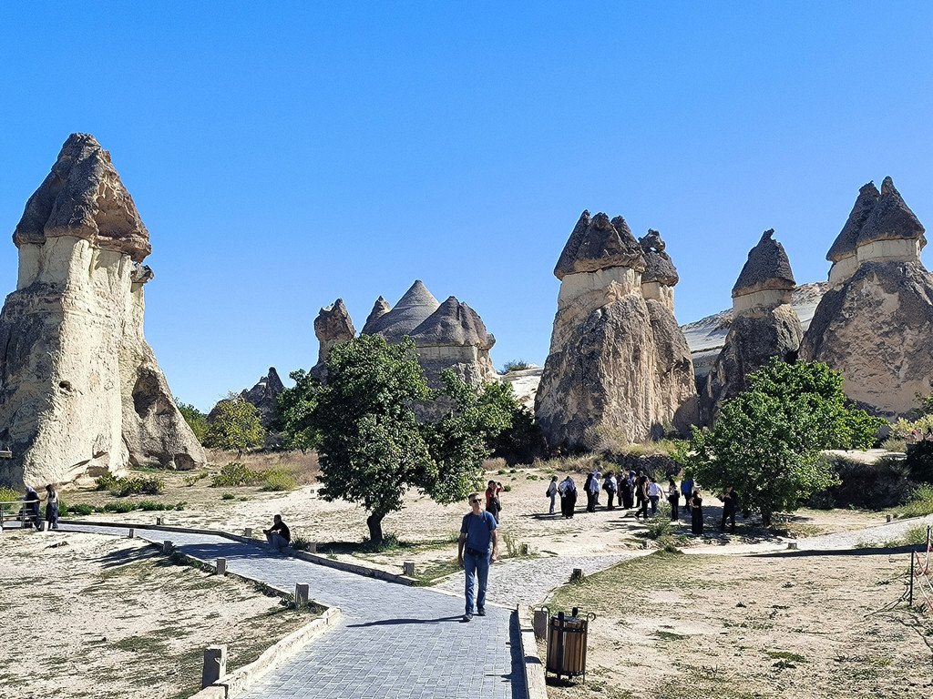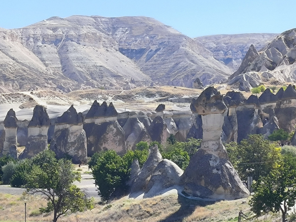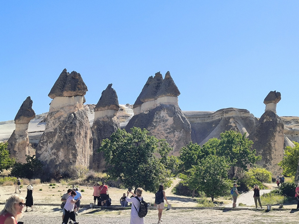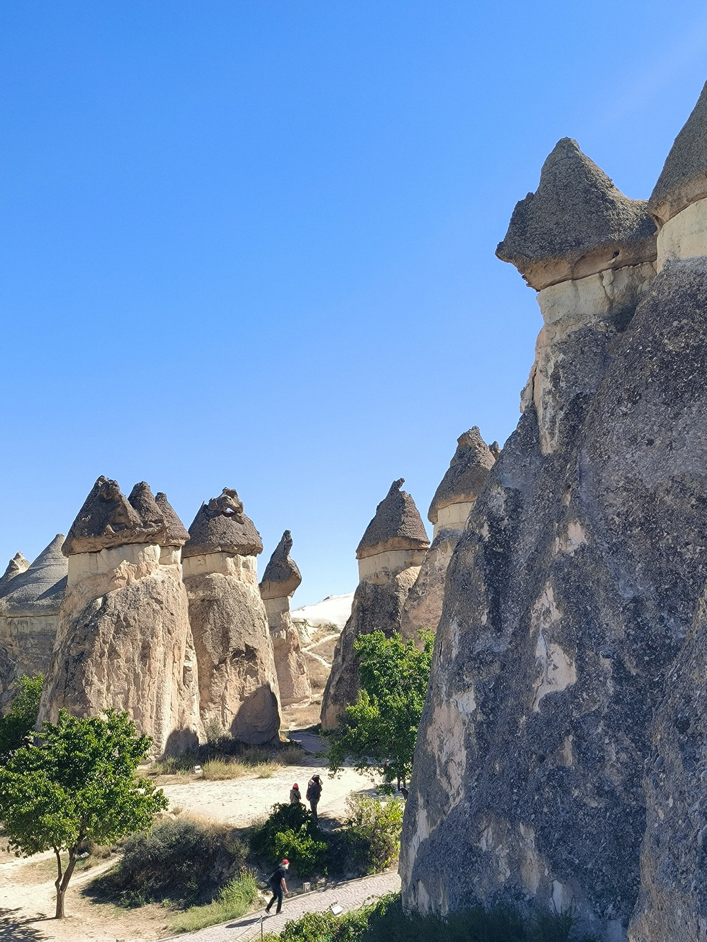 首先我们来到骆驼岩,这里是卡帕多奇亚地区形状最奇特、分布最集中的火山石锥群,数百个高度从几十米到100多米不等的石锥紧密排列在一起,各种峭石如林千姿百态,形状各异,无一雷同,其外观有的直立如笋、形似烟囱;有的尖耸如塔、巍然屹立,从不同角度观察就能看到不一样的形状,其中最近的就是骆驼岩,高傲地矗立在山坡上,迎接着来自世界各地的游客。