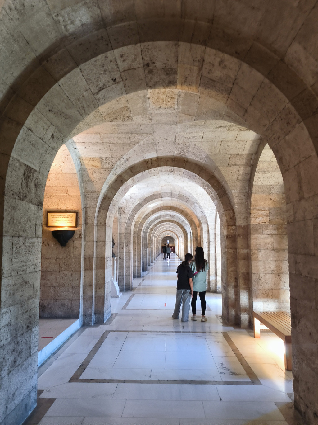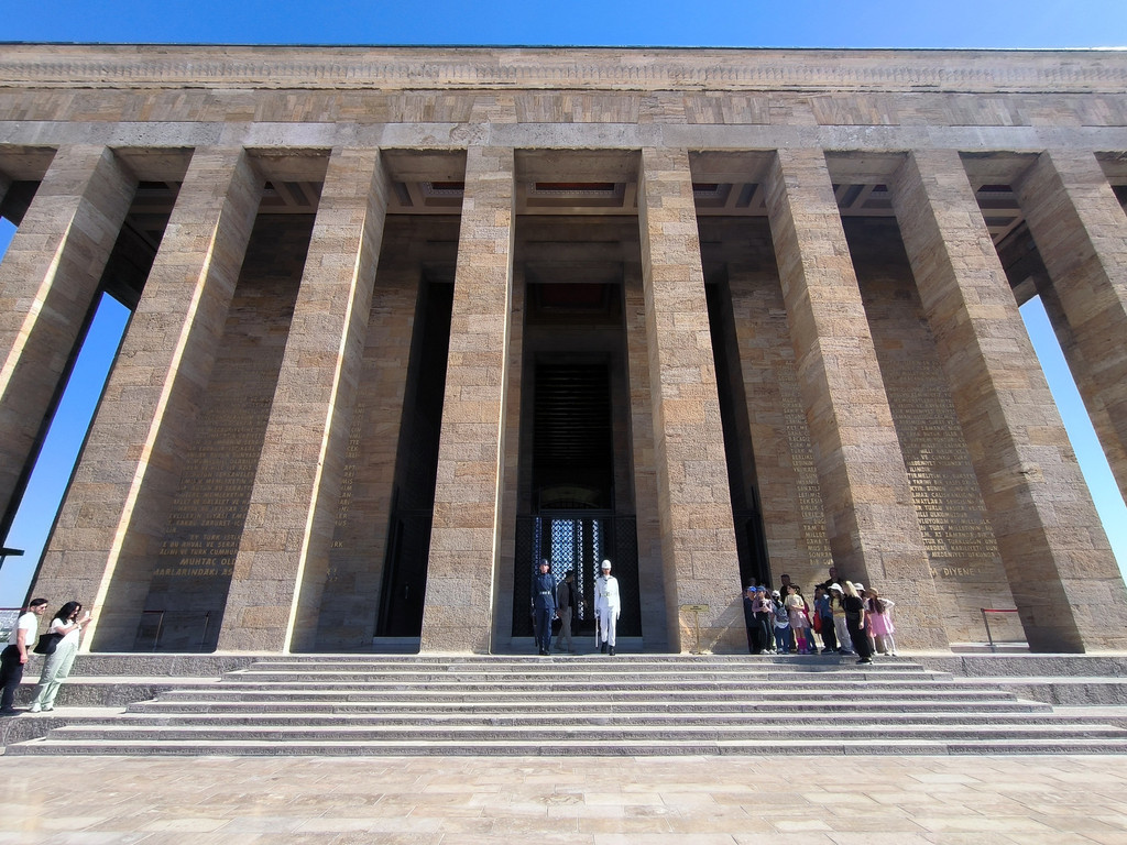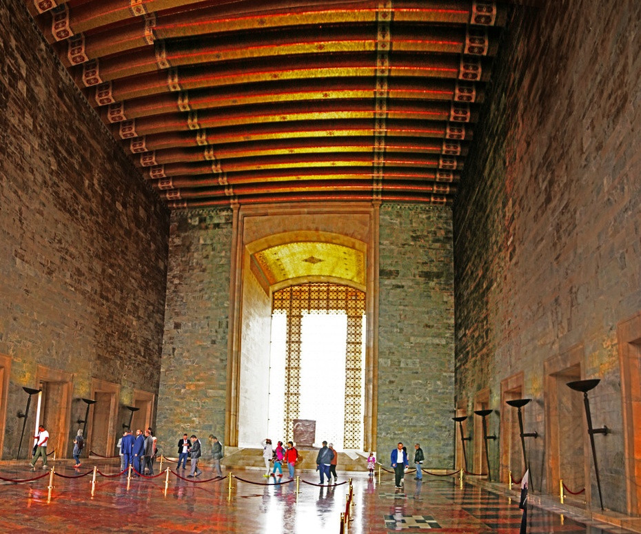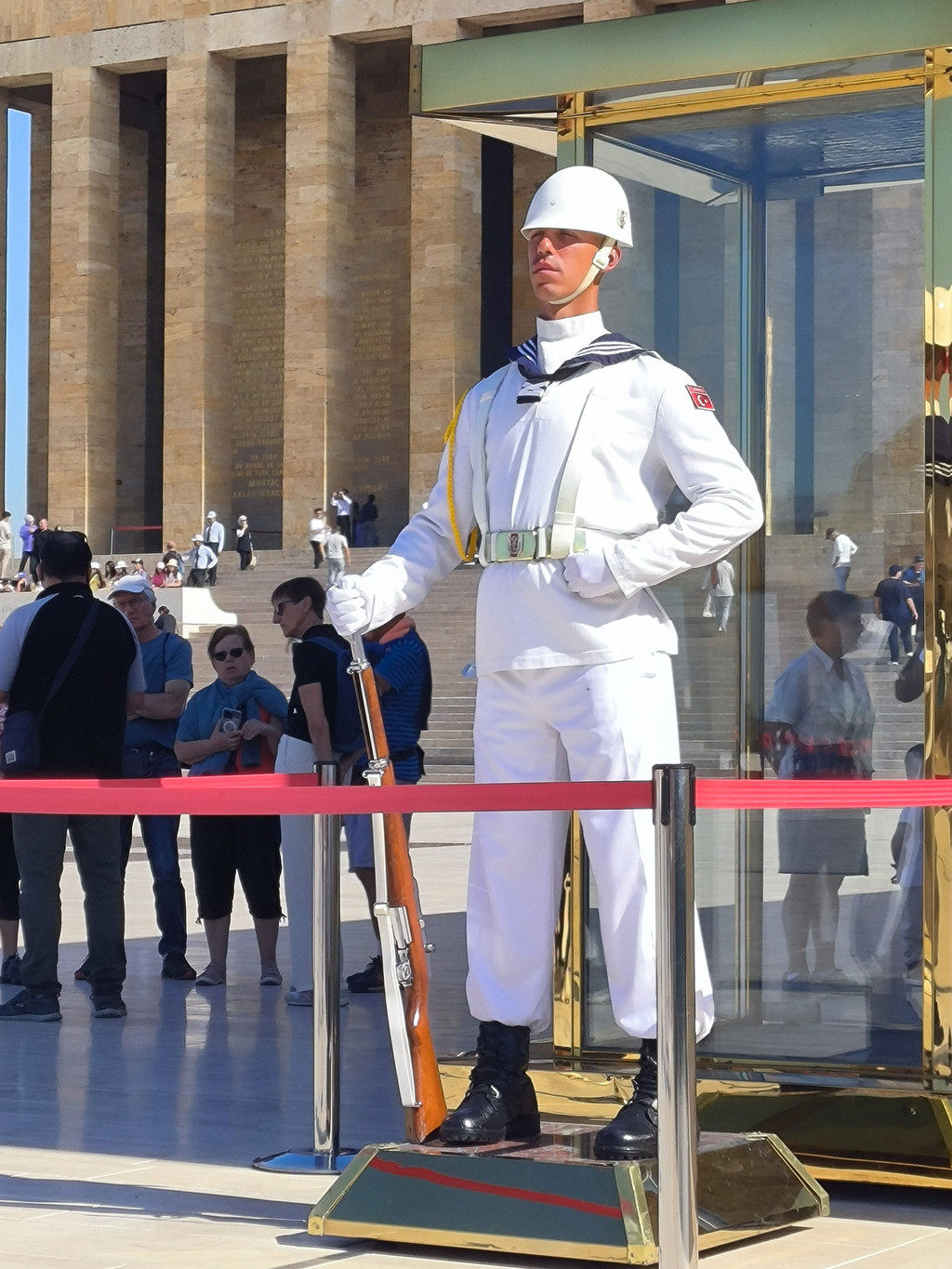 国父纪念馆位于距安卡拉中心约2公里的小山上,是将陵墓与博物馆集于一体的场所,包括公园、广场、陵墓及博物馆等,我们走进一片面积很大的方形广场,入口处有高大的警卫站岗,广场四周由回廊环绕,规模宏大,气氛庄严,站岗的士兵们一动不动,很多时候连眼睛都不眨,一开始还有人以为是雕塑,游客可以与他们合影,但不能打扰他们的执勤,士兵每两个小时会进行一次换岗和操枪表演,引得众多游人围观拍照。广场上的主体建筑是国父纪念馆,这是一座茶色石质长方形建筑,馆内天花极高,四周列柱围绕,馆内有一块黑色大理石墓碑,土耳其共和国创始人和首任总统穆斯塔法·凯末尔就葬在这里,墙壁上刻有凯末尔劝勉民众的文字。