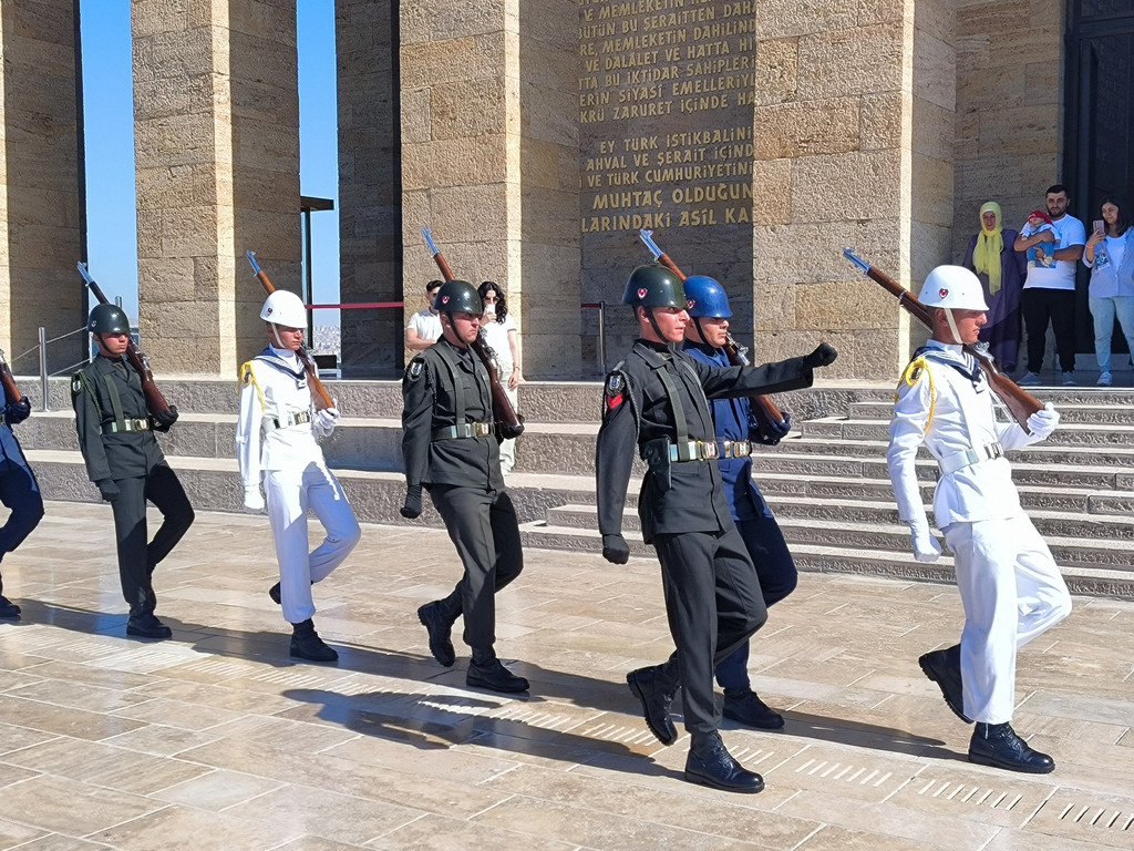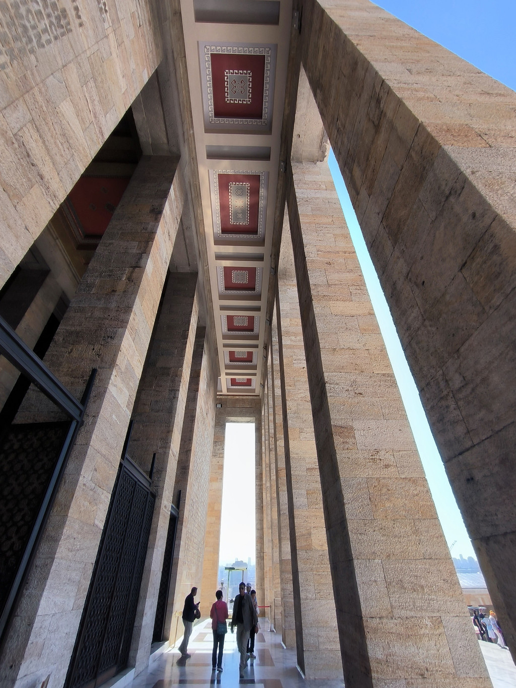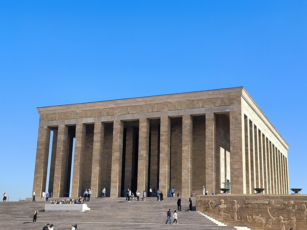 国父纪念馆位于距安卡拉中心约2公里的小山上,是将陵墓与博物馆集于一体的场所,包括公园、广场、陵墓及博物馆等,我们走进一片面积很大的方形广场,入口处有高大的警卫站岗,广场四周由回廊环绕,规模宏大,气氛庄严,站岗的士兵们一动不动,很多时候连眼睛都不眨,一开始还有人以为是雕塑,游客可以与他们合影,但不能打扰他们的执勤,士兵每两个小时会进行一次换岗和操枪表演,引得众多游人围观拍照。广场上的主体建筑是国父纪念馆,这是一座茶色石质长方形建筑,馆内天花极高,四周列柱围绕,馆内有一块黑色大理石墓碑,土耳其共和国创始人和首任总统穆斯塔法·凯末尔就葬在这里,墙壁上刻有凯末尔劝勉民众的文字。