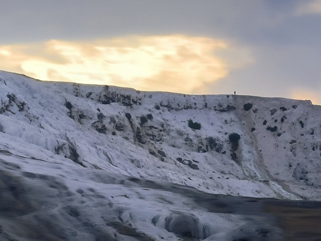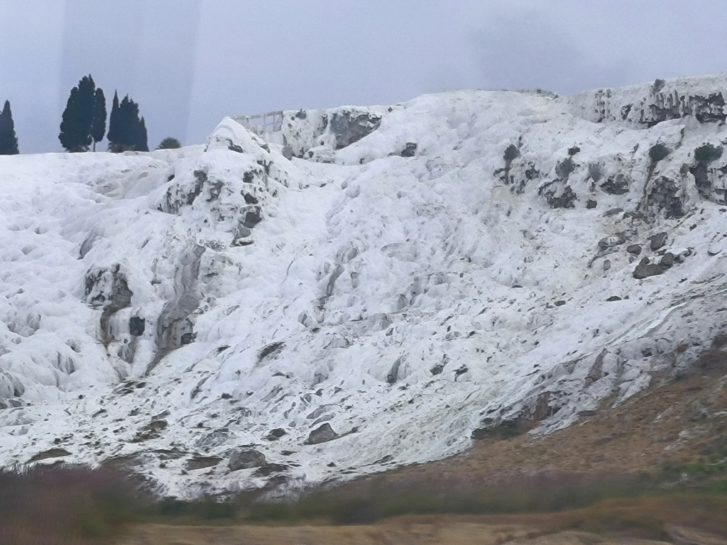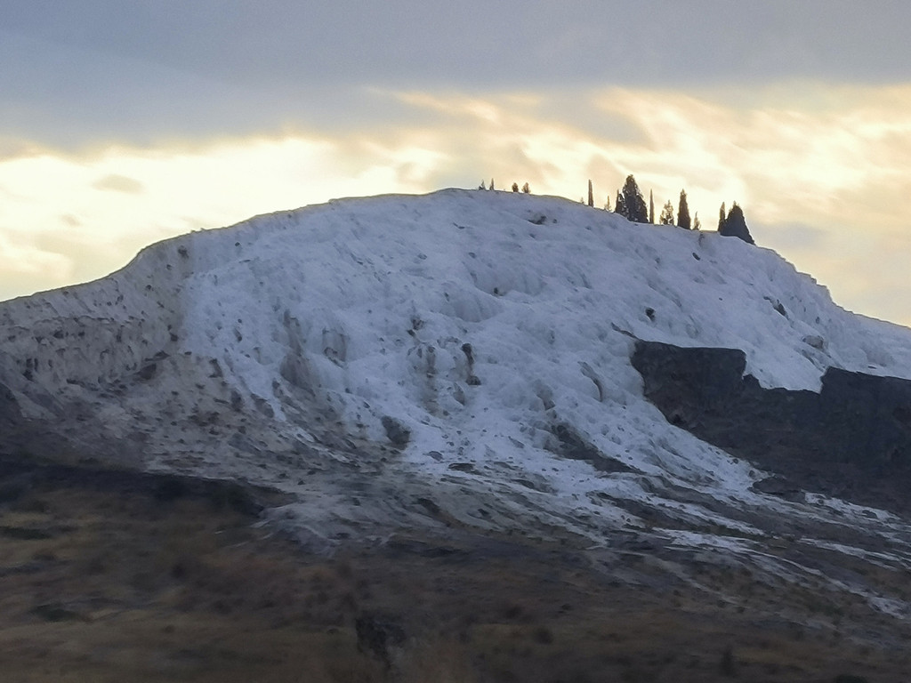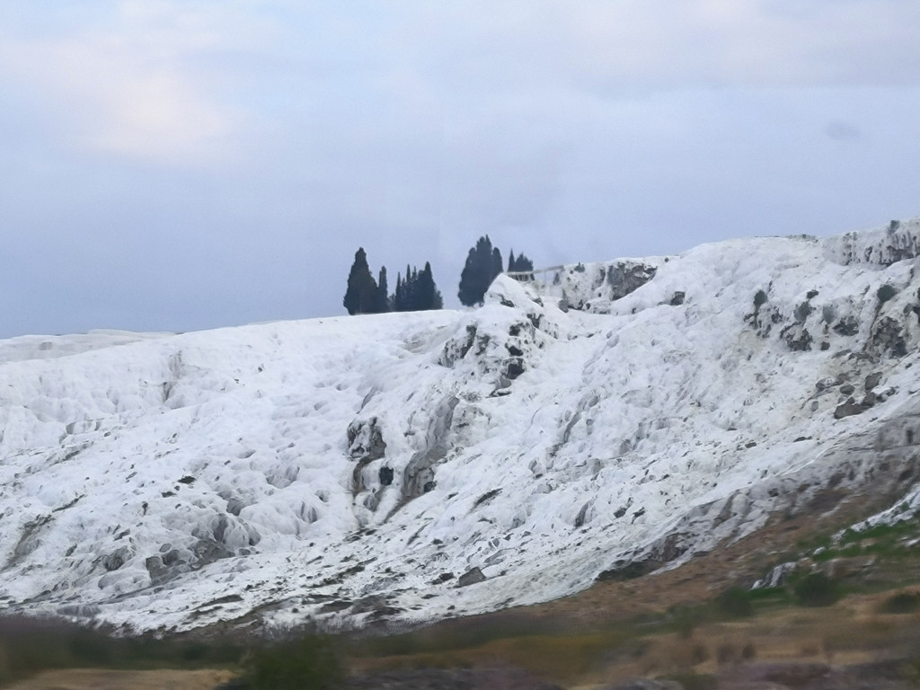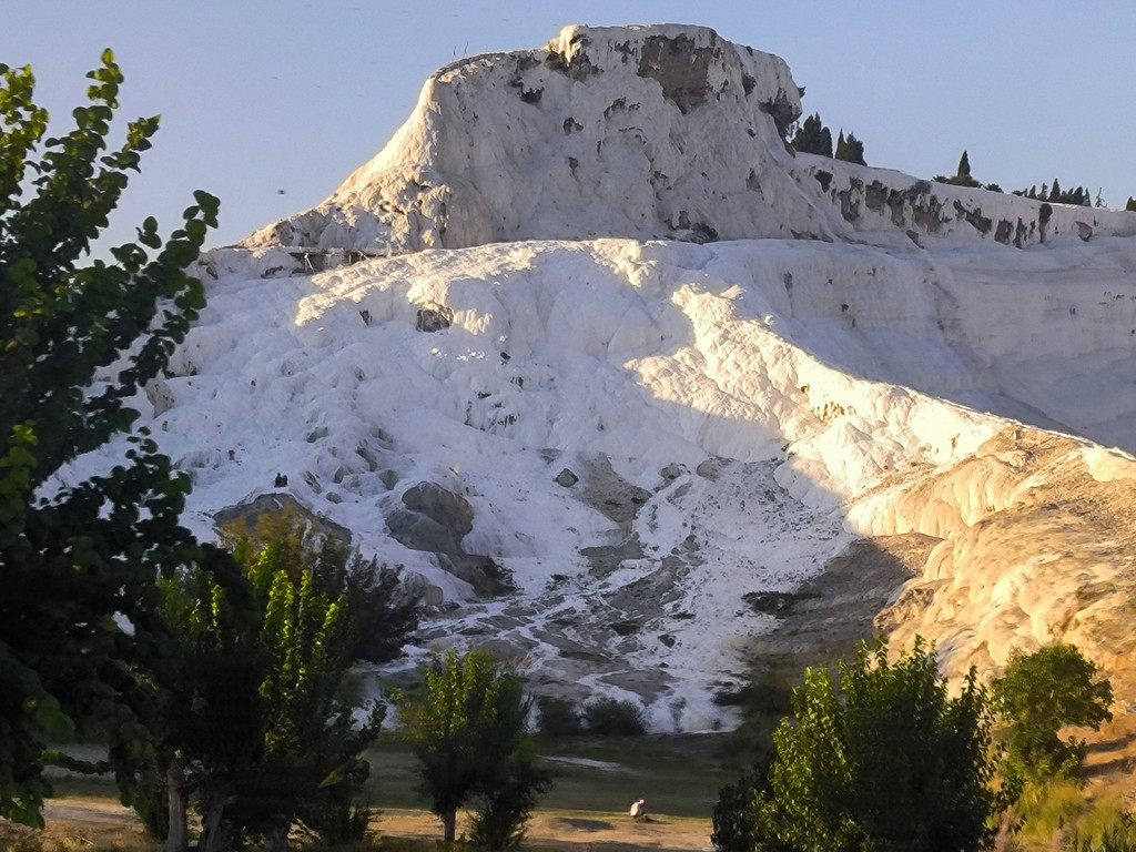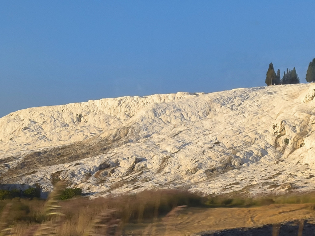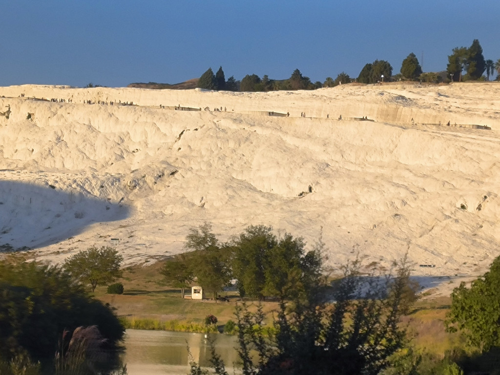 今天的车程长达8个小时,傍晚时终于到达帕穆克卡莱村,在车上已看到棉花堡的景观,据说棉花堡的落日落很美,但我们计划的是明天上午游览。棉花堡实际的名字为帕姆卡莱,意为“棉花宫殿”,棉花堡是意译的中文名字,为一高160米、长近3公里的雪白色山丘,这里地下石灰质温泉丰沛,水温常年保持在36-38度,温泉水从地底深处涌出,再从丘陵上沿边缘泻下,富含石灰盐的温泉水常年不息,所到之处历经千百年钙化沉淀,在地表上形成层层叠叠的白色阶梯,最后形成如此洁净壮丽的自然奇观。