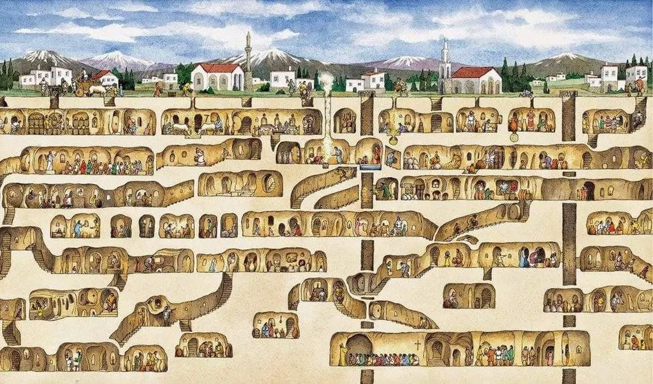 卡帕多奇亚是自然、文化双“世遗”,不仅拥有上述岩石自然奇观,人文历史也很悠久,由于火山喷发而构成的独特地理特征,导致这里树木植被稀少、岩石众多,在数千年前由于缺乏建筑材料,几乎没有木质的房屋,当地人便就地取材,在松软的石头上开凿岩洞,将其作为自己的住房或教堂。在罗马和拜占庭时期,这里又成了早期基督徒的避难所,许多虔诚的教徒纷纷逃难到此,发现这个地方的岩石相当适合挖凿建屋,且复杂的地形更适合躲避罗马军队的追杀,现存的大多数教堂、修道院及地下城,就是在公元四世纪到十一世纪发展兴盛起来的,迄今为止在卡帕多奇亚已经发现的地下城多达36座,其中凯马克利地下城是最大的、也是最具人气的地下城,