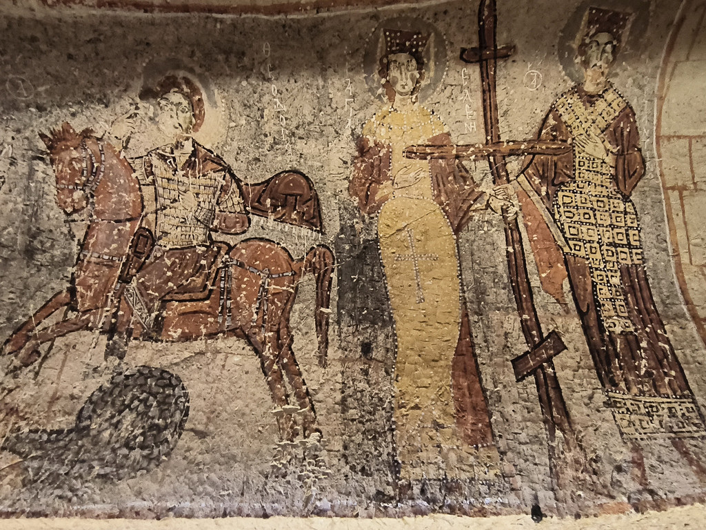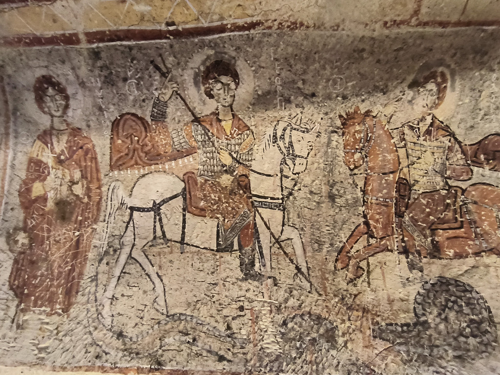 格雷梅原意即为“让你看不见”,教堂内部刻画着色彩斑驳的壁画,大部分主题讲的是圣经中的故事,有耶稣诞生、犹大背叛等主题内容。这里随处可见被掏空开窗的山体,可以想象当时有多少基督徒生活在此,真可谓信仰让人无坚不摧,但后来这些壁画曾遭受到一次空前的浩劫,异教徒反对人像崇拜,于是有的壁画全部被毁,有的则是将人物的脸部刮去。现在为了便于人们区分,根据每座教堂壁画的内容及特点分别进行了命名,“苹果教堂”得名于壁画中某人手持苹果,“神蛇教堂”的壁画描绘的是圣乔治击退蛇的场景,“拖鞋教堂”壁画中的人物个个穿拖鞋,