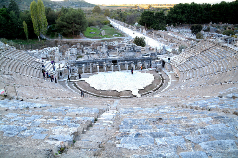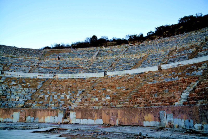 后者位于半山腰,是一座半月形的露天剧场,规模宏大,视觉震撼,前面的舞台非常精致,大理石浮雕描绘了一系列的神话事件和故事,后面的观众席看台呈弧形扇面状左右展开,一排排递升竟多达50层,可容纳12000人,我从左到右走了一圈。大型露天剧场是古希腊、古罗马城市的标配,各地现仍存不少规模巨大的古剧场,其中最大的一座位于土耳其伊兹密尔省的以弗所古城遗址内,由罗马人于公元117年间改造而成,