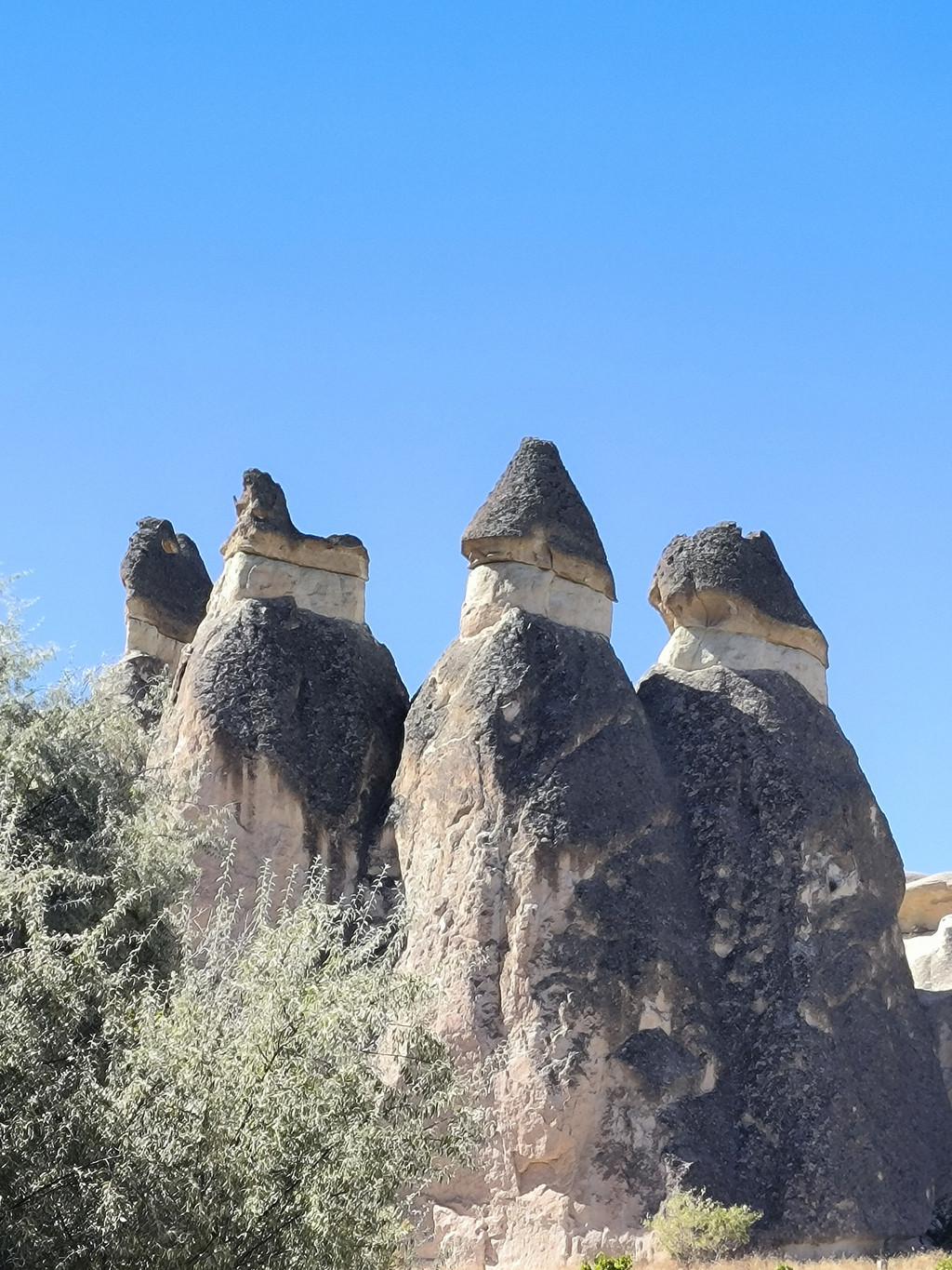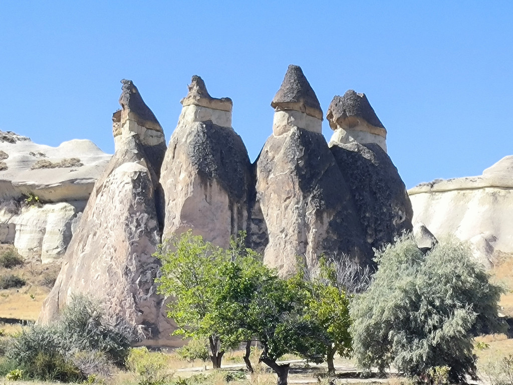而这顶黑色的帽子实际上就是典型的火山灰岩层,下部则呈浅红色、赭色或棕色,有的则呈灰色、土黄色或乳白色,有的脖子部分细得似乎马上就要折断了。这是自然界长期风化的结果,锥顶的硬度较高,下面的硬度较低,经过长时间风化后呈现出蘑菇的形状,有些高度可达40米,因像烟囱一样的被称为“精灵烟囱”,我认为在卡帕多奇亚众多的石林山谷中,最奇、最美、最可爱的非蘑菇谷莫属。