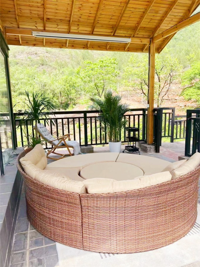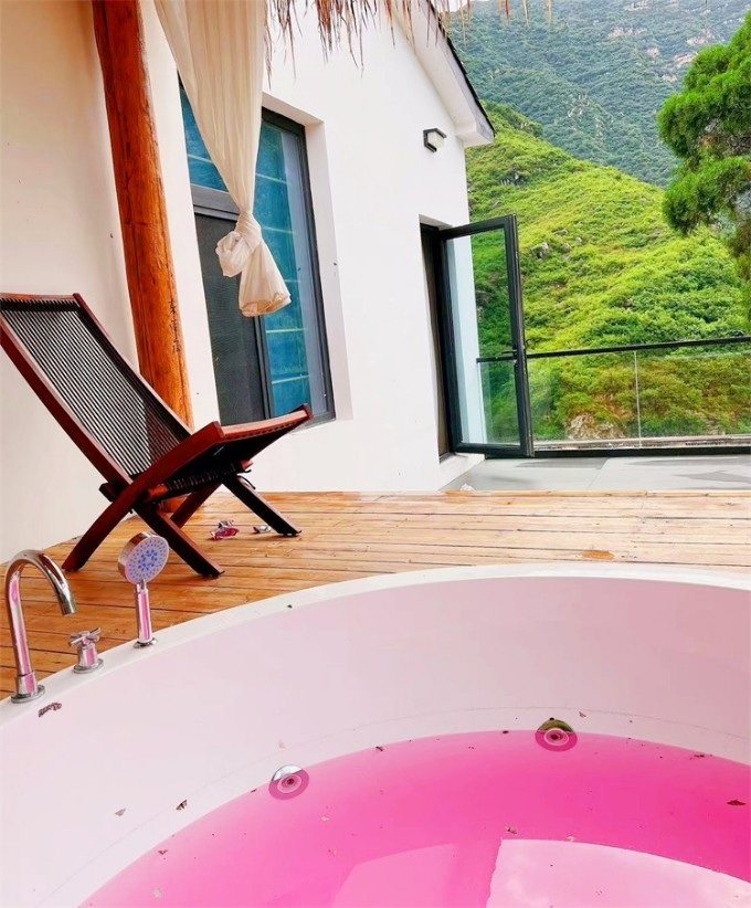 二楼的客房外面有山林景观的大浴缸,可以躺在浴缸里一边泡澡一边观赏山景,如果喜欢安静的可坐在沙发椅上,对着山林,喝一杯热茶,看着远处的风景,来这里的游客都能感受到自然的气息,院前溪水潺潺、院后青山相依,环境幽雅、舒适。民宿整体建筑风格为田园风,活动场地大,档次高、娱乐设施齐全的一处度假胜地。