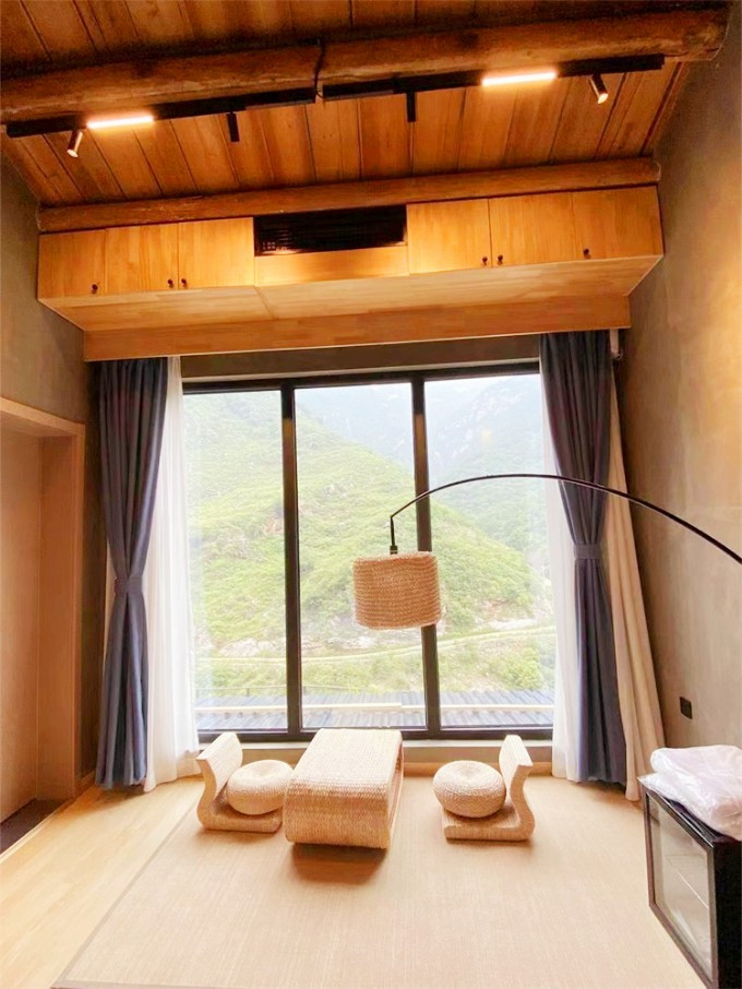进而让阁楼内的采光变得非常不错,真的是美观又舒适!这里大面积采用落地玻璃,景观效果特别棒,游客可以把山谷都收入眼中,结合顶面的木梁吊顶,致使全屋显得非常的华丽高贵!原木色的整个空间温馨自然,而又富有朝气,却是别样的雅。