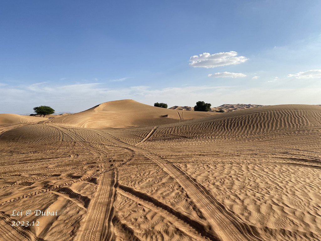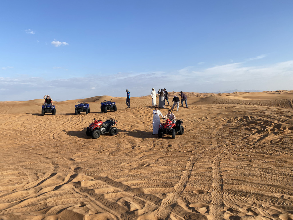下午沙漠冲沙,向导来接,一车六人,其余两位来自菲律宾的富裕阶层,冲沙摩托350AED一辆,四驱大车800AED一辆,儿子很想骑摩托,所以家里来了两辆摩托,跟着向导在沙漠里驰骋,其实没开太远,沙场中间有猎鹰等人拍照,沙地摩托拐弯挺费膀子。