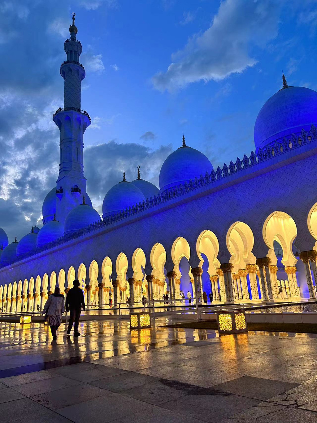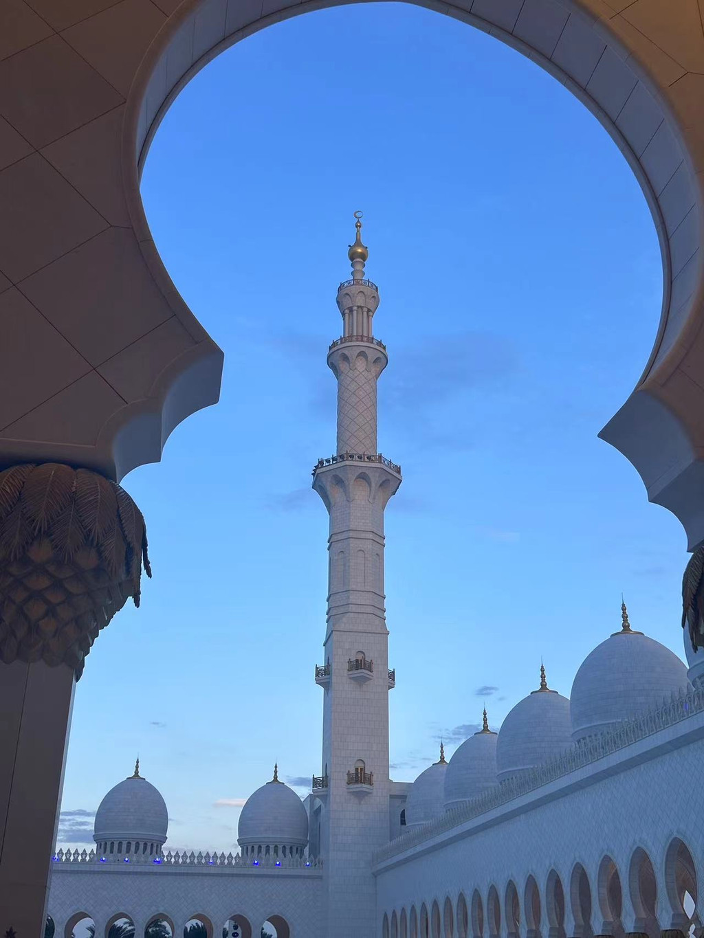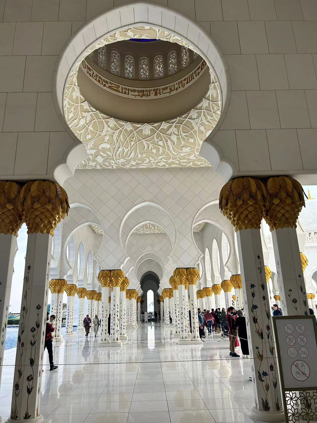 下午根据友友们的攻略安排傍晚去阿布扎比第一名景点,大清真寺。大家要注意虽然这个景点不收费,但是要预约取得预约二维码才能进,而且中国手机不能网上弄,只能现场机子拿号。之前在所有攻略中都没看到,所以我们排了一个小时队进不了才又出去机子取号,幸好和保安叔叔说了,不用重新排队直接进去,也是一番折腾。早在飞机上我就看了大清真寺的建筑纪录片,全球最大的水晶灯,全球最大的手工地毯,全世界搜罗最白的大理石,全手工画的花纹......如果在迪拜我看到的是钱堆出来的奇迹,在阿布扎比清真寺,我感受到更多的是虔诚(和钱)堆出来的奇迹。那种文化带来的震撼无以言表,他们用自己的手、努力和心血,汇聚成这个伟大建筑,向世界介绍他们的信仰。