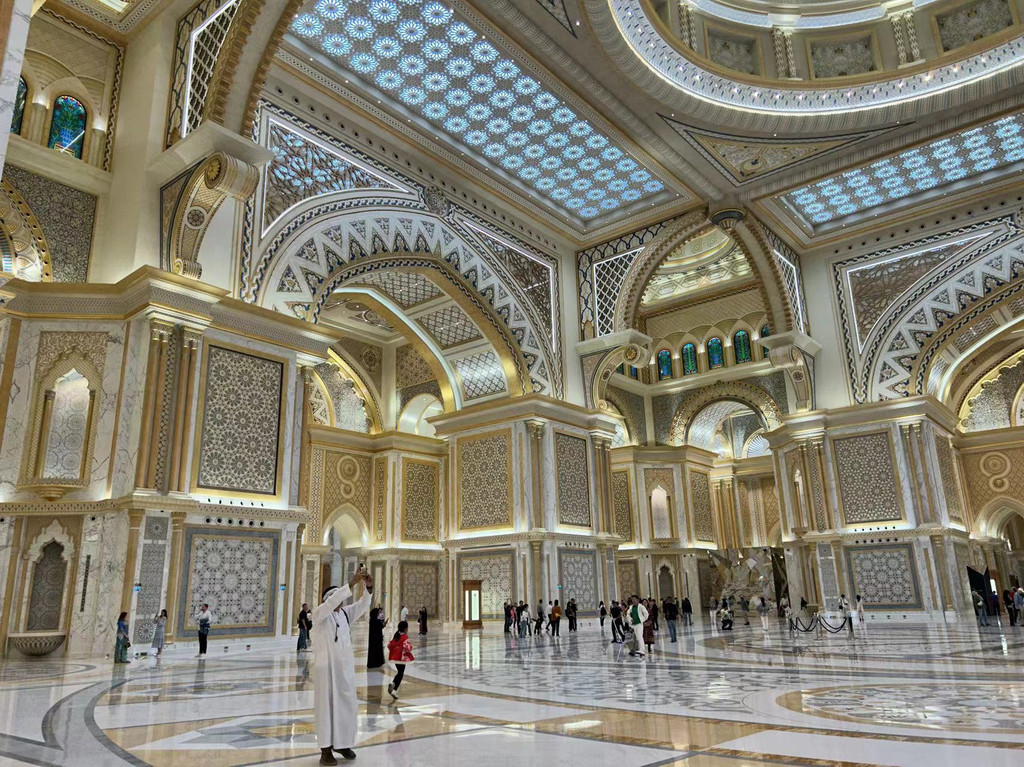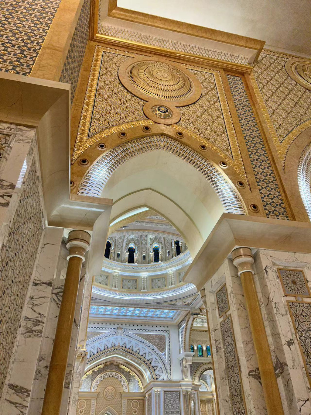 第六天早上有个小插曲,我们一早收到阿布扎比警方发的短信说今天阿布扎比天气不好,建议大家非必要不外出。带着一丝不安还是去了总统府,幸好没有关门。总统府又是另一个钱堆出来的建筑。在的士上和司机聊,问他现在总统是不是还在这里住,他说总统家族有很多宫殿,他不知道总统现在在哪里住,多少透露了一些贫富悬殊的无奈。对总统府的形容可以概括为8个字,金碧辉煌美轮美奂,纯纯的土豪气息。