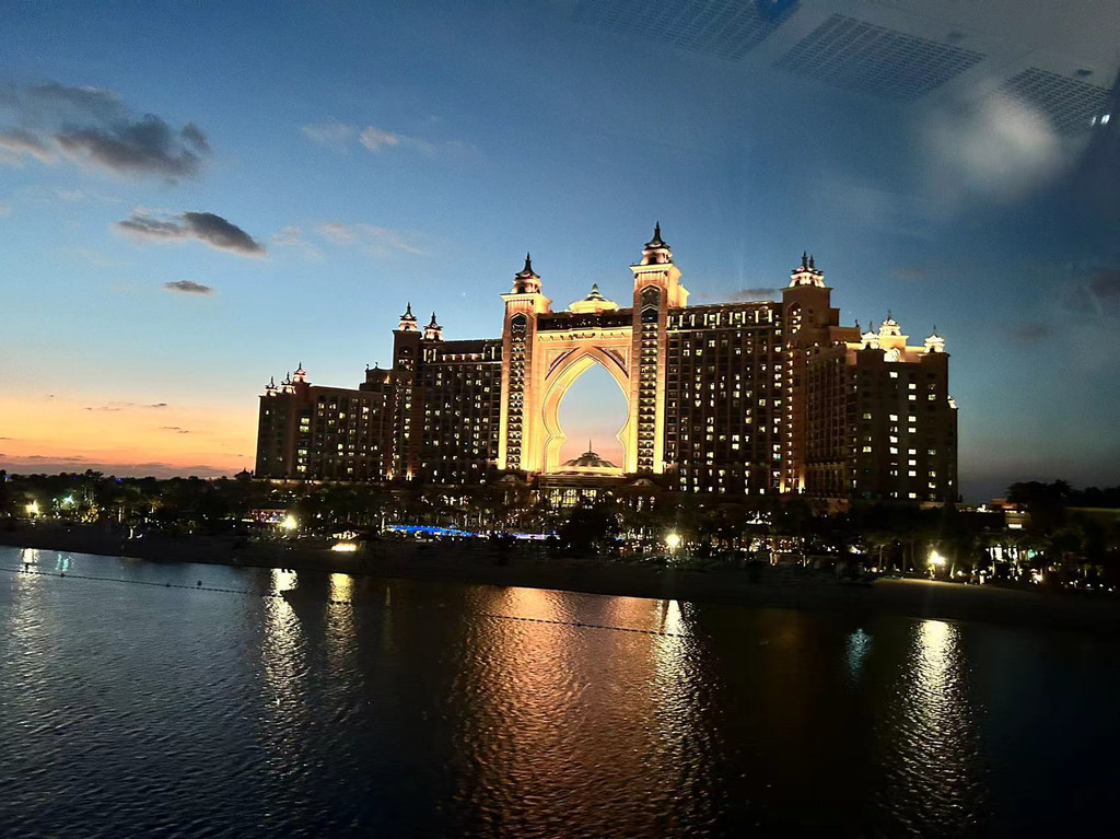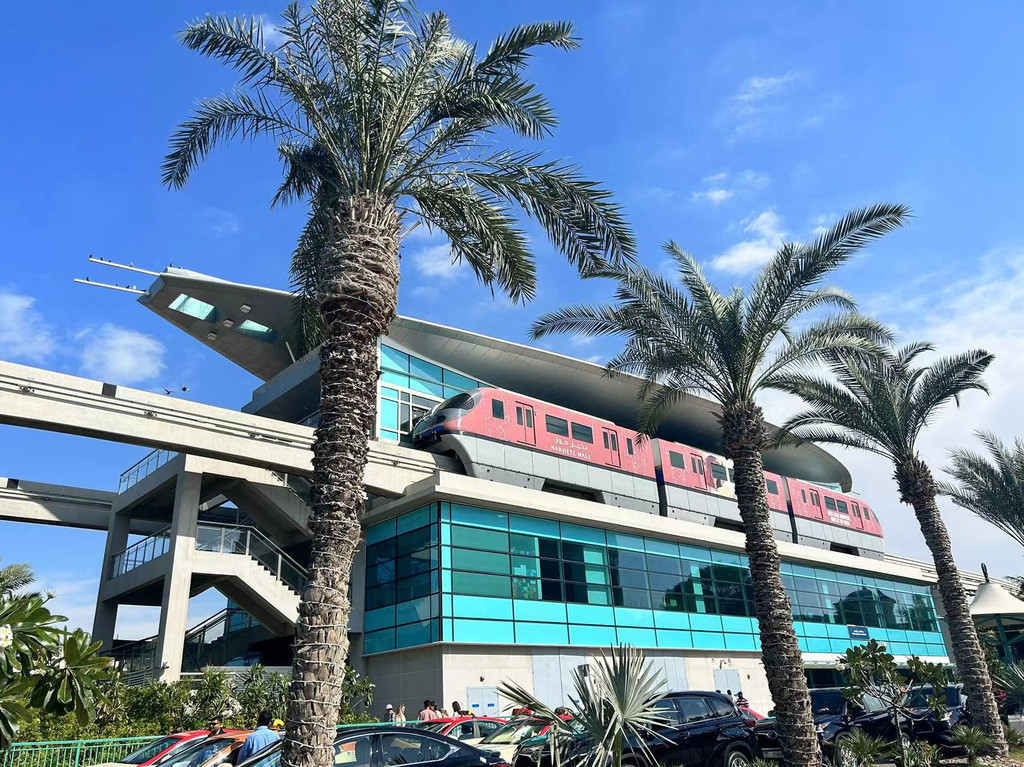 在酒店补眠了一会,就开始棕榈岛轻松游。坐酒店接驳车去到轻轨站,就坐轻轨到棕榈岛的瞭望塔,短短两个站(可能就5分钟?),来回票单人30迪拉姆,人多的话成本高过打车。但轻轨架空在岛上的中心线,可以看到岛上的景色,尤其是日落时分的亚特兰蒂斯酒店绝美,建议还是可以尝试一下。