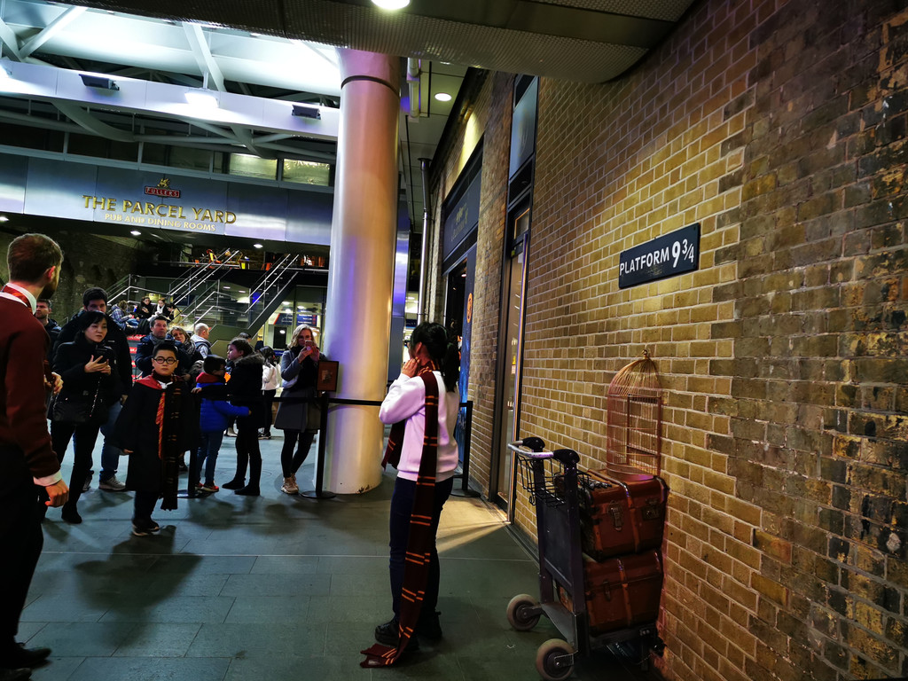 趁雨下的小了,周日各种店又不开门,赶紧去9¾站台看一下。虽说我不算地道的哈利波特迷,好歹也算是看全了的,赫赫有名的9¾站台咱们肯定要打个卡的。9¾站台在国王十字车站,却不在真正的站台里,它独立在大厅的一个角落,供哈迷们排队拍照。哈迷们有点多,估摸着排队起码排半个小时,而且也没有人能帮我拿包换上哈利波特的围巾拍照,于是打了个卡就悻悻地回去了。