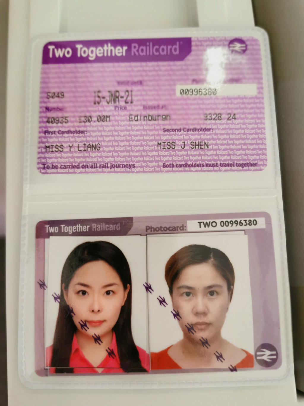 火车票:英国各个城市间的交通都是火车,所以事先在trainline上面买好了火车票,选的都是two together railway的优惠票,英国的火车有很多种优惠票可以选择,节约了不少钱。我们是带好照片去到英国办理two together railway card的,年费30磅,一年有效期,前提是同样的两个人出行。