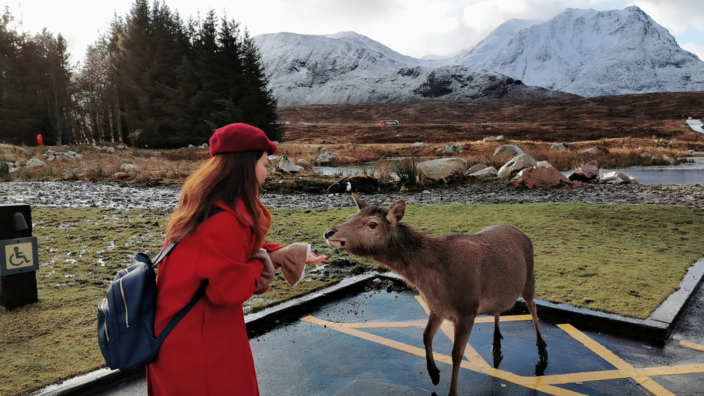 高地的小鹿很温和,与奈良的“流氓”鹿们完全不同,它们更像是家养的鹿,有吃的就吃,没有就安静走开,还有些怕人。奈良的小鹿则是看到鹿饼就围攻上来,常常看到一群鹿围着一个人的景象。当时我的饮料放在书包边上的插袋里,被“流氓”鹿看到之后就生生地用嘴拖了出来,如果我再晚一步发现,包里的鹿饼也会被全部拖出来。所以,我简直太喜欢高地的鹿了,面包放在手心里喂它它都会慢条斯理地吃,可有礼貌了。