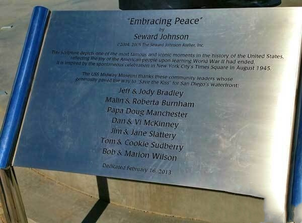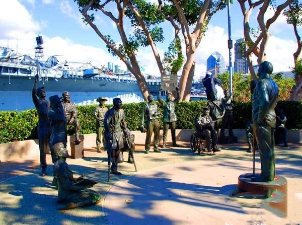 在港口的广场上,记者除了看到“胜利之吻”的雕塑外,附近还有一组为纪念二战期间美国军人出生入死、不怕牺牲精神的群雕,雕塑内容表现了由一位脱口秀演员表演,众多美国海军伤员在此聆听的景象。伤兵们的形态各异,有的站着,有坐在轮椅上,还有的架着双拐,他们神情专注的兴奋表情,各个都被塑造得活灵活现,栩栩如生。