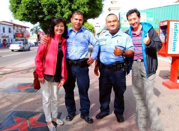 正在艺术中心参观时,两位墨西哥巡逻的警察途径到此,王导热情地相邀他俩与大家合影留念。两位警察欣然应允,不仅不厌其烦地分别与团友们留影,临别时,他们拿出自己的手机也留下了一张与团友们的合影。看来中墨两国人民的友谊真是亲密无间啊。