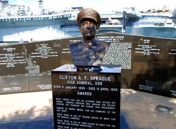 在这组群雕不远处还有一座雕像,上面是美国海军名将克利夫顿•艾伯特•弗雷德利克•斯帕格(CLIFTON A•F•SPRAGUE)少将,在二战期间,斯帕格将军因战绩卓著,屡立战功,曾荣获了很多美国海军的勋章。