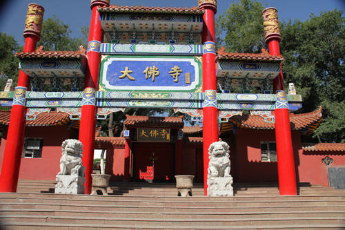 往前走,是一座大佛寺,这是一座汉传佛教寺庙。原古庙群沿红山脚下,由东向西排列:东端是大佛寺,中间是玉皇庙,西端是地臧庙。当年的红山古庙群曾是乌鲁木齐古典建筑的荟萃,也是庙会游览的胜地,每逢庙会,红山的庙宇全部开放酬神演戏,朝供不绝。