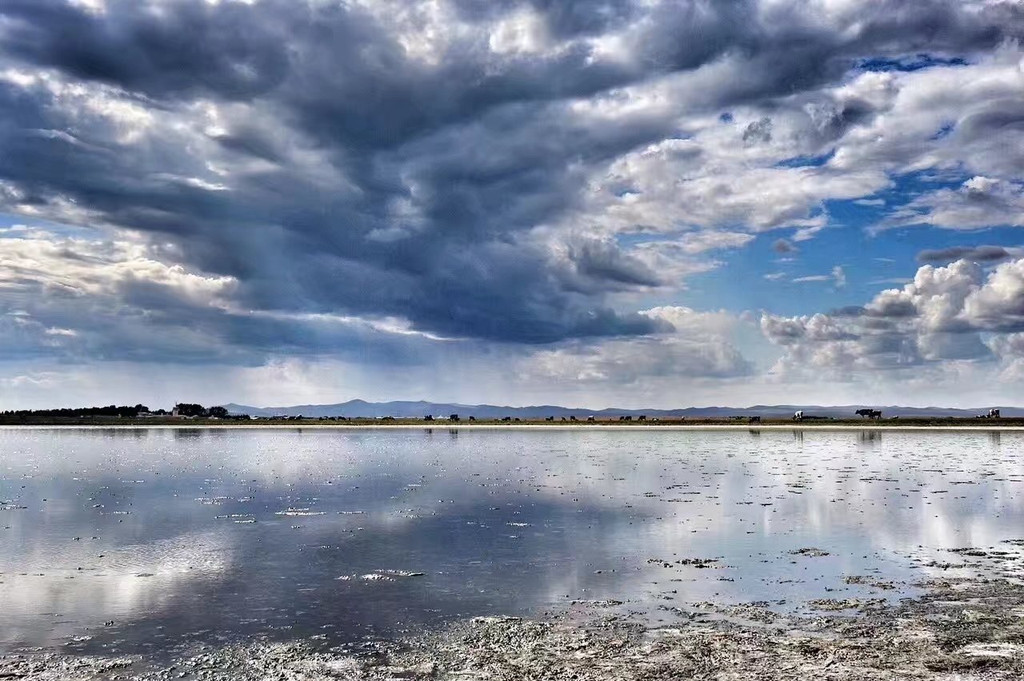 这是天地相接的地方,一缕阳光透过厚厚的云层,遥望去好似传说中的仙女下凡,打破这平静的湖水。
