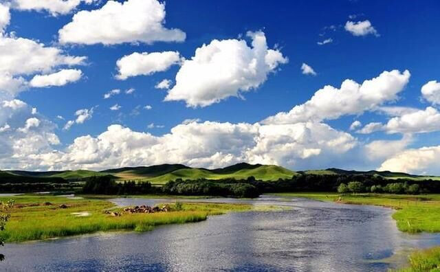 璀璨的日光,照射着莫日格勒河,蜿蜒曲折,在蓝天和白云映衬下显得更加壮阔。
