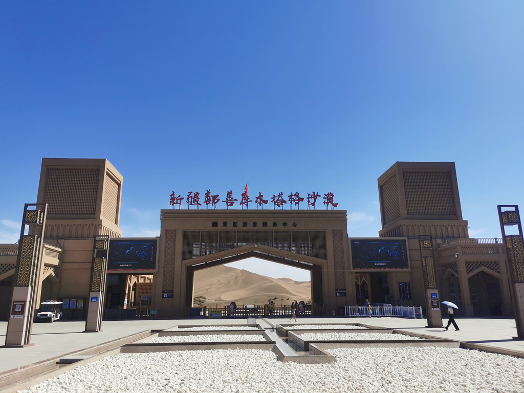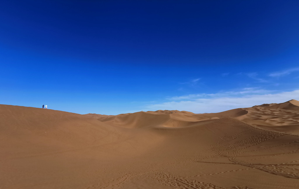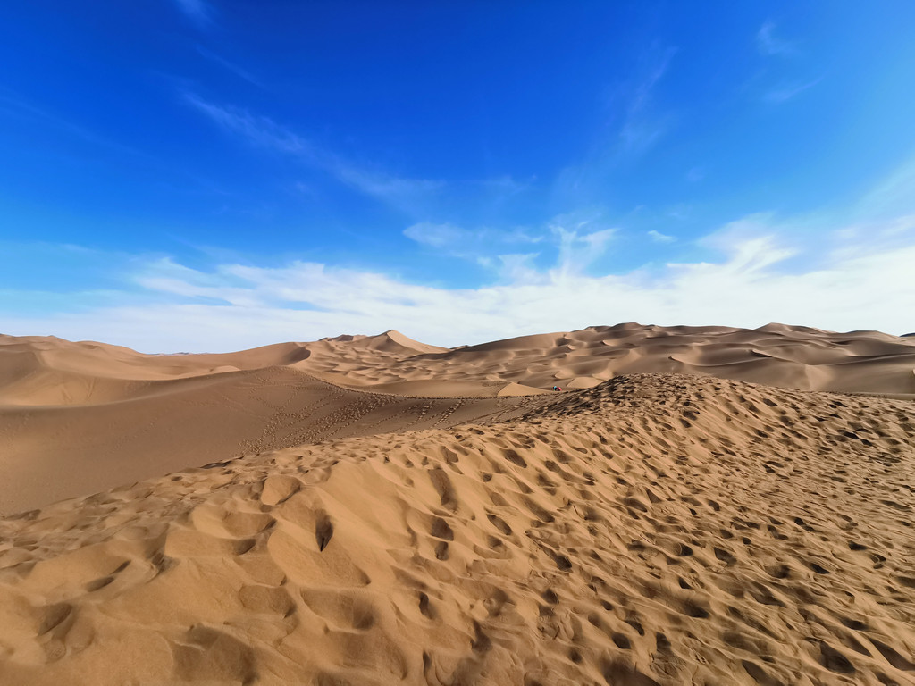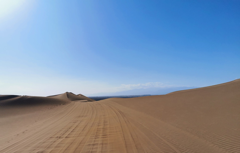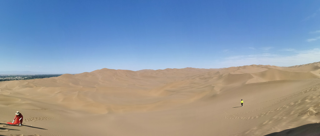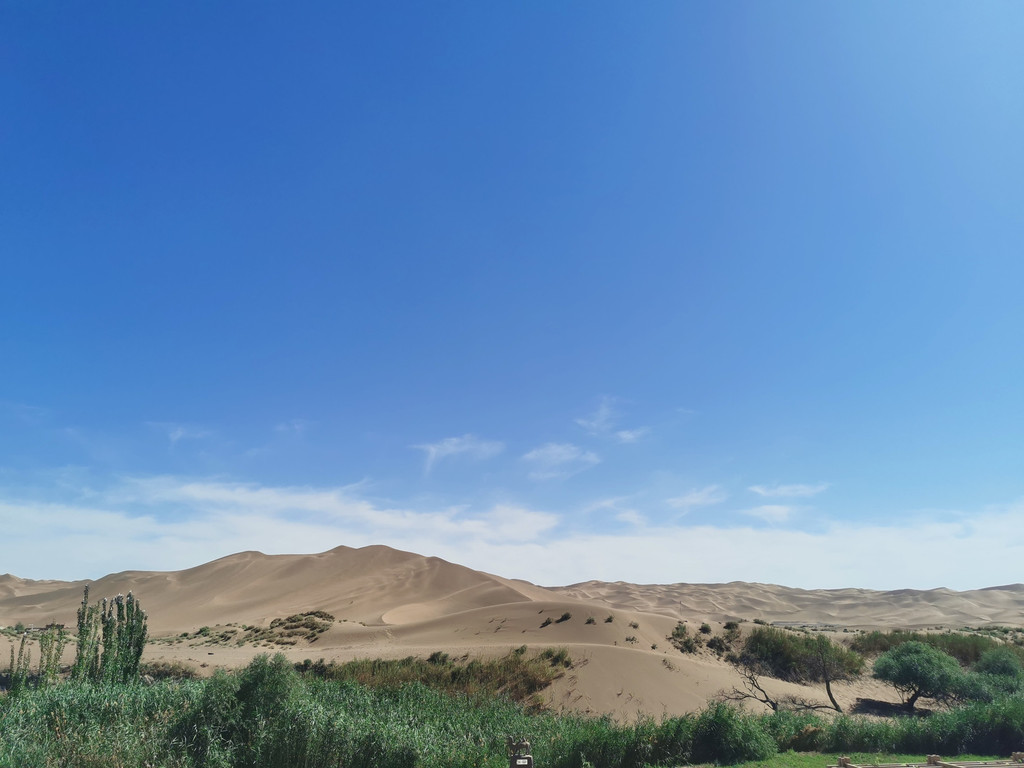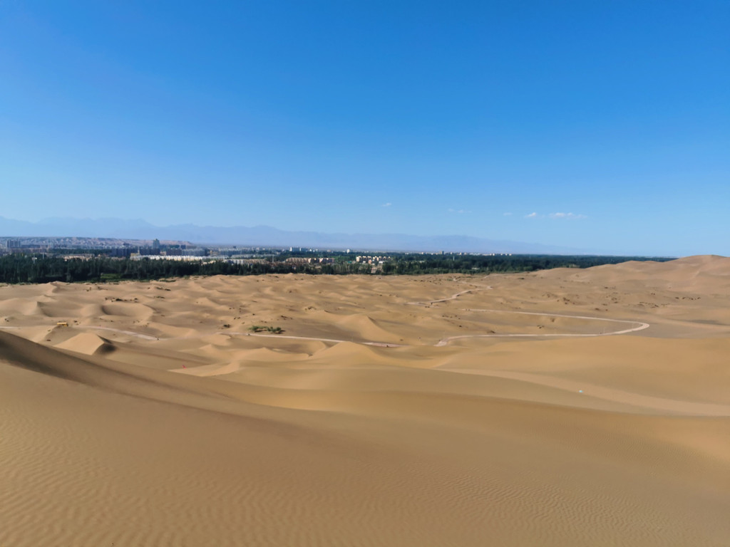登上金灿灿的沙山极目远望,只见黄沙漫漫,沙岭连绵,与天相连,给人一种辽阔、壮丽、肃穆、深邃的感觉。站在绿洲与大漠的结合处,观赏四方风景,眼前奇异的景致让人惊叹万分:一边是莽莽苍苍、雄浑博大、无边无际的大漠海洋;一边是郁郁葱葱、娟秀妩媚的绿洲碧野。这是大自然杰出的造化,这黄色与绿色之间没有任何过渡,两色却形成鲜明的对比,宛如画家手下的色盘,黄绿分明、对比强烈而又和谐统一,令人叫绝。库木塔格沙漠也是世界上少有的与城市零距离接触的沙漠,是与天池、博斯腾湖并列的新疆3处国家重点风景名胜区之一,以风沙地貌类型齐全、沙丘的轮廓清晰、层次分明为风景特征。