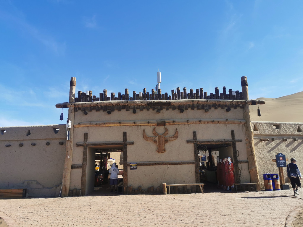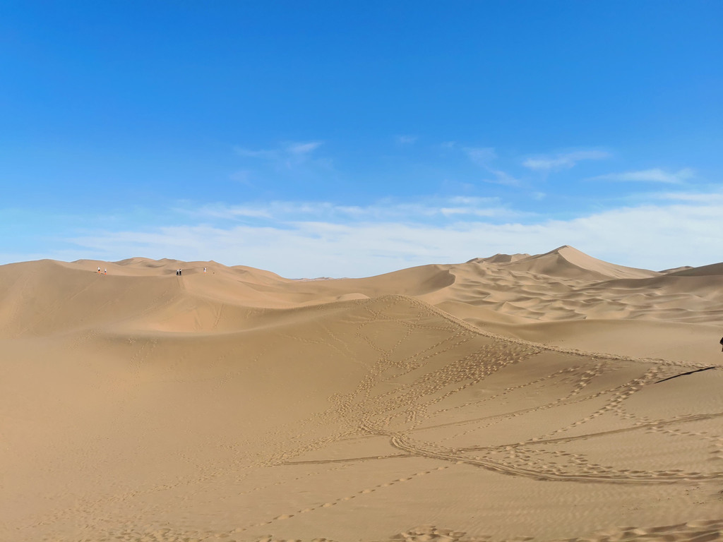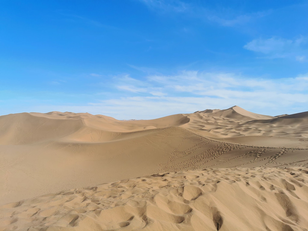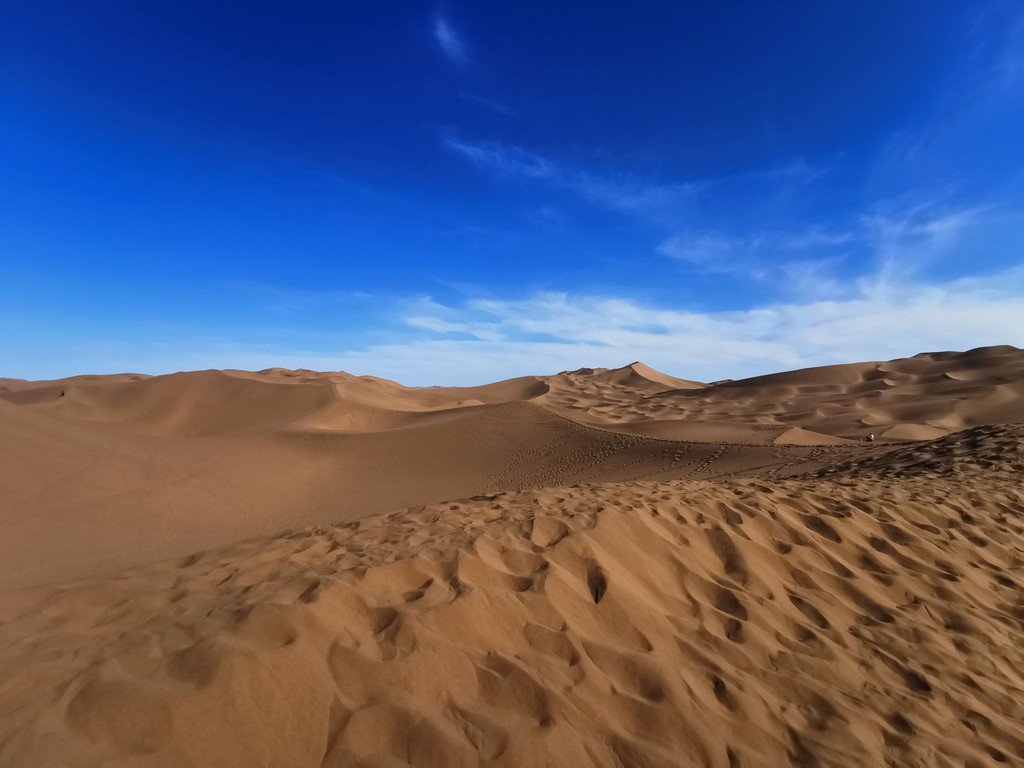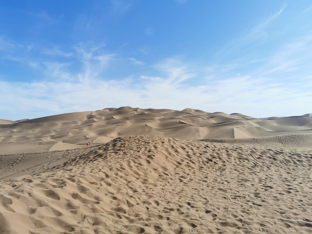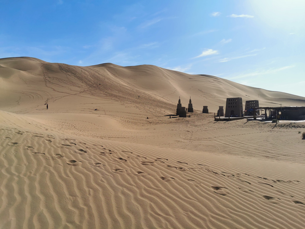 登上金灿灿的沙山极目远望,只见黄沙漫漫,沙岭连绵,与天相连,给人一种辽阔、壮丽、肃穆、深邃的感觉。站在绿洲与大漠的结合处,观赏四方风景,眼前奇异的景致让人惊叹万分:一边是莽莽苍苍、雄浑博大、无边无际的大漠海洋;一边是郁郁葱葱、娟秀妩媚的绿洲碧野。这是大自然杰出的造化,这黄色与绿色之间没有任何过渡,两色却形成鲜明的对比,宛如画家手下的色盘,黄绿分明、对比强烈而又和谐统一,令人叫绝。库木塔格沙漠也是世界上少有的与城市零距离接触的沙漠,是与天池、博斯腾湖并列的新疆3处国家重点风景名胜区之一,以风沙地貌类型齐全、沙丘的轮廓清晰、层次分明为风景特征。