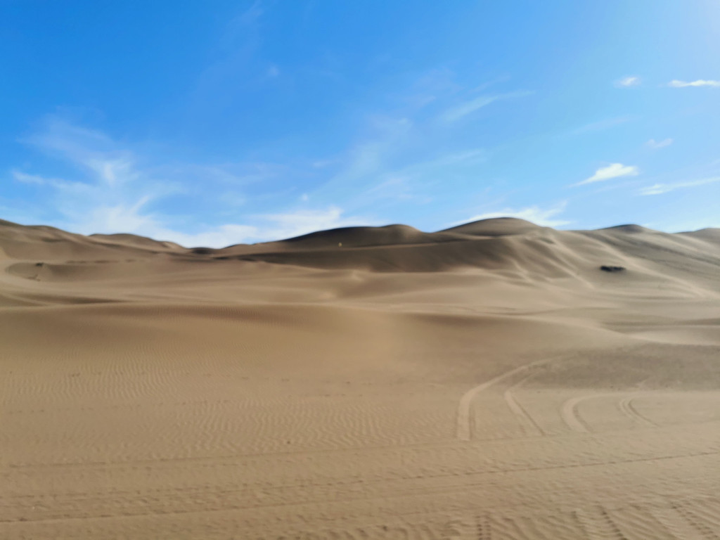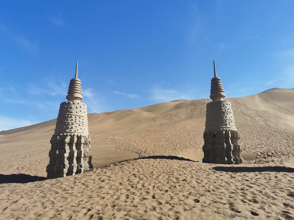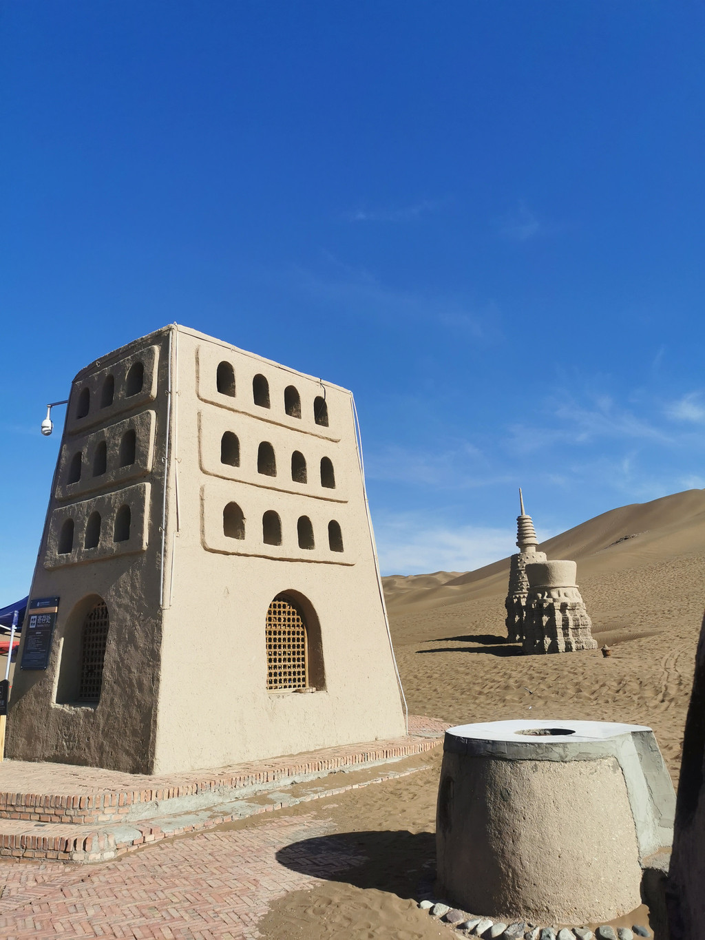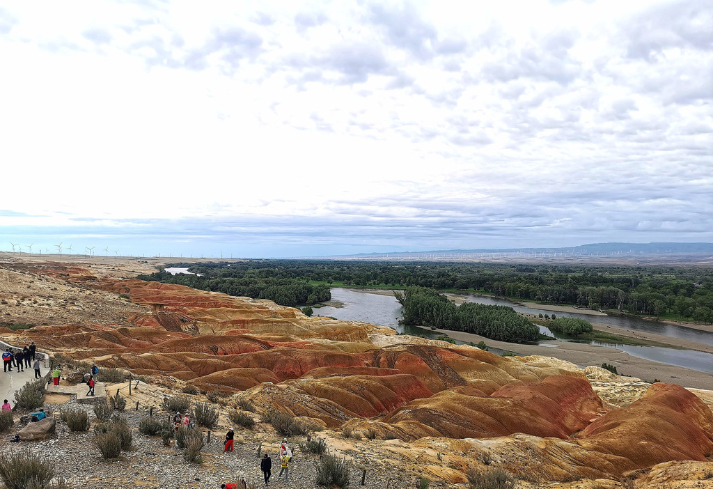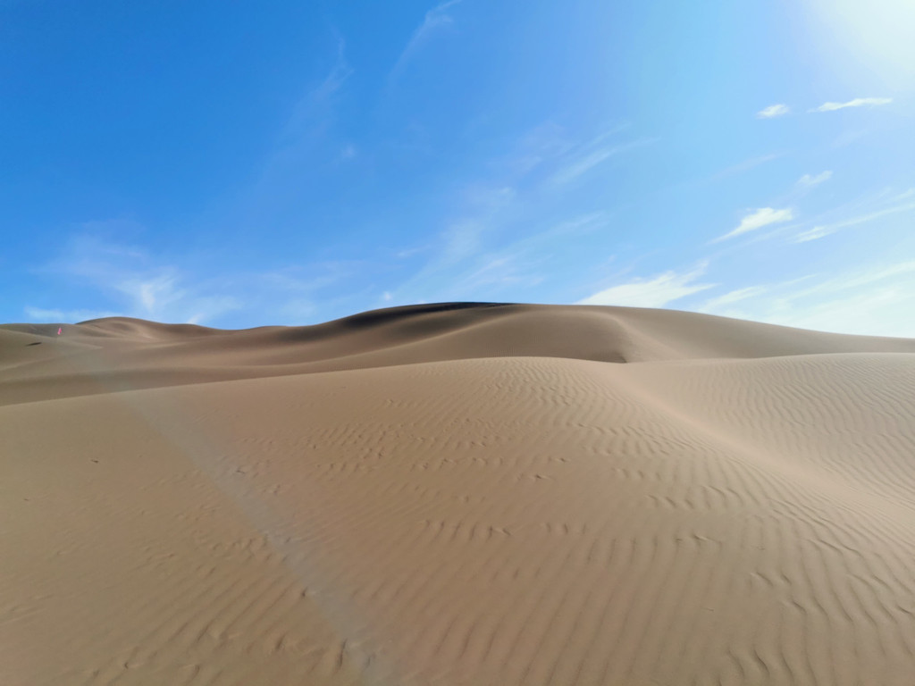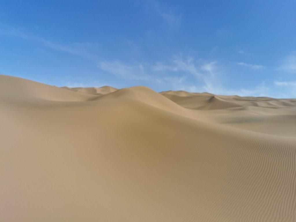 登上金灿灿的沙山极目远望,只见黄沙漫漫,沙岭连绵,与天相连,给人一种辽阔、壮丽、肃穆、深邃的感觉。站在绿洲与大漠的结合处,观赏四方风景,眼前奇异的景致让人惊叹万分:一边是莽莽苍苍、雄浑博大、无边无际的大漠海洋;一边是郁郁葱葱、娟秀妩媚的绿洲碧野。这是大自然杰出的造化,这黄色与绿色之间没有任何过渡,两色却形成鲜明的对比,宛如画家手下的色盘,黄绿分明、对比强烈而又和谐统一,令人叫绝。库木塔格沙漠也是世界上少有的与城市零距离接触的沙漠,是与天池、博斯腾湖并列的新疆3处国家重点风景名胜区之一,以风沙地貌类型齐全、沙丘的轮廓清晰、层次分明为风景特征。