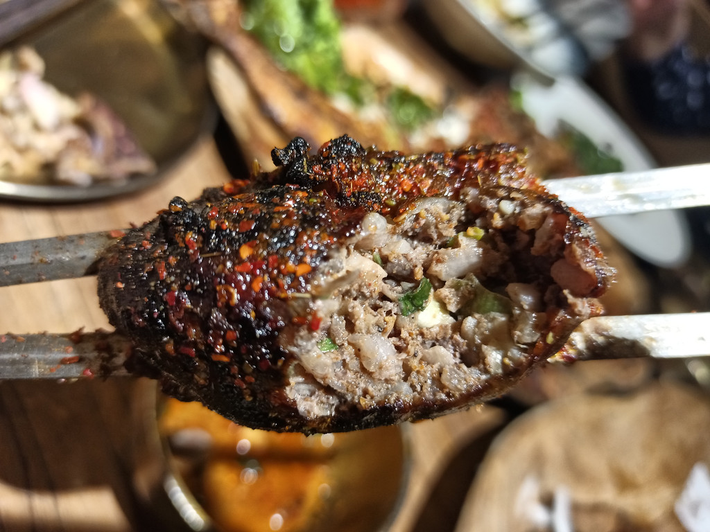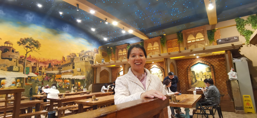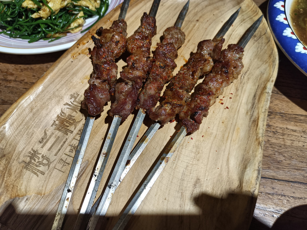 在机上好不容易熬过了五个多小时,飞机终于在乌鲁木齐机场落地,在出发前老板联系了在乌鲁木齐的闺蜜,此时她已先期到了我们下榻的昌吉市凯森酒店等候,待办好入住手续后就开车载着我们到乌鲁木齐市区而去,路途经过八楼地铁站,才明白了刀郎那一首脍炙人口“2002年的第一场雪”里的停在八楼的2路汽车歌词,原来是这么一回事。车子一路经过八楼一路来到七道湾附近的楼兰秘烤餐厅,朋友说到了乌鲁木齐,要吃一顿正经的新疆烤肉,必须到这家乌市网红店,这是乌市烧烤招牌店,虽然位置不在市中心,但还是要来一试。