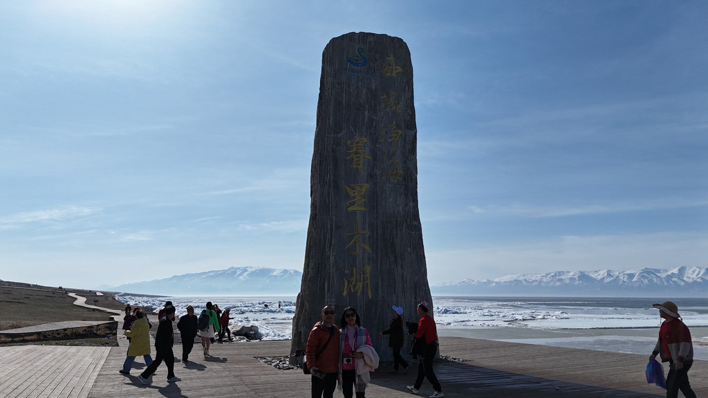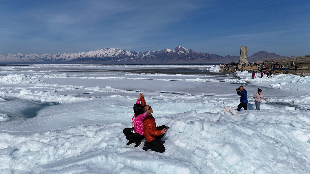 在赛里木湖进入冰封初期的时候,流动的湖水将冻结的薄冰不断地挤向岸边,大家游玩时甚至能听到冰块相互碰撞而发出的咔咔声,而这就是所谓的“冰推现象”。深冬时节,在湖面冰层上游玩时可看见来自湖水深处迸发的水珠冻结在向上翻腾中的一瞬,留下罕见的气泡冰与蓝冰。