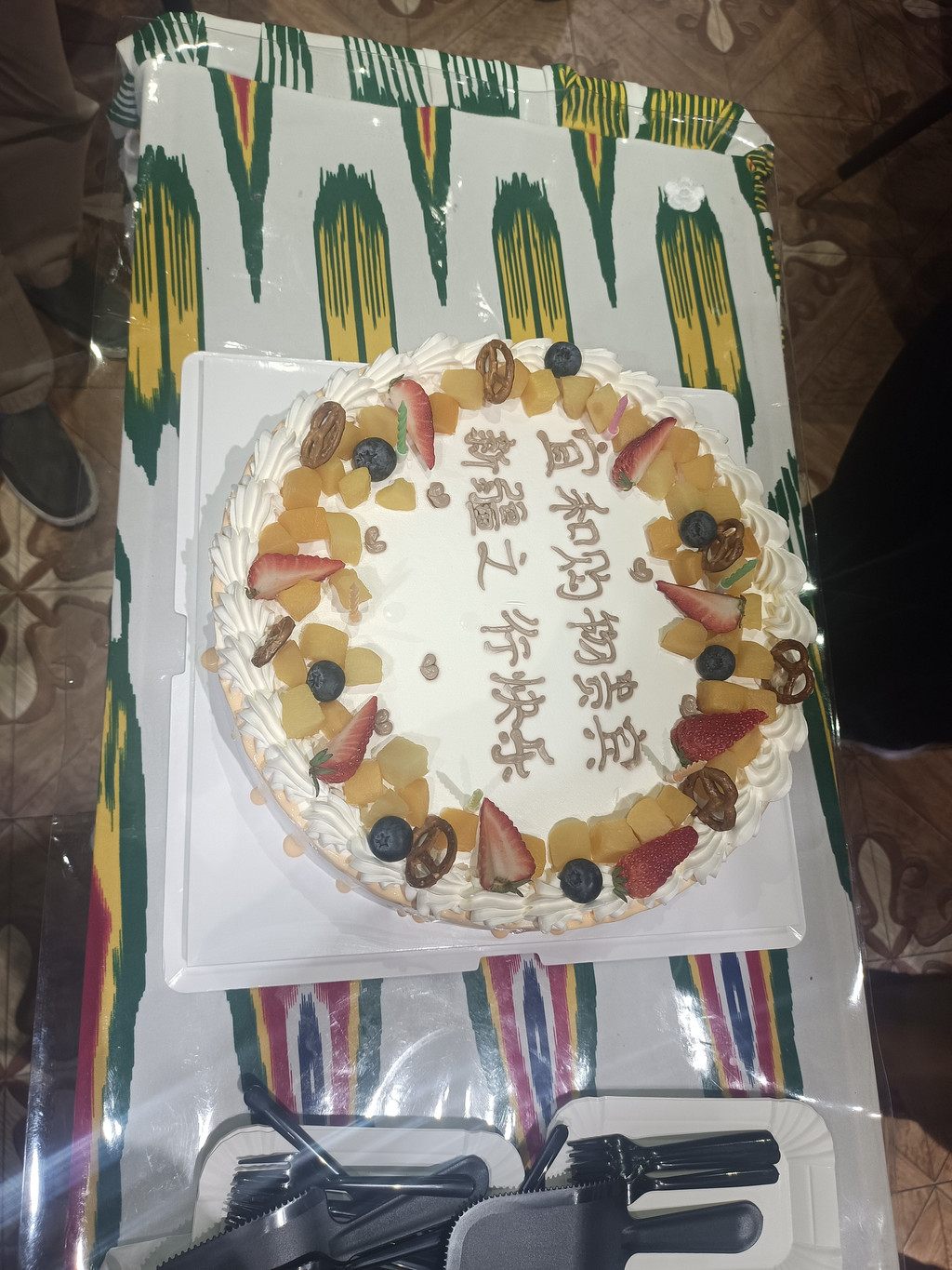 在这几天的行程中,疆域辽阔的新疆所建设的公路都是笔直笔直的,几乎看不到尾,500多公里路途进了2个休息去后,6个小时就到了昌吉市吃饭的餐厅。吃饭吃到一半的时候,一群服务员推着一辆车子做到我们桌前,询问谁是杨XX、赖XX等人,待确认是我们后,便揭开盖子,露出一个生日蛋糕来,令我们一行惊叫不断,这时领队走到我们三人面前,给我们递上生日帽子,邀请我们走出座位,与大家一起为我们献上了生日祝福的歌儿,令我们三人深深地感动。