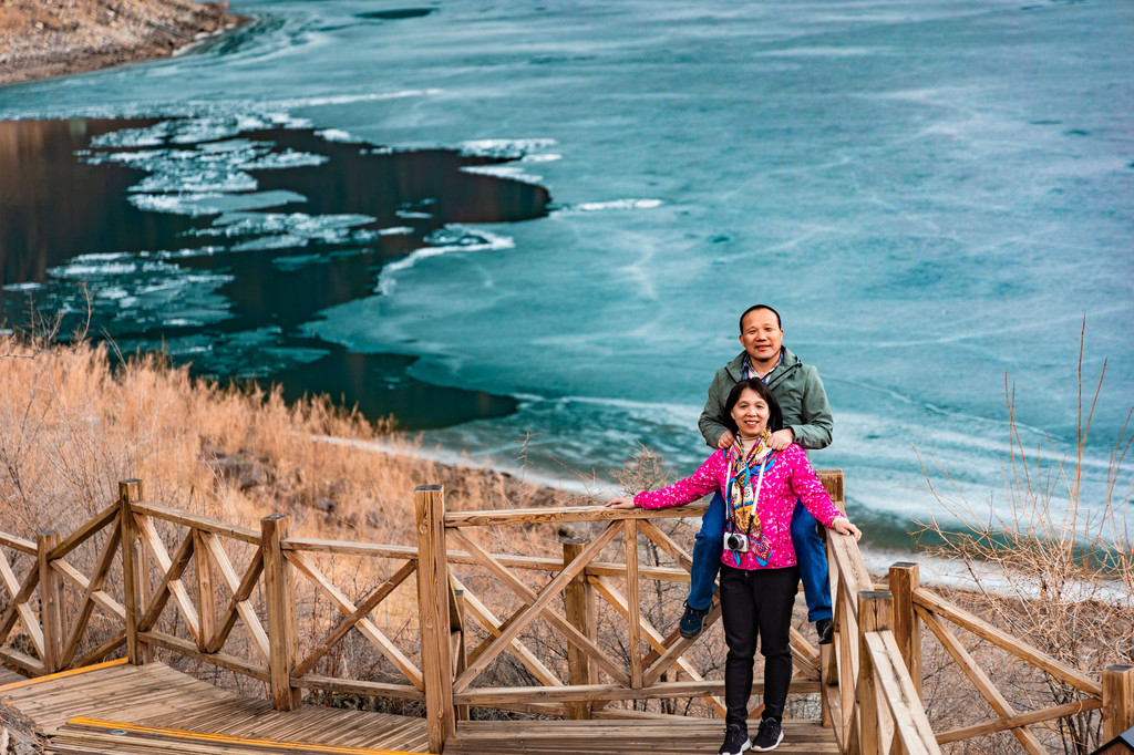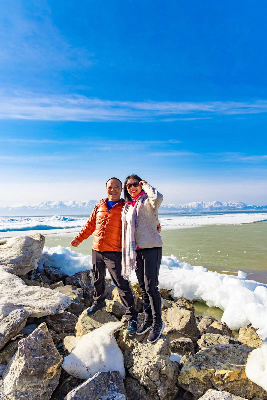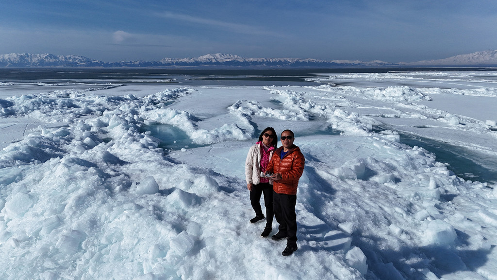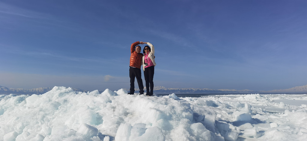 4月中旬虽然湖面仍然是冰封状态,但冰下面层已开始融化,所以我们无法进入湖面观看气泡冰和蓝冰,只好在湖边的冰堆上游玩一下,遥望远处深蓝深蓝的冰面。