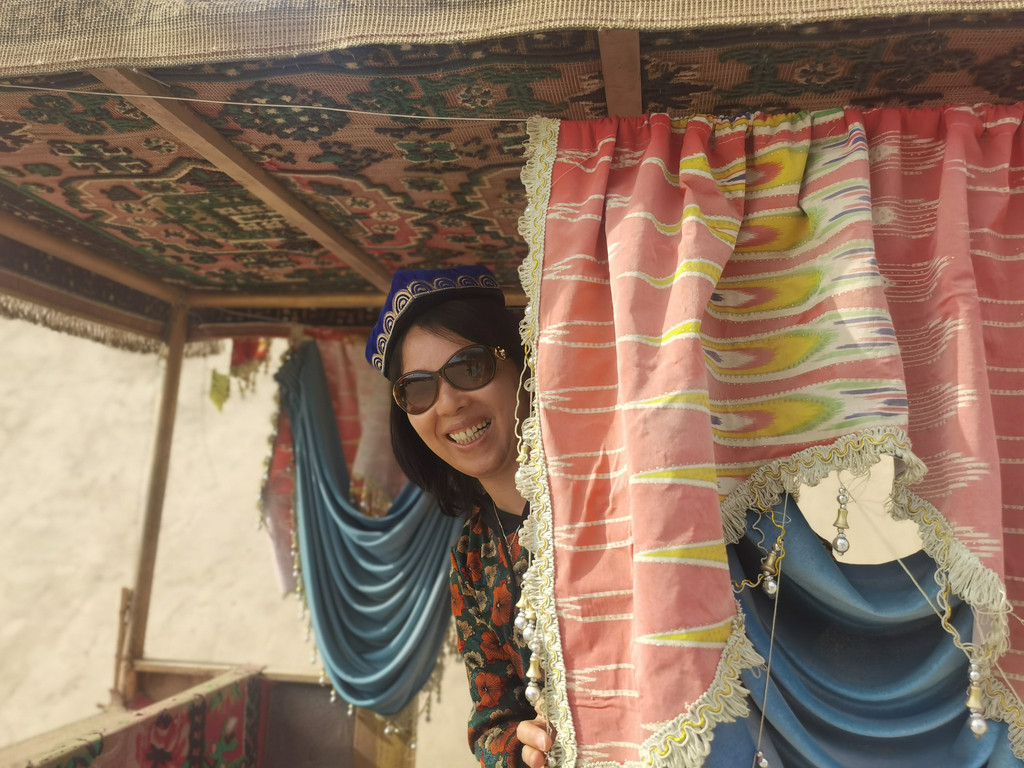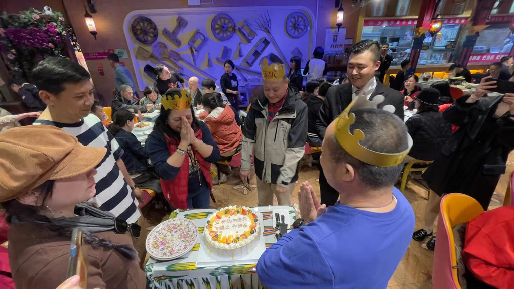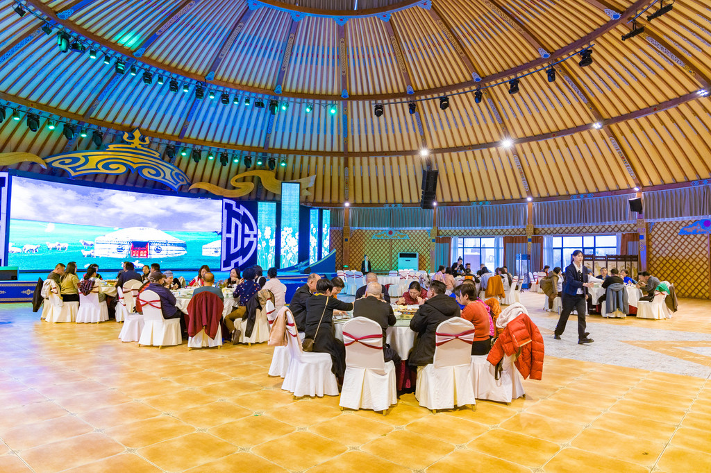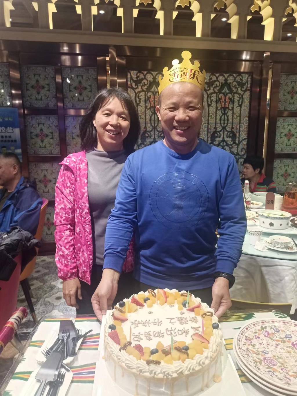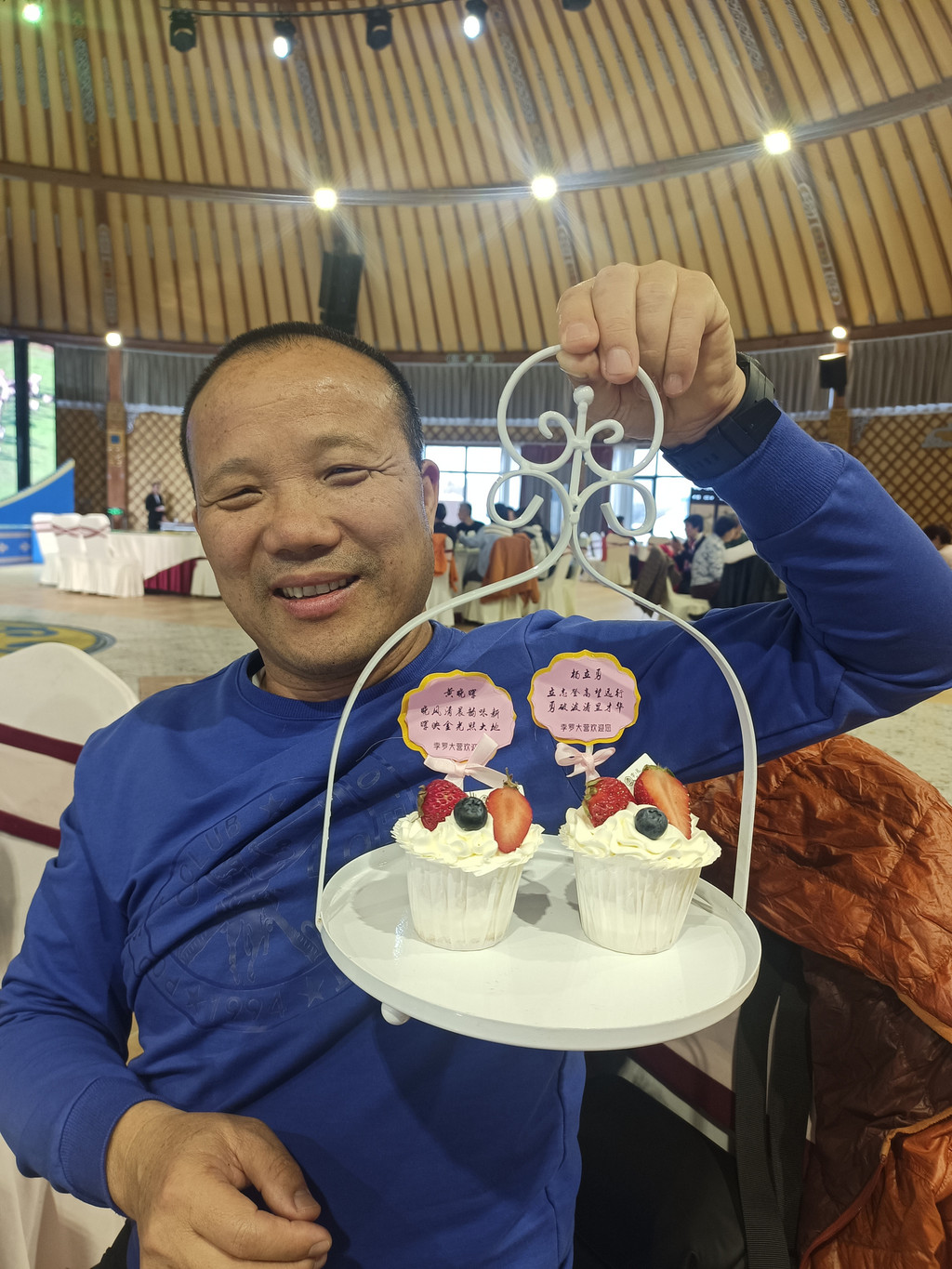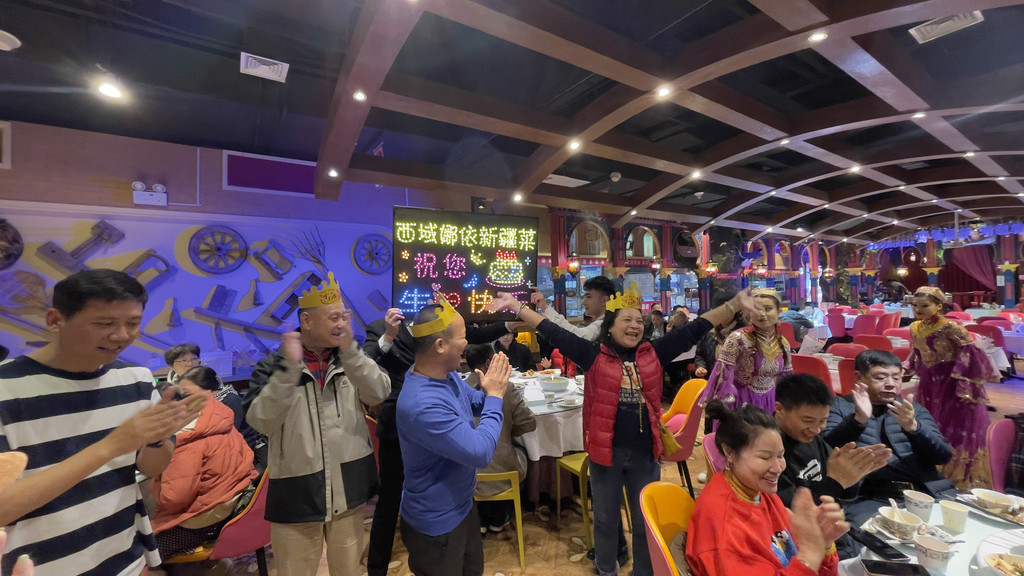 在独山子市区吃过午饭,继续坐车3个多小时前行到达博乐市下榻酒店,在哈萨克族特色餐厅孛罗大营吃晚饭,欣赏当地歌舞表演,大家也收到了一份意外的惊喜,带着藏头诗的小蛋糕,高兴之时大家随着歌声也毫不顾忌地跳起了舞。
