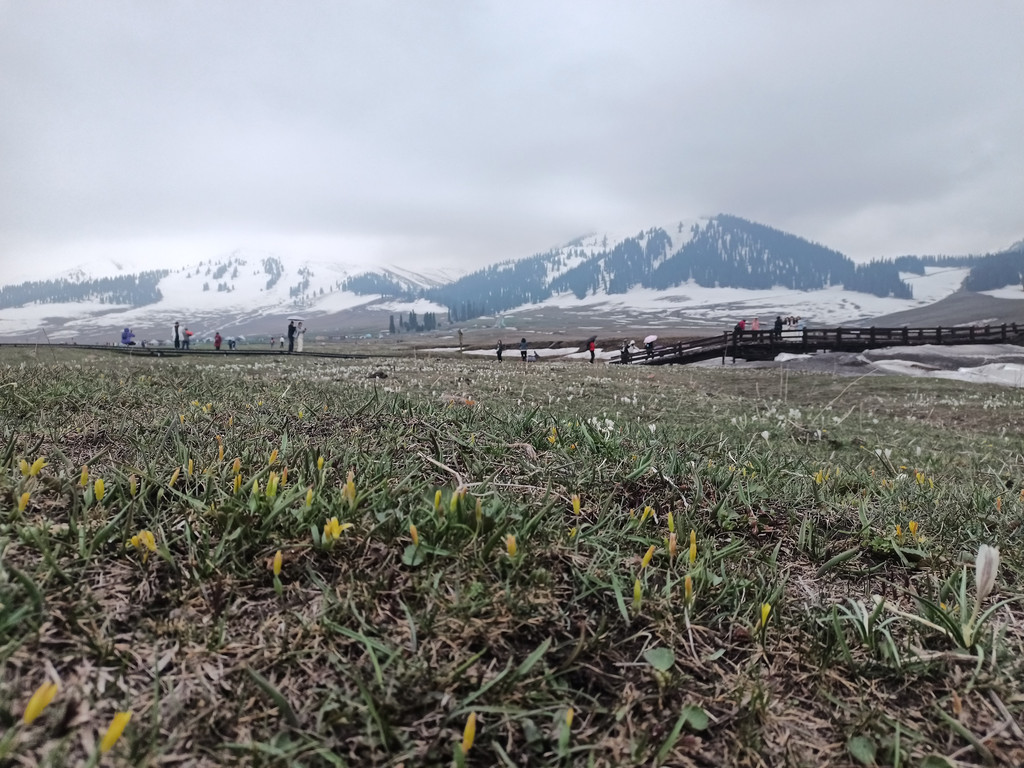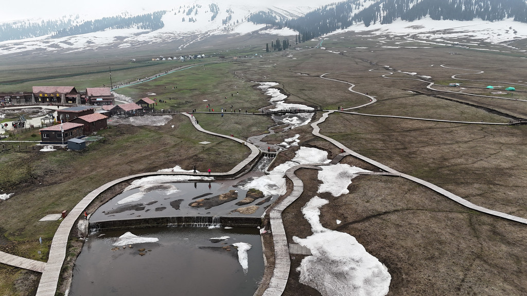 16日9点景区准时开门,我们坐上景区交通车,踏上尚未完全转绿的那拉提大草原。那拉提在蒙古语是“太阳”的意思。在那拉提绿色的原野上,有雪山、有坡地、有森林。从高空俯视空中草原的全景,感觉就像一幅用绿色渲染的中国画,平铺在地上。草原上的房子、羊群、人都绘声绘色点缀着这幅画面。